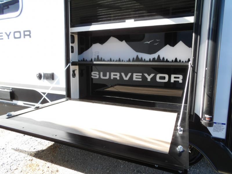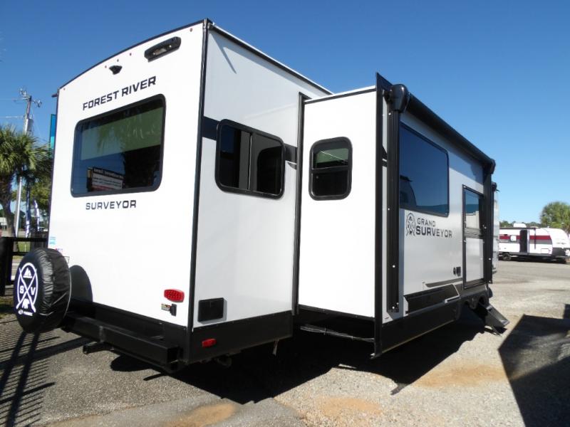 With any Grand Surveyor travel trailer by Forest River you will enjoy turn-key ready-to-go features and quality construction! Each model includes Azdel composite walls and a gel coated fiberglass front cap with an automotive style tinted windshield for a sleek look. There are friction hinge black glass entry door(s), an adjustable platform step with a night light, plus Goodyear tires and a power tongue jack for easy towing. The interior will have you feeling right at home with roller shades, residential faucets, sinks, and bathroom vanity, plus Surf(x) seamless countertops throughout. You can also plan for adventure with a 2" rear accessory and exterior spray port, and there are slam latch exterior baggage doors throughout to keep all your gear secure. Other stand-out features include a central vacuum system, a 200 watt solar panel with a 30 amp controller, a tankless water heater, carpet-free interiors, and the list goes on!