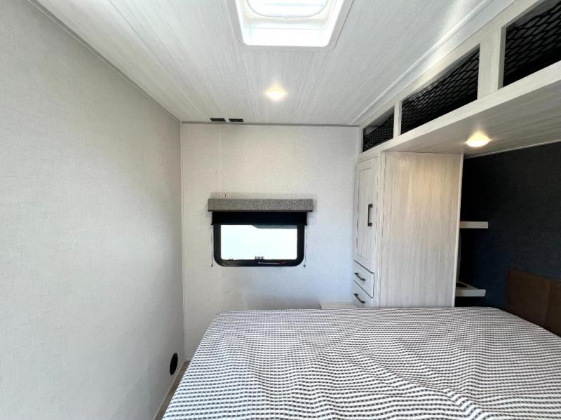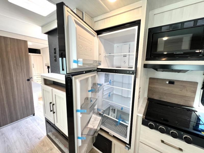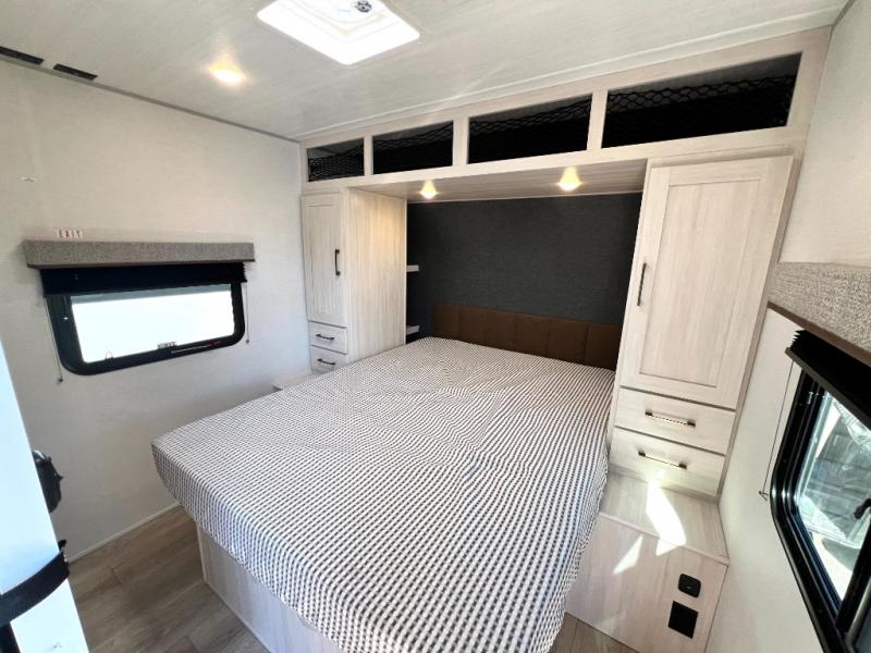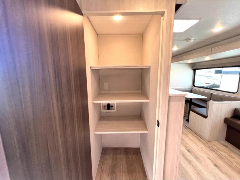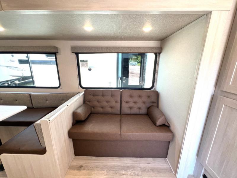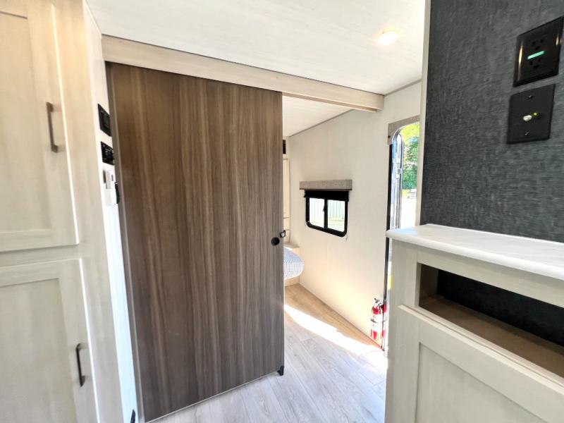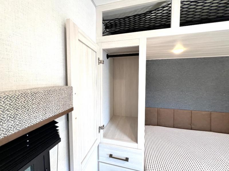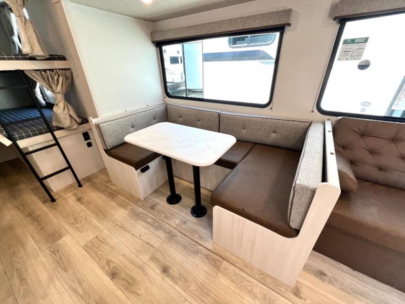 Head to your favorite camping spot with your favorite people in this spacious, dual entry travel trailer! The large slide out houses the U-shaped dinette and sofa where you can relax in the evenings and even let guests sleep over who haven't claimed the double-size bunks. A full bath with its own exterior entry door is convenient for all, and the full kitchen lets you whip up your best meals in the microwave with an air fryer. There is also a walk-in pantry with washer and dryer prep, which gives you the option to add those appliances. When it's time to call it a night, the front private bedroom with a queen bed will provide you with your own space to retreat to, and there are dual bedside wardrobes to keep your clothes organized.