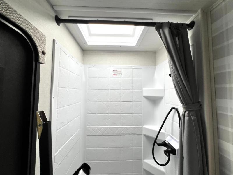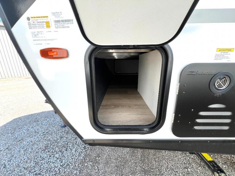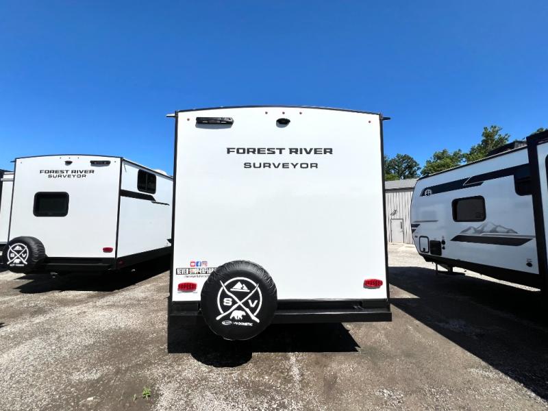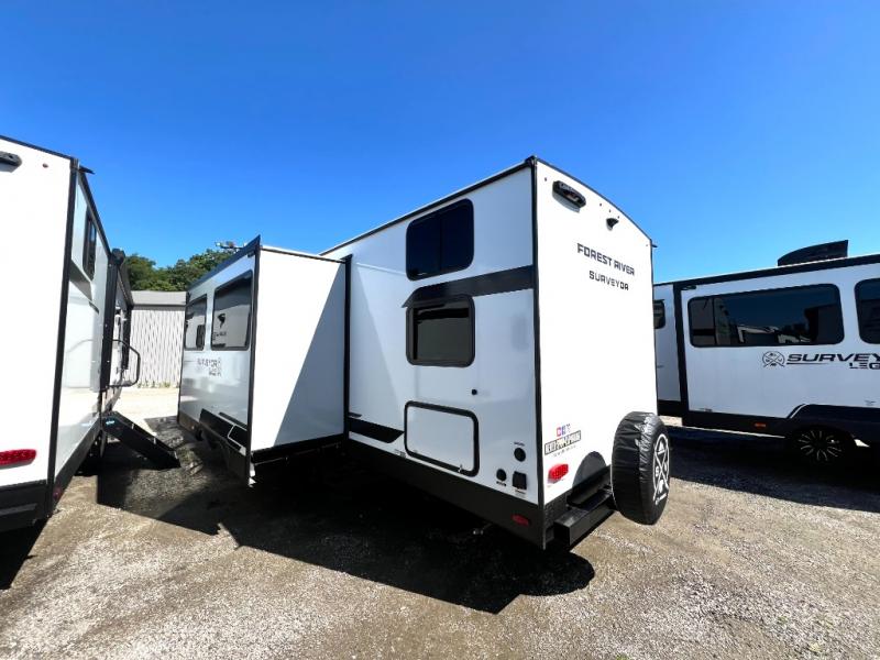 Value and versatility go hand-in-hand with the Surveyor Camp Series travel trailers by Forest River. The solid construction includes a 2" aluminum framed floor with block foam insulation and a sealed underbelly with forced heat and radiant foil insulation. A 100-watt roof mounted solar panel will provide some off-grid power, and the power tongue jack will let you easily hitch up and go whenever you're ready. Additional stand-out features include Surf(X) seamless countertops throughout, two A/C units, an electric awning with LED light strip, black glass friction hinge entry door(s), and so much more!