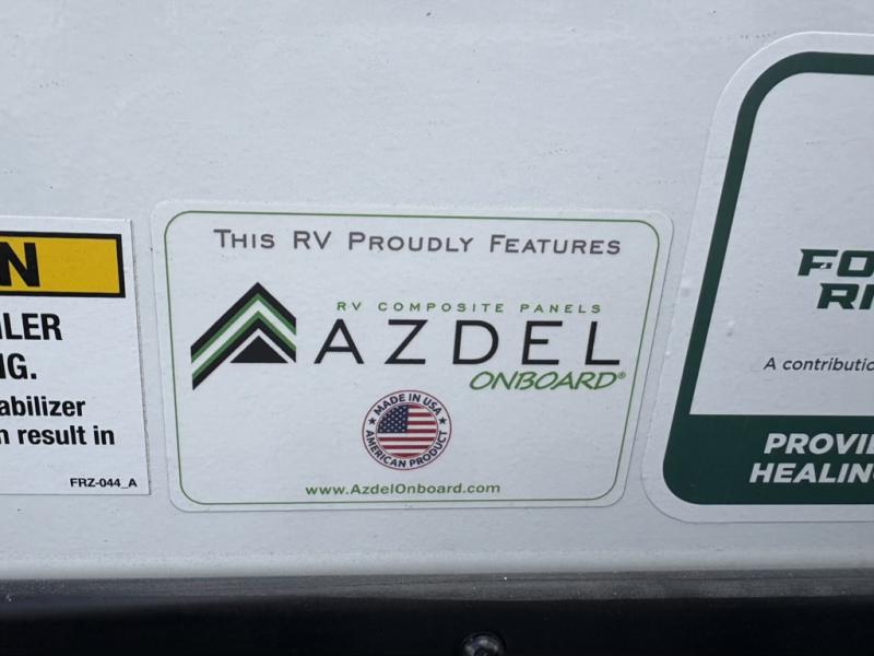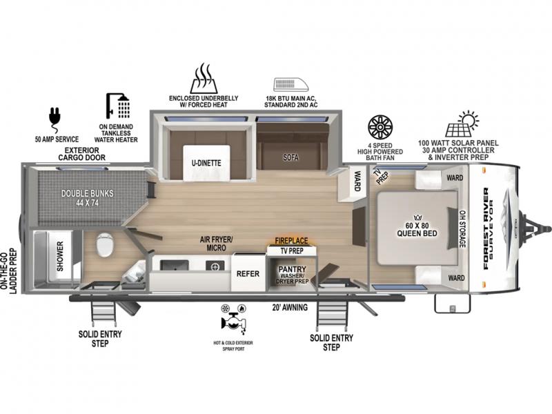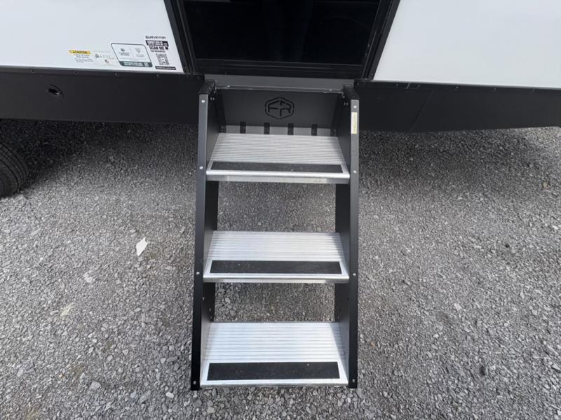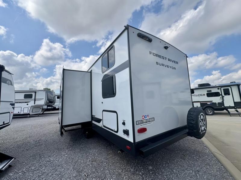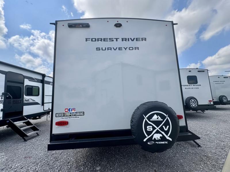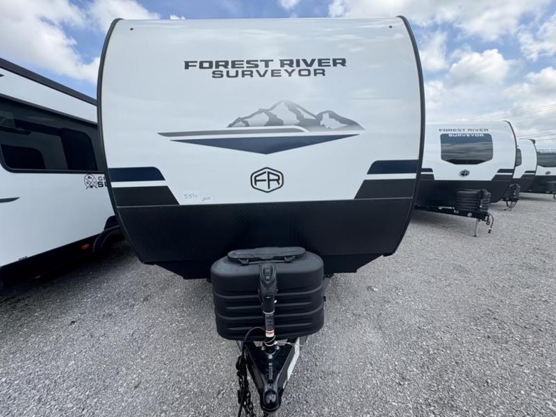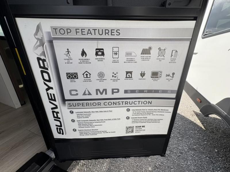 Value and versatility go hand-in-hand with the Surveyor Camp Series travel trailers by Forest River. The solid construction includes a 2" aluminum framed floor with block foam insulation and a sealed underbelly with forced heat and radiant foil insulation. A 100-watt roof mounted solar panel will provide some off-grid power, and the power tongue jack will let you easily hitch up and go whenever you're ready. Additional stand-out features include Surf(X) seamless countertops throughout, two A/C units, an electric awning with LED light strip, black glass friction hinge entry door(s), and so much more!