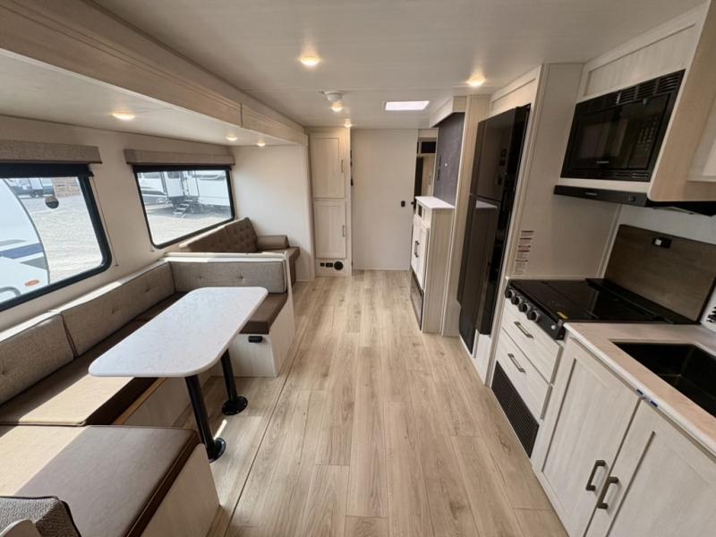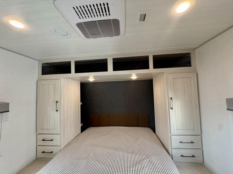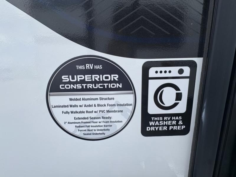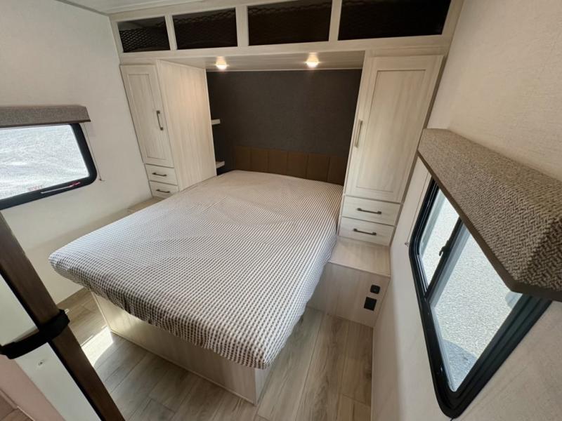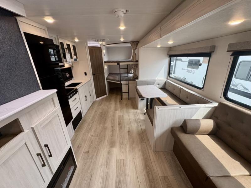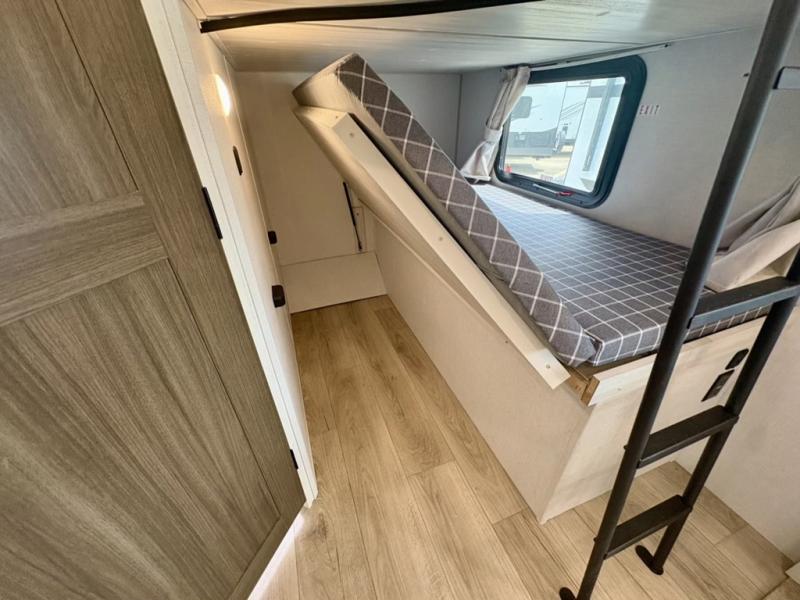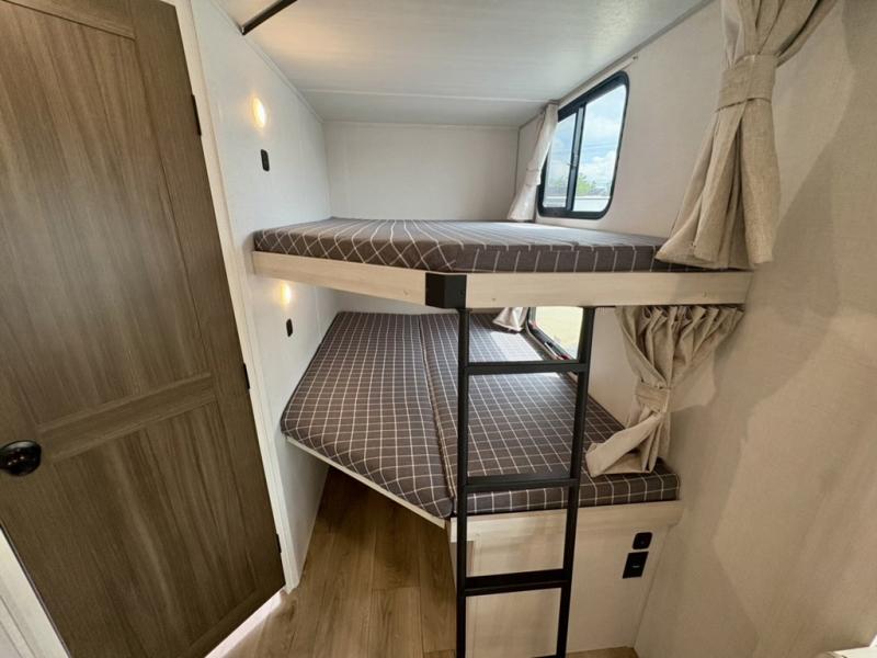 Head to your favorite camping spot with your favorite people in this spacious, dual entry travel trailer! The large slide out houses the U-shaped dinette and sofa where you can relax in the evenings and even let guests sleep over who haven't claimed the double-size bunks. A full bath with its own exterior entry door is convenient for all, and the full kitchen lets you whip up your best meals in the microwave with an air fryer. There is also a walk-in pantry with washer and dryer prep, which gives you the option to add those appliances. When it's time to call it a night, the front private bedroom with a queen bed will provide you with your own space to retreat to, and there are dual bedside wardrobes to keep your clothes organized.