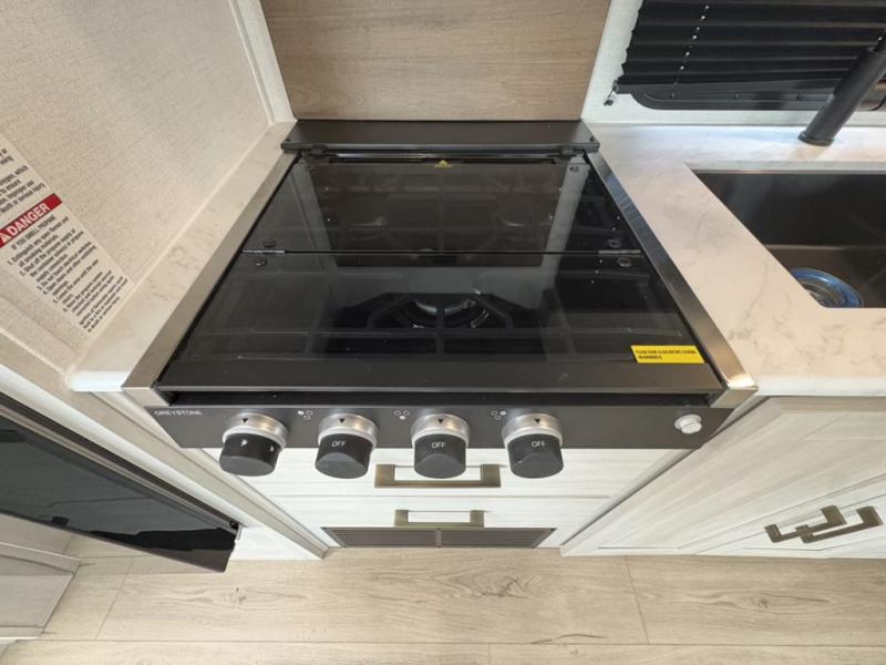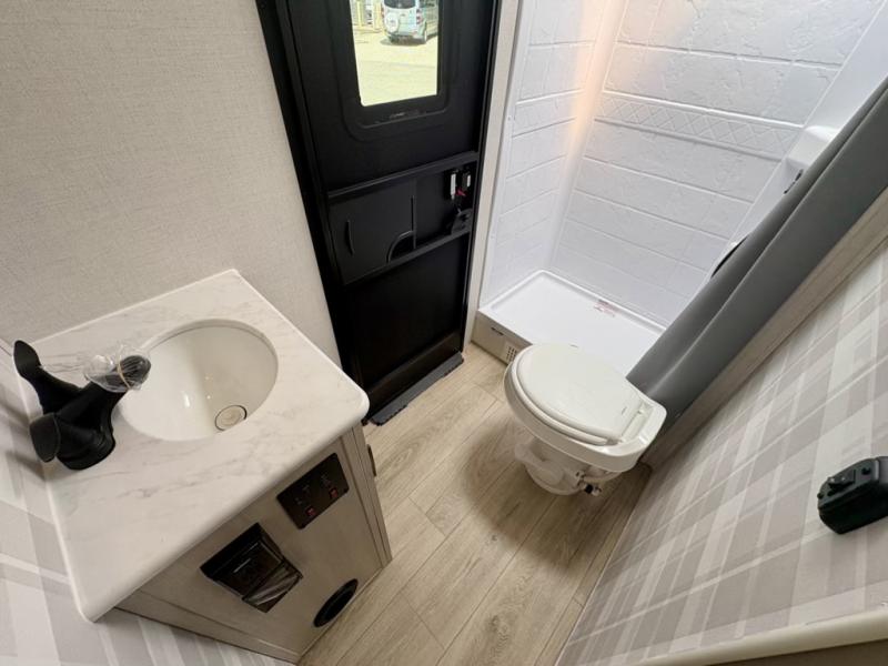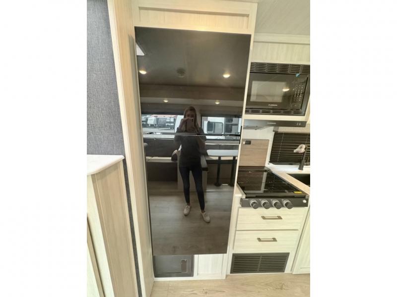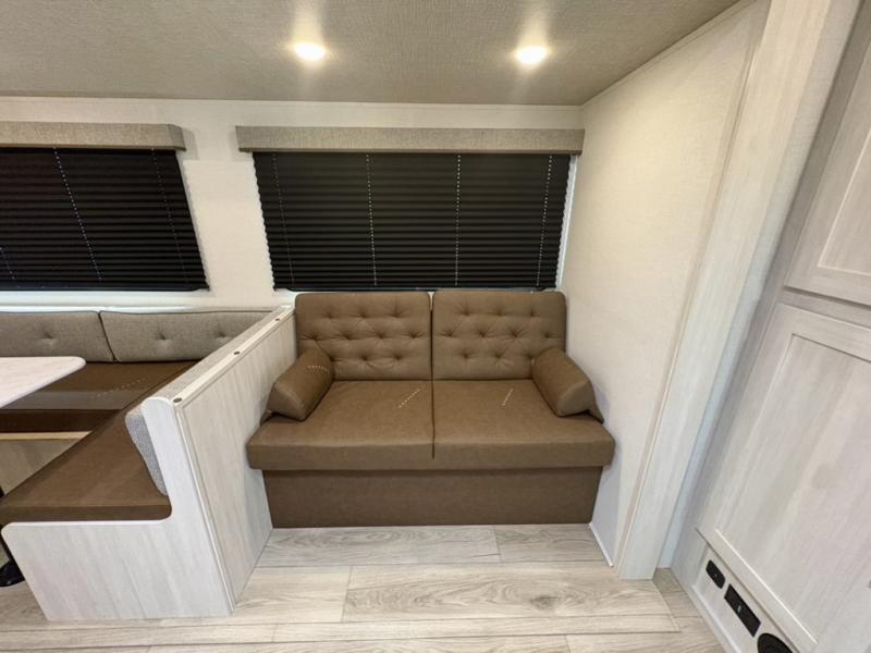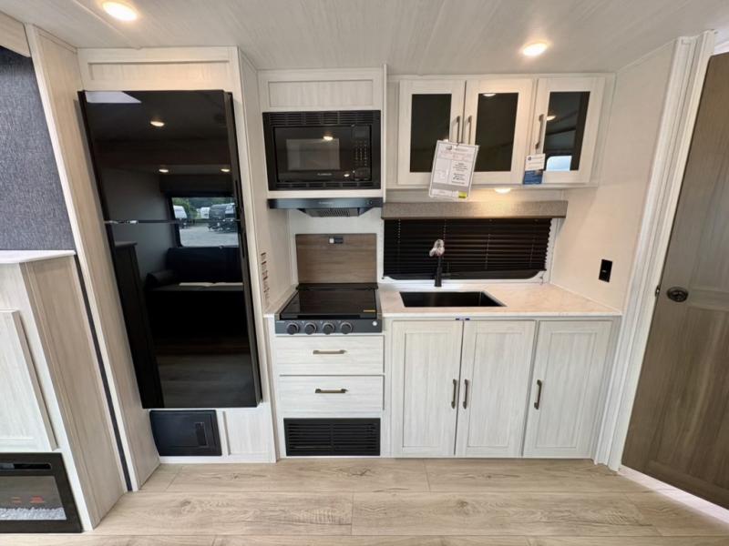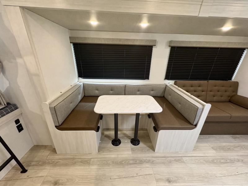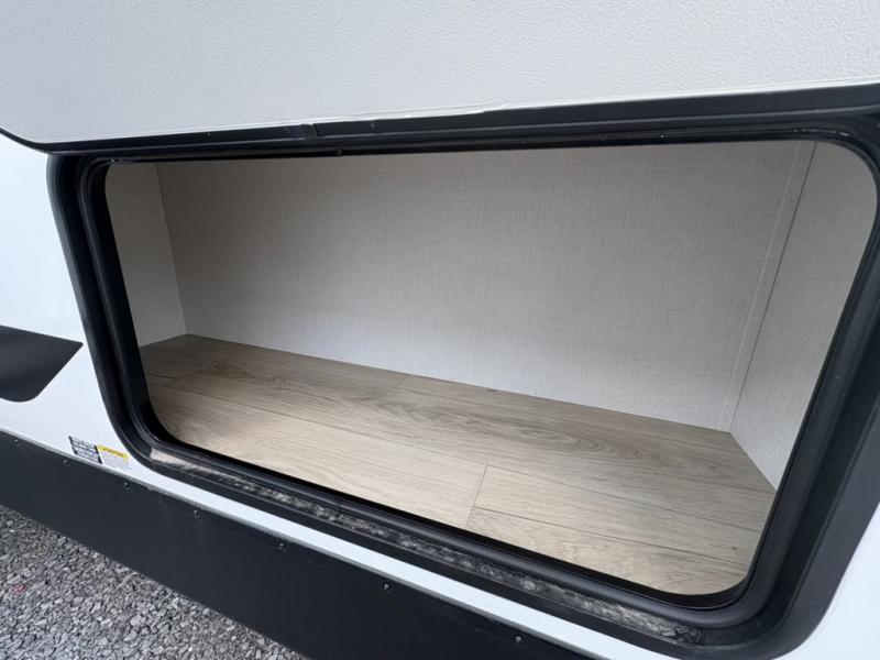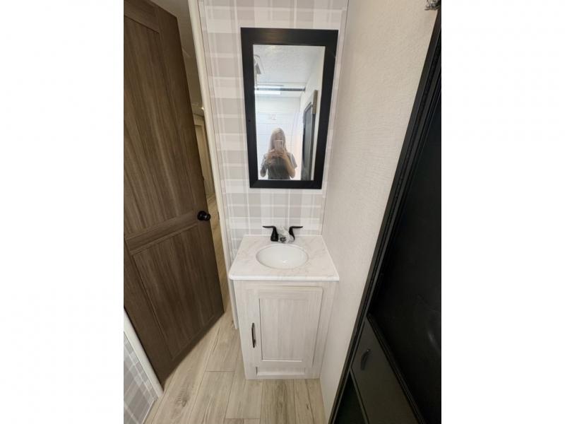 Head to your favorite camping spot with your favorite people in this spacious, dual entry travel trailer! The large slide out houses the U-shaped dinette and sofa where you can relax in the evenings and even let guests sleep over who haven't claimed the double-size bunks. A full bath with its own exterior entry door is convenient for all, and the full kitchen lets you whip up your best meals in the microwave with an air fryer. There is also a walk-in pantry with washer and dryer prep, which gives you the option to add those appliances. When it's time to call it a night, the front private bedroom with a queen bed will provide you with your own space to retreat to, and there are dual bedside wardrobes to keep your clothes organized.