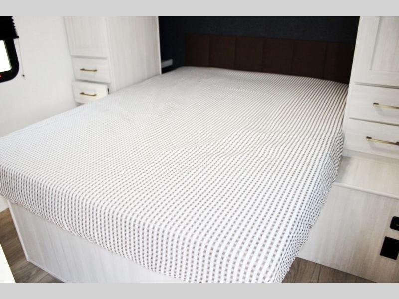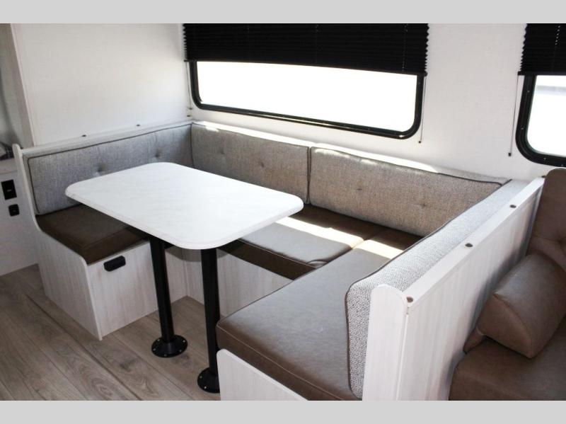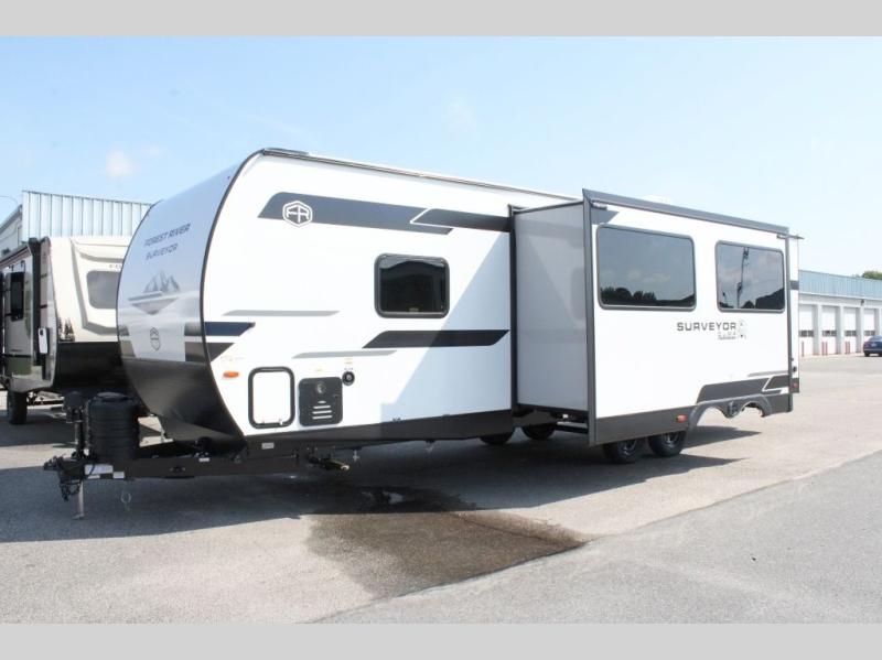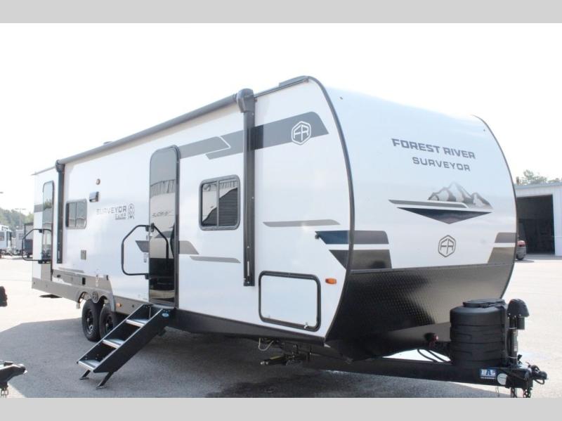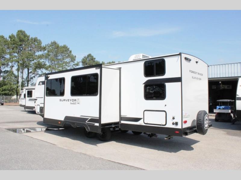 Value and versatility go hand-in-hand with the Surveyor Camp Series travel trailers by Forest River. The solid construction includes a 2" aluminum framed floor with block foam insulation and a sealed underbelly with forced heat and radiant foil insulation. A 100-watt roof mounted solar panel will provide some off-grid power, and the power tongue jack will let you easily hitch up and go whenever you're ready. Additional stand-out features include Surf(X) seamless countertops throughout, two A/C units, an electric awning with LED light strip, black glass friction hinge entry door(s), and so much more!