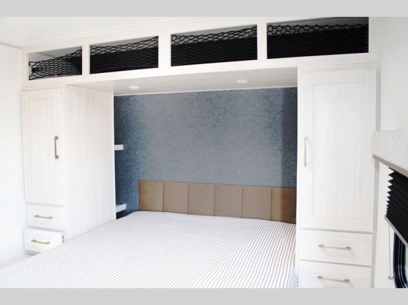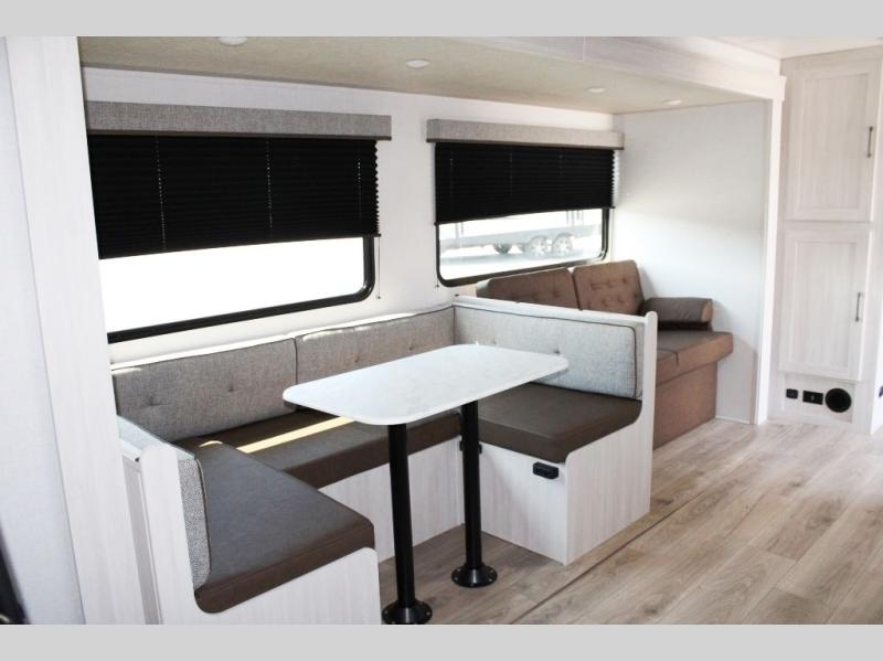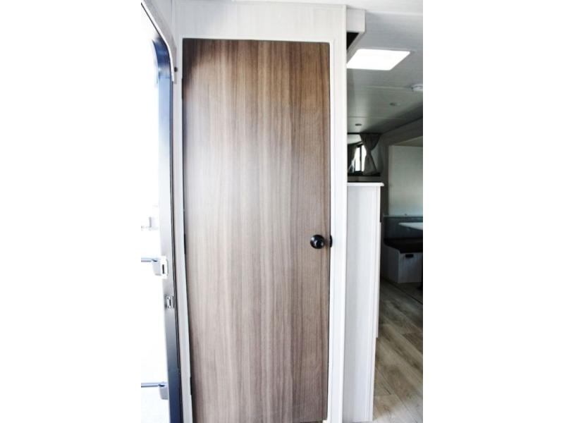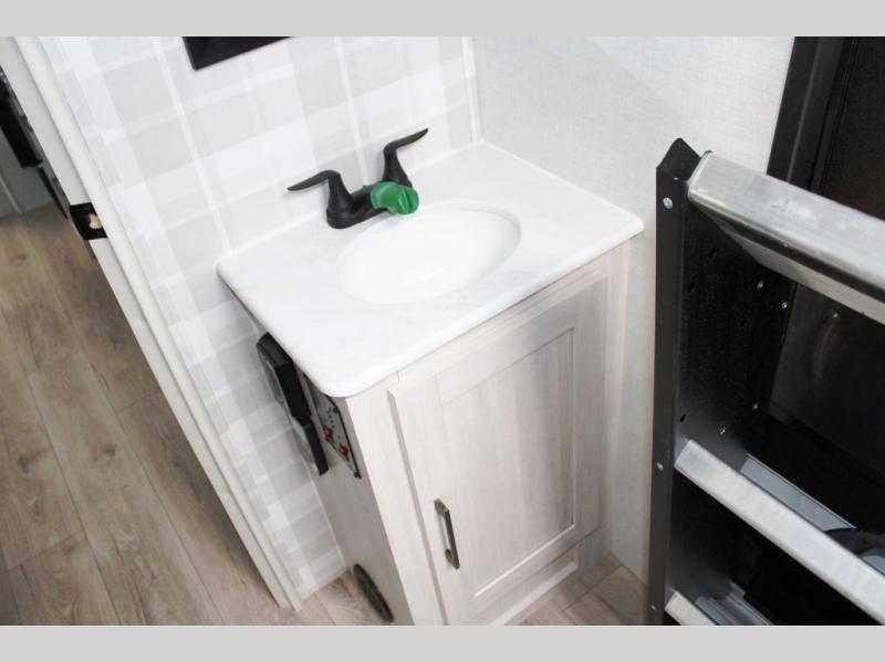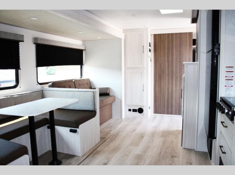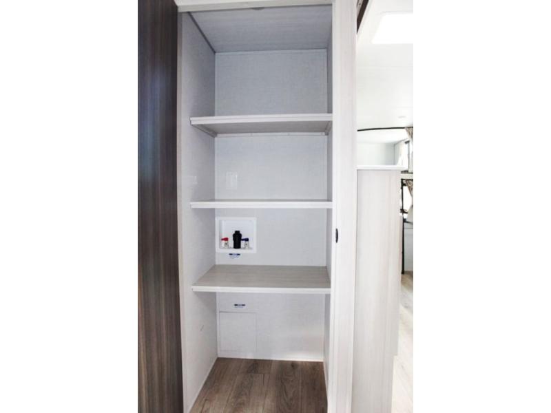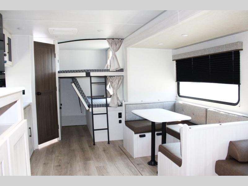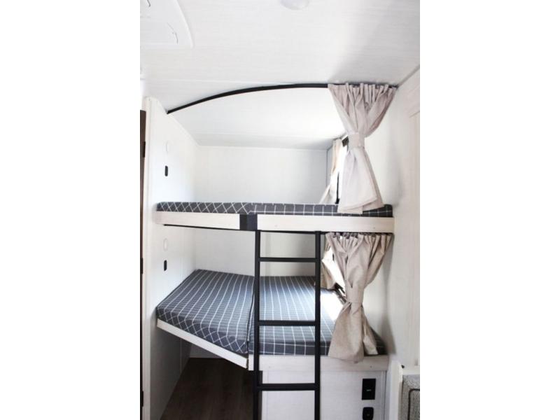 Head to your favorite camping spot with your favorite people in this spacious, dual entry travel trailer! The large slide out houses the U-shaped dinette and sofa where you can relax in the evenings and even let guests sleep over who haven't claimed the double-size bunks. A full bath with its own exterior entry door is convenient for all, and the full kitchen lets you whip up your best meals in the microwave with an air fryer. There is also a walk-in pantry with washer and dryer prep, which gives you the option to add those appliances. When it's time to call it a night, the front private bedroom with a queen bed will provide you with your own space to retreat to, and there are dual bedside wardrobes to keep your clothes organized.
