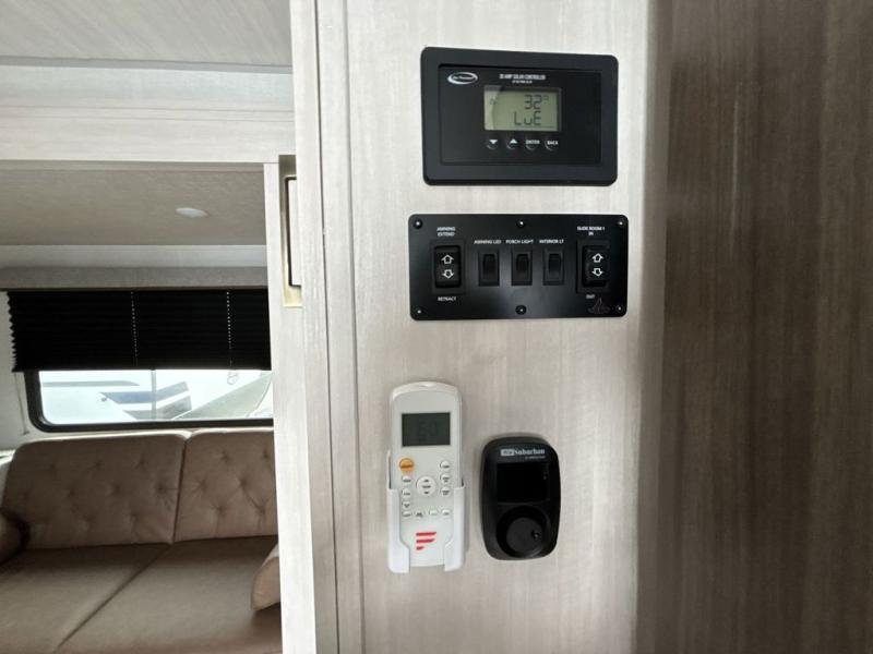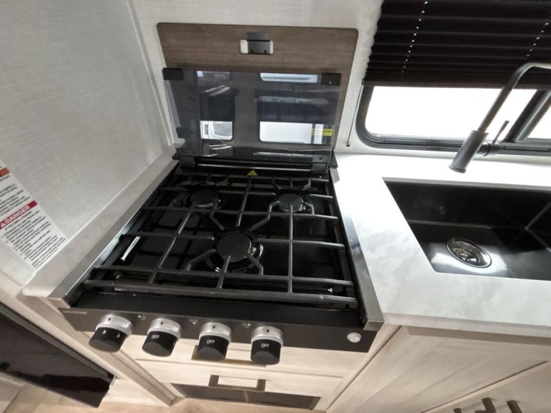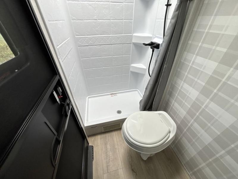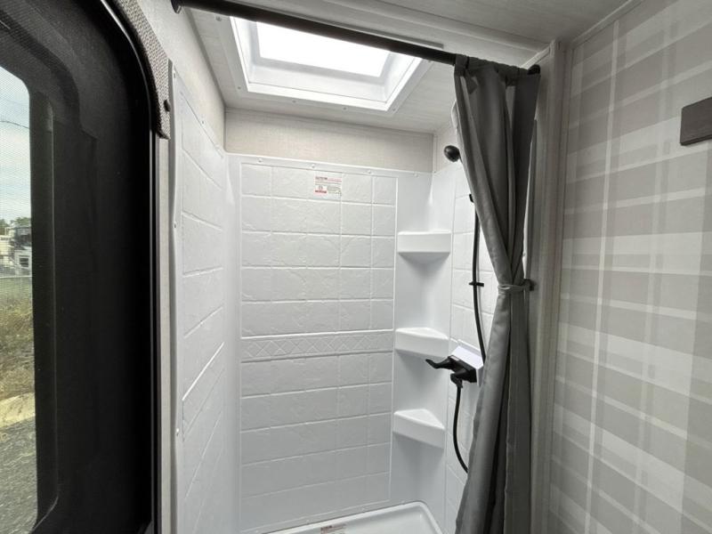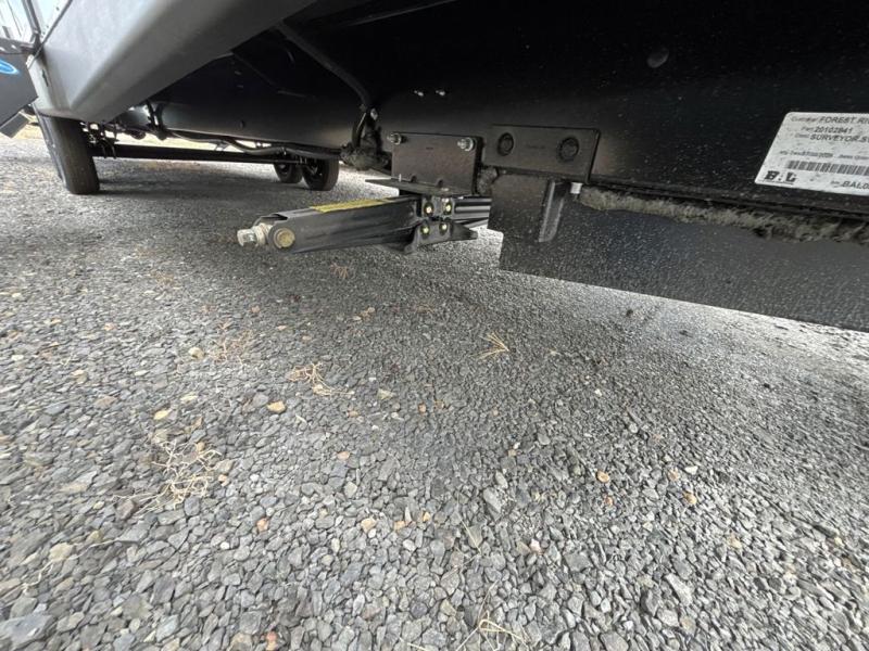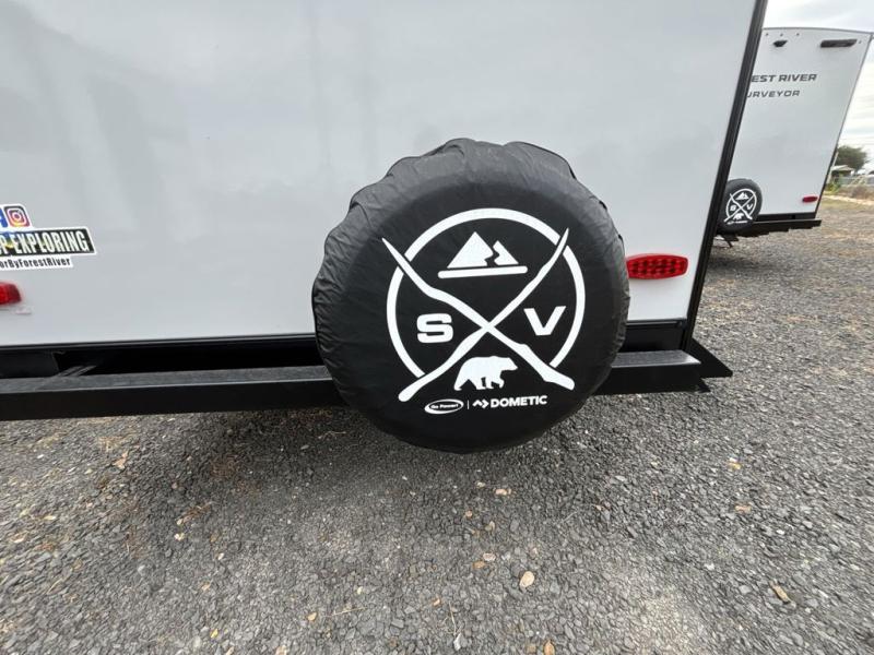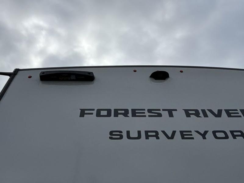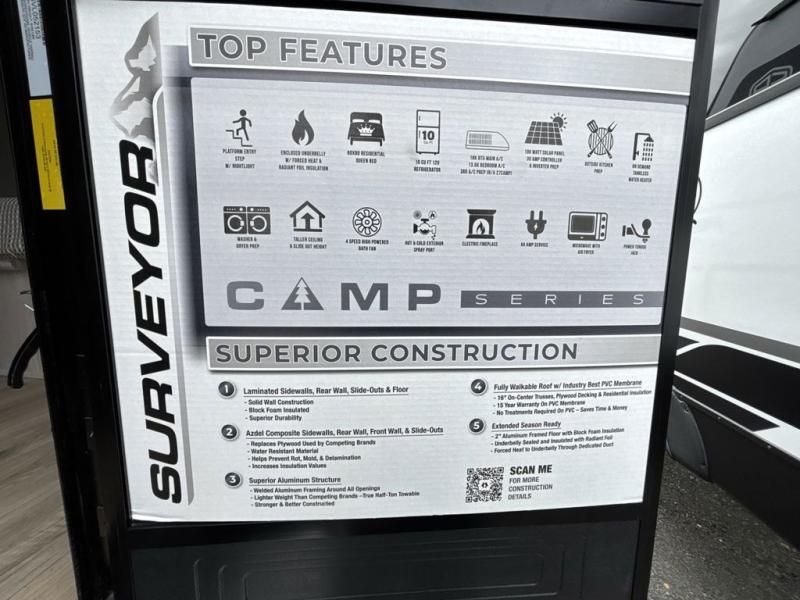 Value and versatility go hand-in-hand with the Surveyor Camp Series travel trailers by Forest River. The solid construction includes a 2" aluminum framed floor with block foam insulation and a sealed underbelly with forced heat and radiant foil insulation. A 100-watt roof mounted solar panel will provide some off-grid power, and the power tongue jack will let you easily hitch up and go whenever you're ready. Additional stand-out features include Surf(X) seamless countertops throughout, two A/C units, an electric awning with LED light strip, black glass friction hinge entry door(s), and so much more!