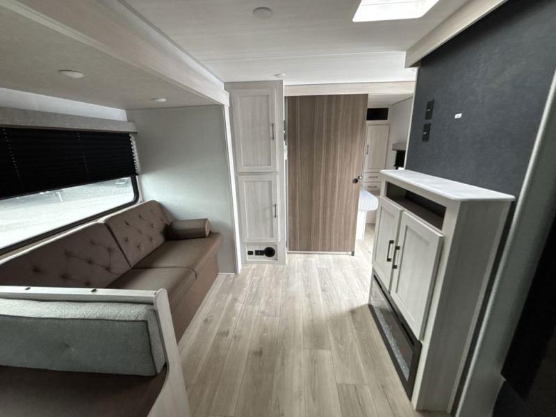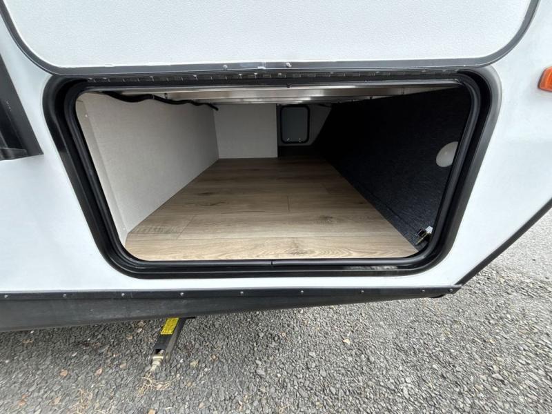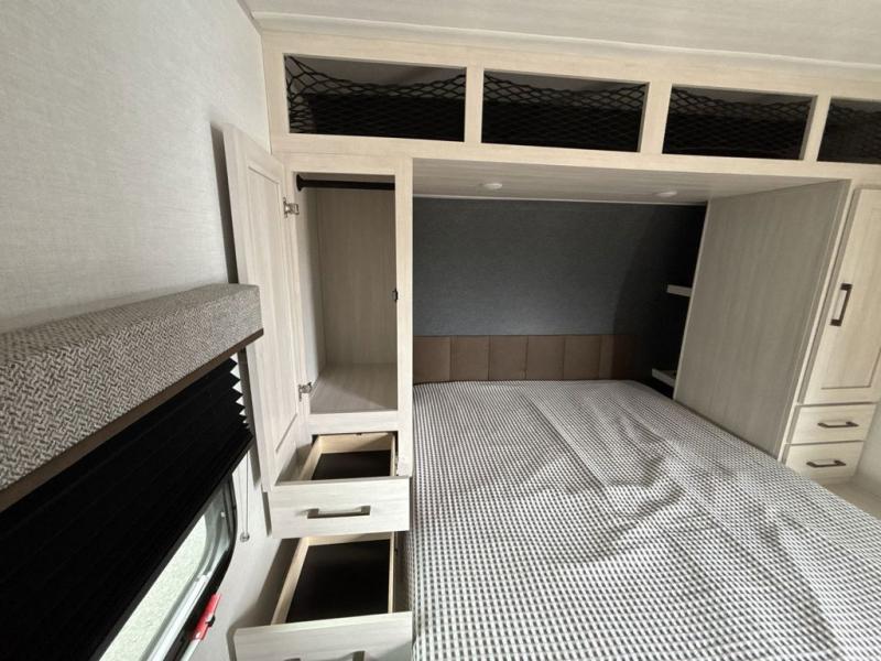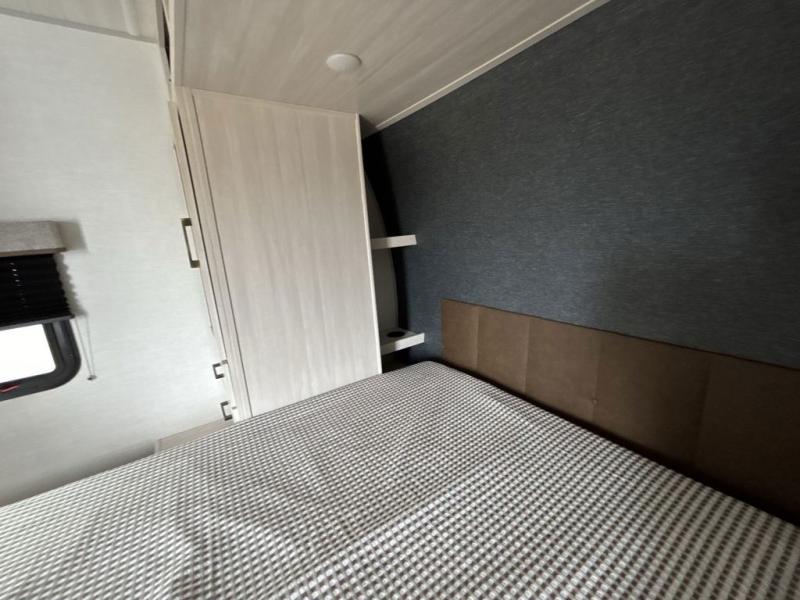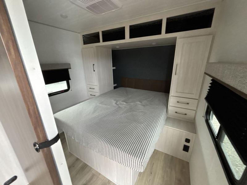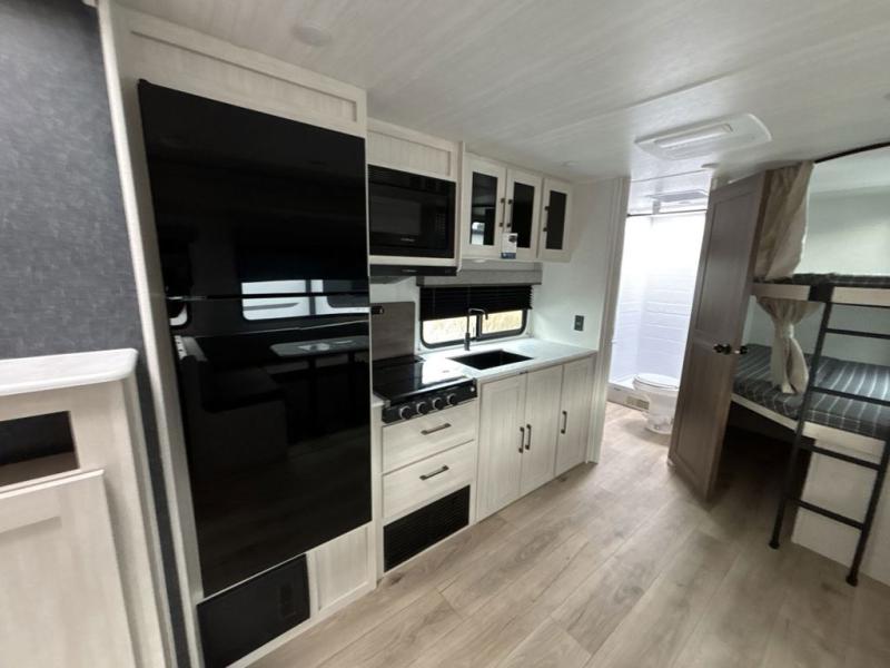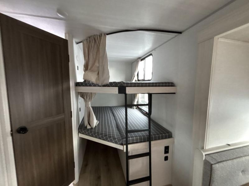 Head to your favorite camping spot with your favorite people in this spacious, dual entry travel trailer! The large slide out houses the U-shaped dinette and sofa where you can relax in the evenings and even let guests sleep over who haven't claimed the double-size bunks. A full bath with its own exterior entry door is convenient for all, and the full kitchen lets you whip up your best meals in the microwave with an air fryer. There is also a walk-in pantry with washer and dryer prep, which gives you the option to add those appliances. When it's time to call it a night, the front private bedroom with a queen bed will provide you with your own space to retreat to, and there are dual bedside wardrobes to keep your clothes organized.
