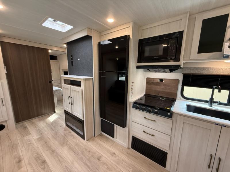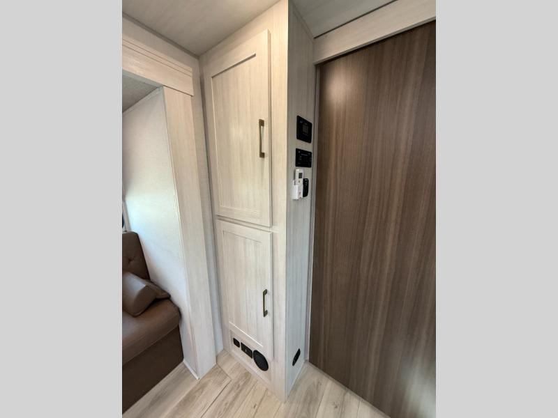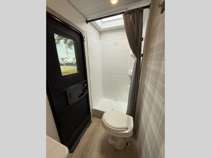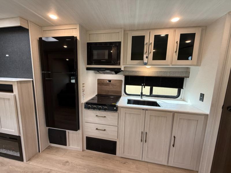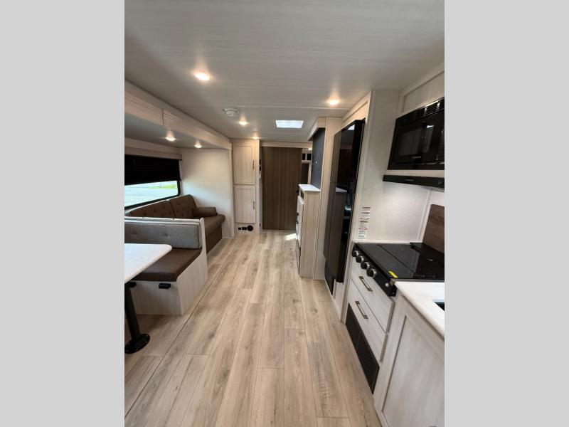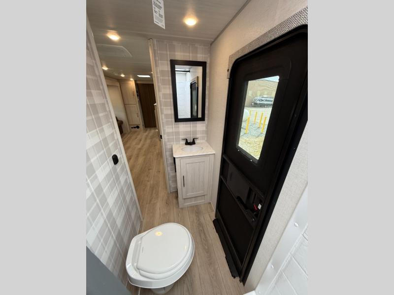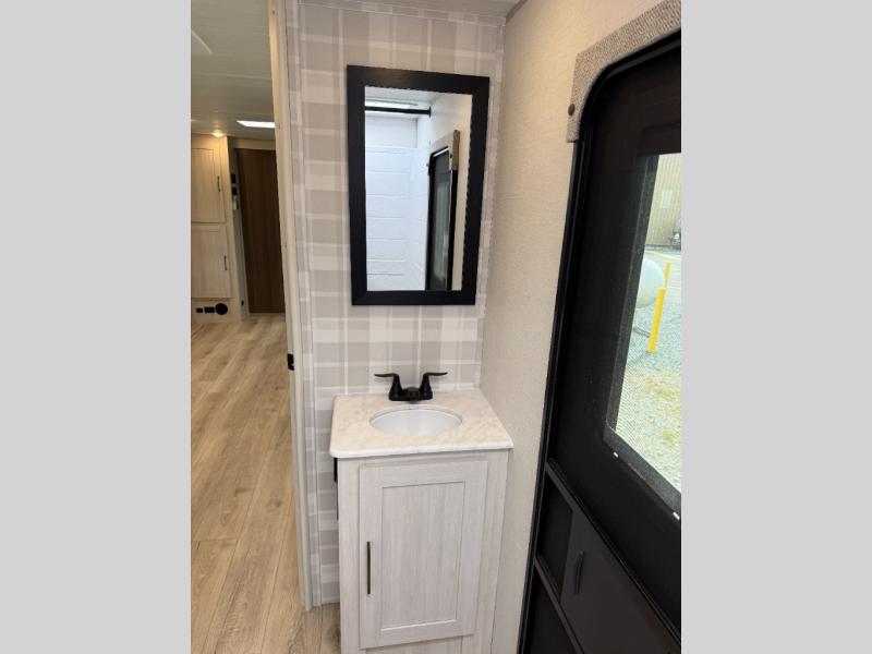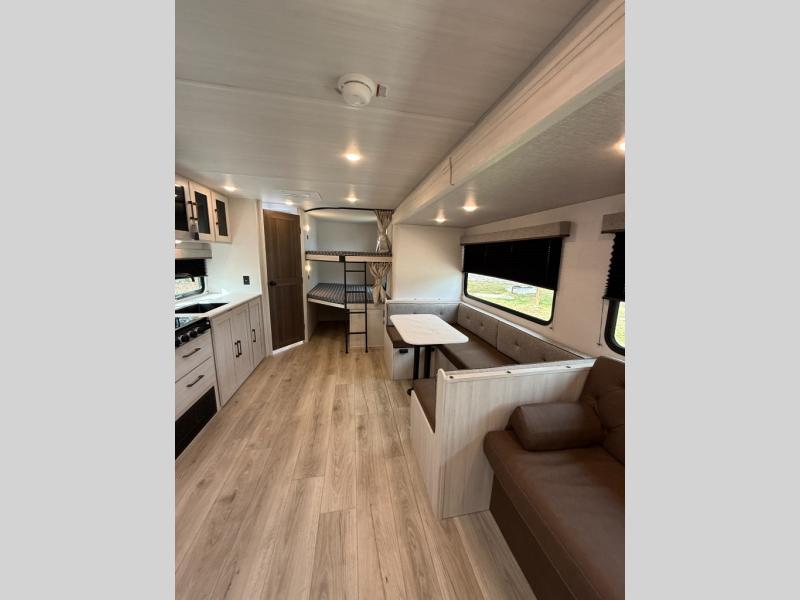 Head to your favorite camping spot with your favorite people in this spacious, dual entry travel trailer! The large slide out houses the U-shaped dinette and sofa where you can relax in the evenings and even let guests sleep over who haven't claimed the double-size bunks. A full bath with its own exterior entry door is convenient for all, and the full kitchen lets you whip up your best meals in the microwave with an air fryer. There is also a walk-in pantry with washer and dryer prep, which gives you the option to add those appliances. When it's time to call it a night, the front private bedroom with a queen bed will provide you with your own space to retreat to, and there are dual bedside wardrobes to keep your clothes organized.
