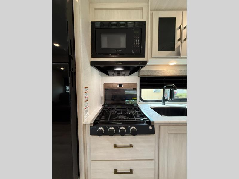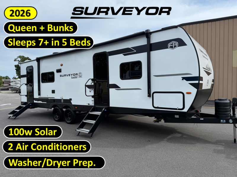 Value and versatility go hand-in-hand with the Surveyor Camp Series travel trailers by Forest River. The solid construction includes a 2" aluminum framed floor with block foam insulation and a sealed underbelly with forced heat and radiant foil insulation. A 100-watt roof mounted solar panel will provide some off-grid power, and the power tongue jack will let you easily hitch up and go whenever you're ready. Additional stand-out features include Surf(X) seamless countertops throughout, two A/C units, an electric awning with LED light strip, black glass friction hinge entry door(s), and so much more!