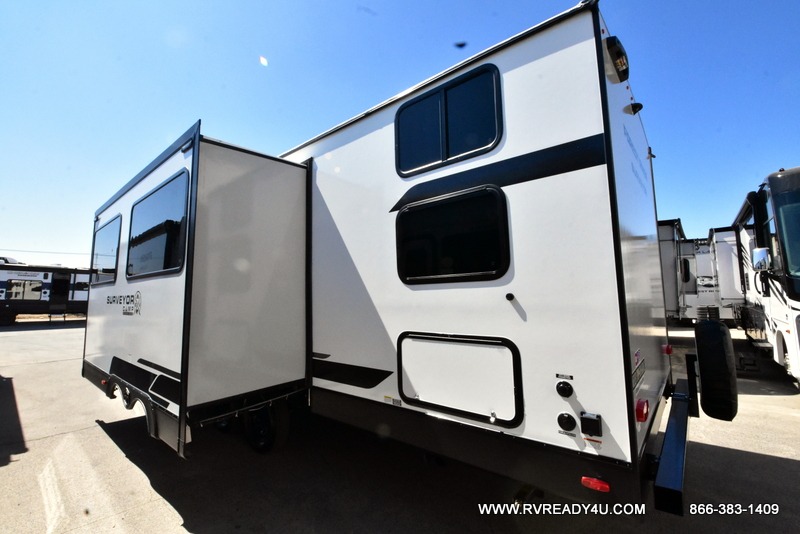 Value and versatility go hand-in-hand with the Surveyor Camp Series travel trailers by Forest River. The solid construction includes a 2" aluminum framed floor with block foam insulation and a sealed underbelly with forced heat and radiant foil insulation. A 100-watt roof mounted solar panel will provide some off-grid power, and the power tongue jack will let you easily hitch up and go whenever you're ready. Additional stand-out features include Surf(X) seamless countertops throughout, two A/C units, an electric awning with LED light strip, black glass friction hinge entry door(s), and so much more!