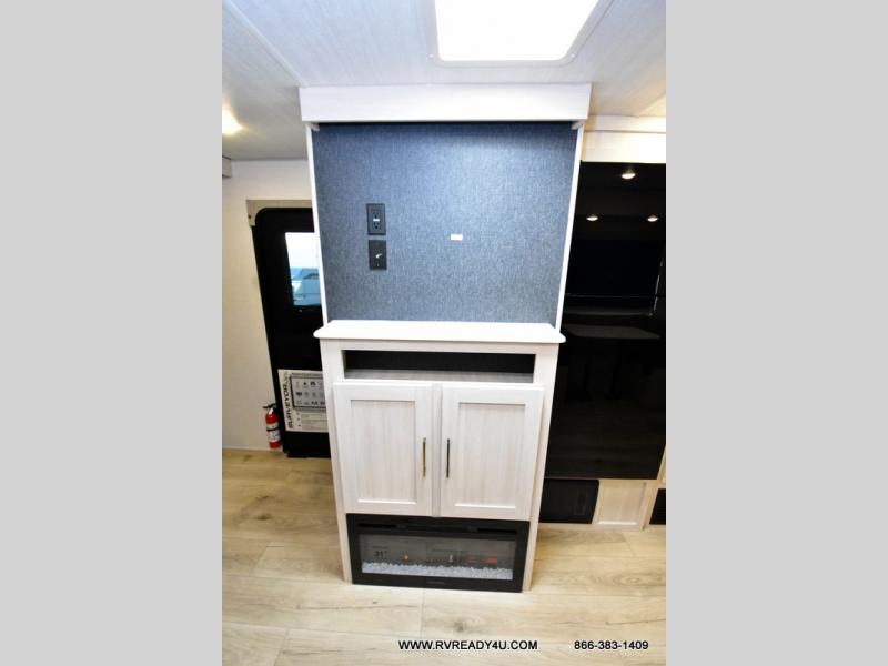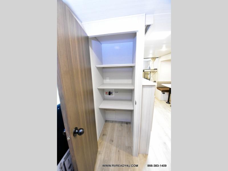 Head to your favorite camping spot with your favorite people in this spacious, dual entry travel trailer! The large slide out houses the U-shaped dinette and sofa where you can relax in the evenings and even let guests sleep over who haven't claimed the double-size bunks. A full bath with its own exterior entry door is convenient for all, and the full kitchen lets you whip up your best meals in the microwave with an air fryer. There is also a walk-in pantry with washer and dryer prep, which gives you the option to add those appliances. When it's time to call it a night, the front private bedroom with a queen bed will provide you with your own space to retreat to, and there are dual bedside wardrobes to keep your clothes organized.