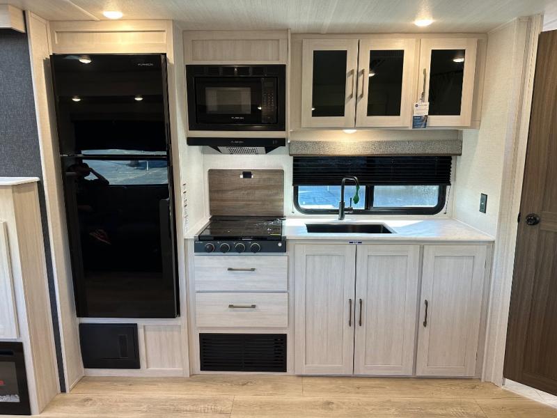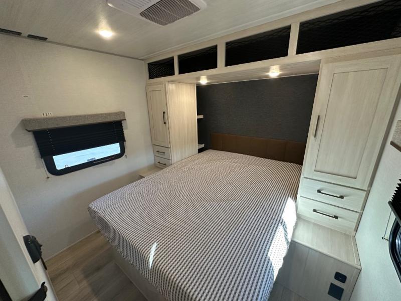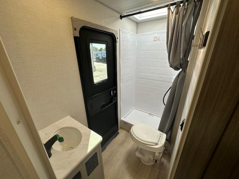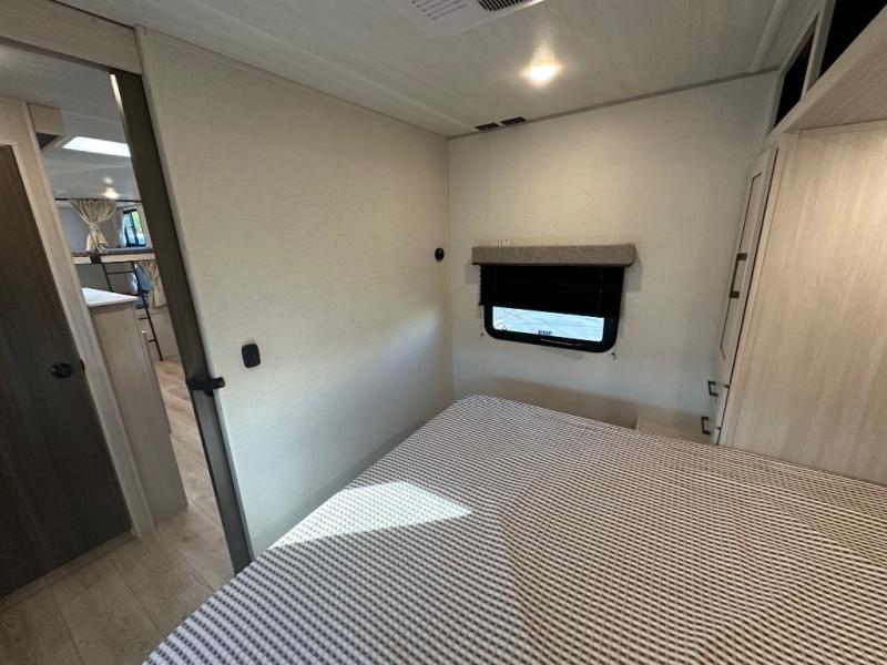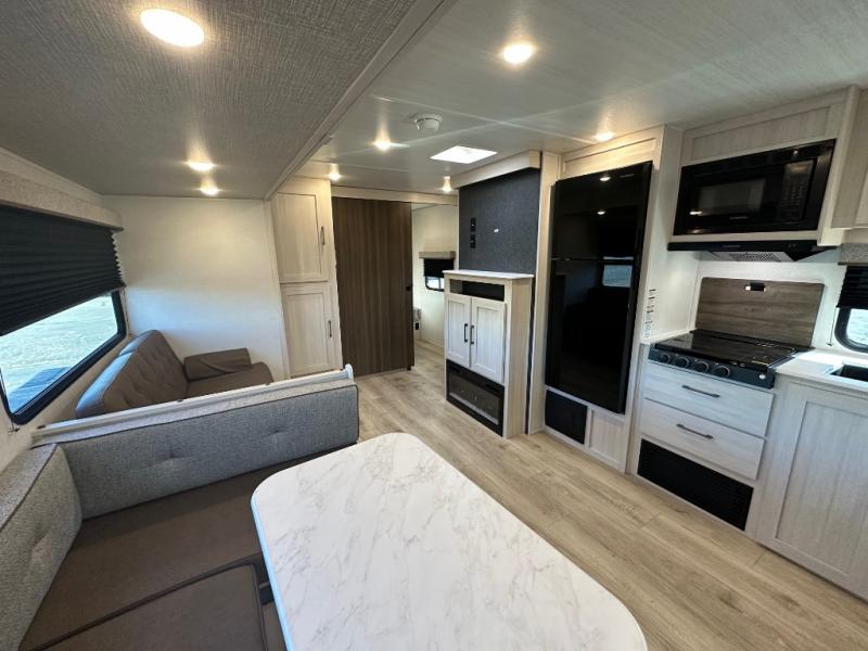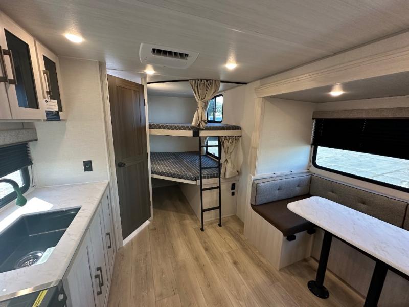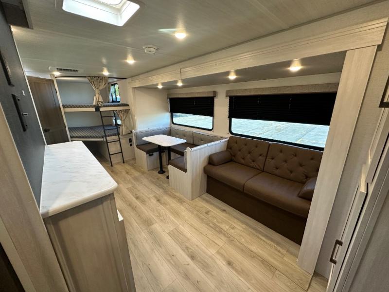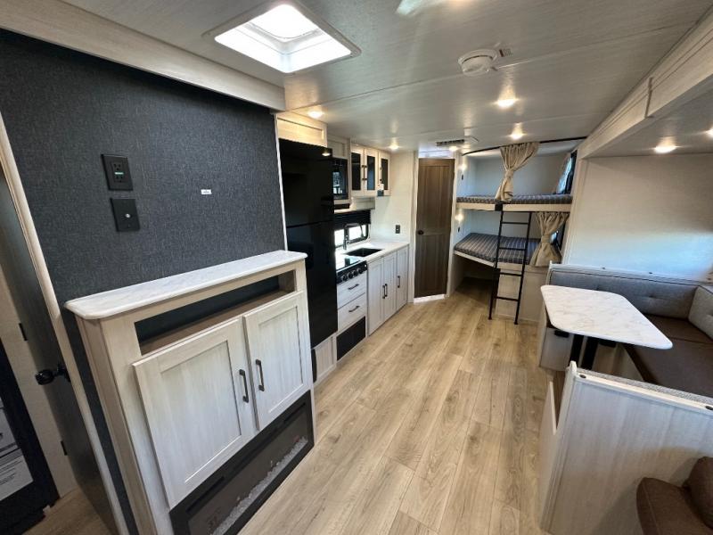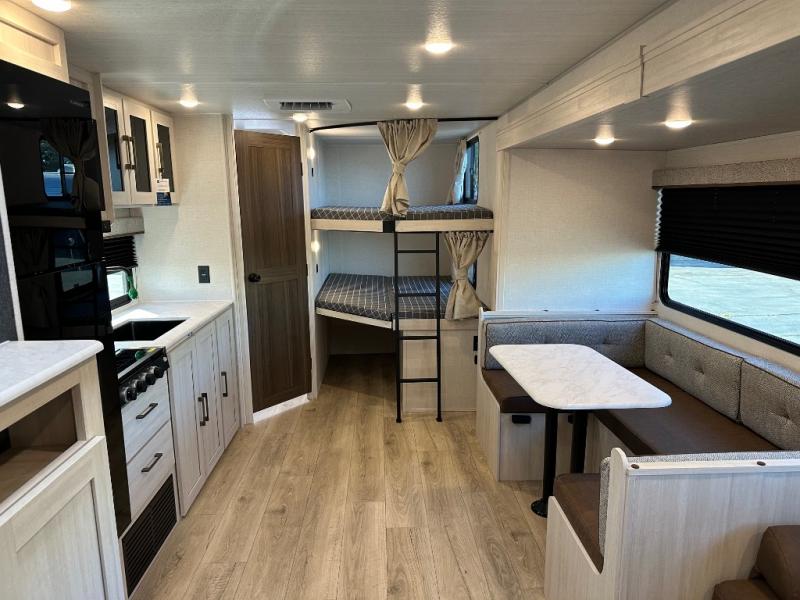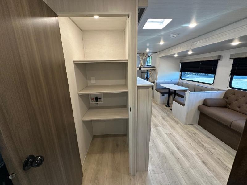 Head to your favorite camping spot with your favorite people in this spacious, dual entry travel trailer! The large slide out houses the U-shaped dinette and sofa where you can relax in the evenings and even let guests sleep over who haven't claimed the double-size bunks. A full bath with its own exterior entry door is convenient for all, and the full kitchen lets you whip up your best meals in the microwave with an air fryer. There is also a walk-in pantry with washer and dryer prep, which gives you the option to add those appliances. When it's time to call it a night, the front private bedroom with a queen bed will provide you with your own space to retreat to, and there are dual bedside wardrobes to keep your clothes organized.