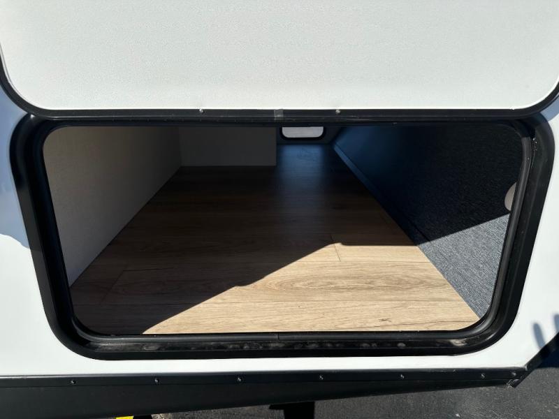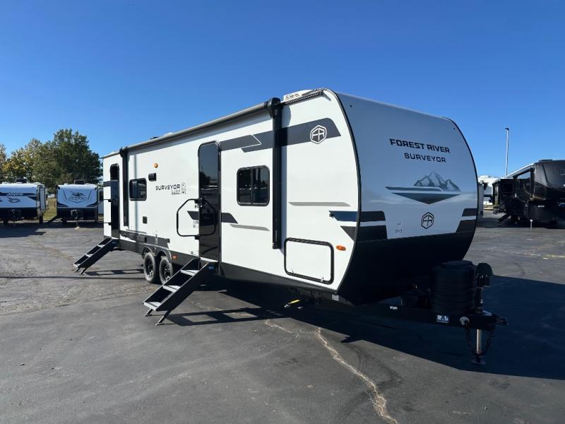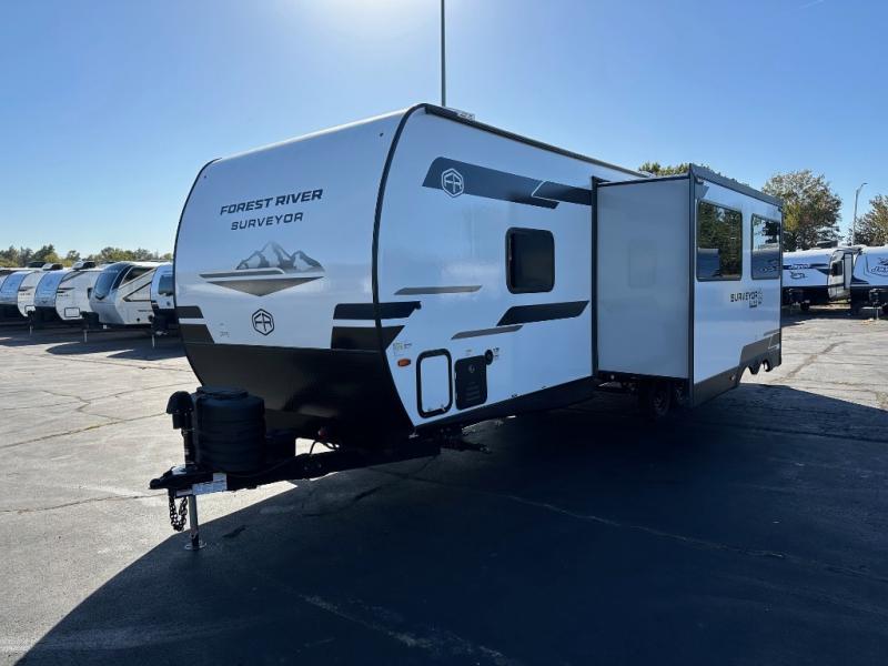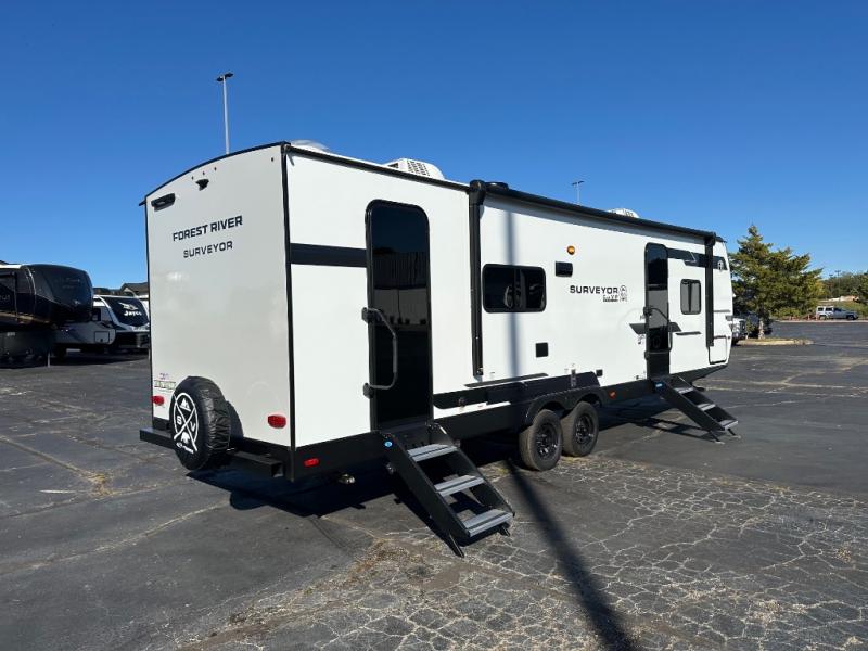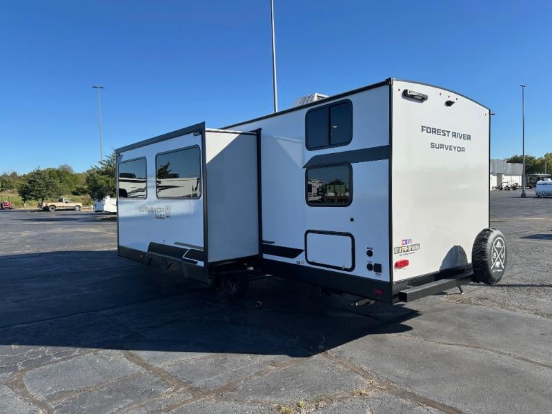 Value and versatility go hand-in-hand with the Surveyor Camp Series travel trailers by Forest River. The solid construction includes a 2" aluminum framed floor with block foam insulation and a sealed underbelly with forced heat and radiant foil insulation. A 100-watt roof mounted solar panel will provide some off-grid power, and the power tongue jack will let you easily hitch up and go whenever you're ready. Additional stand-out features include Surf(X) seamless countertops throughout, two A/C units, an electric awning with LED light strip, black glass friction hinge entry door(s), and so much more!