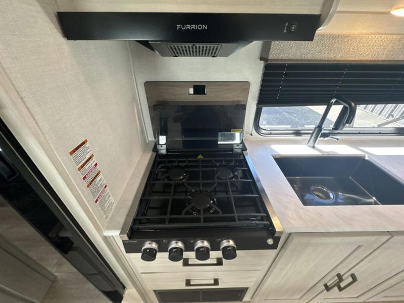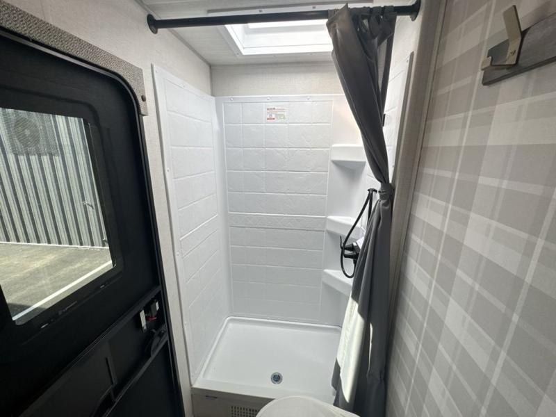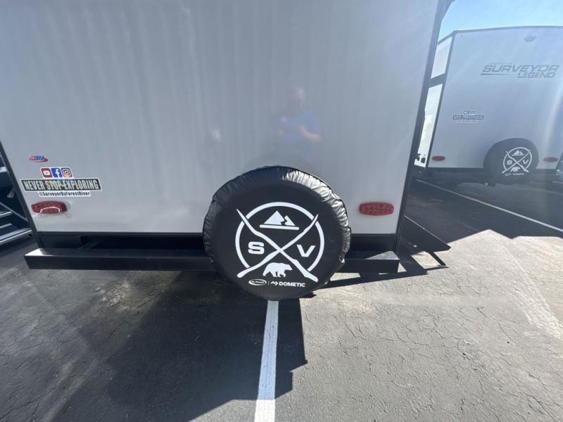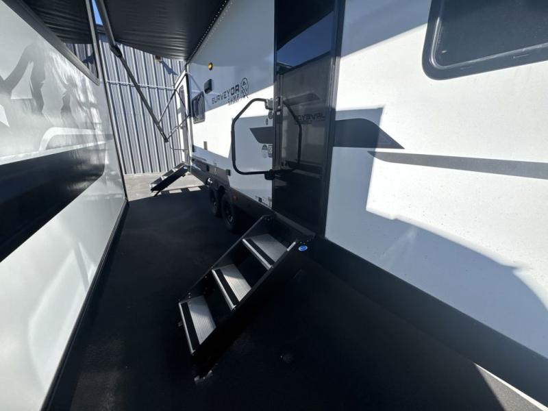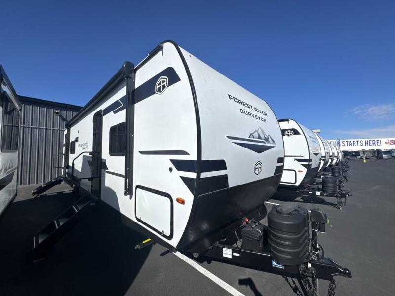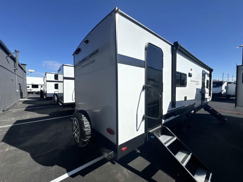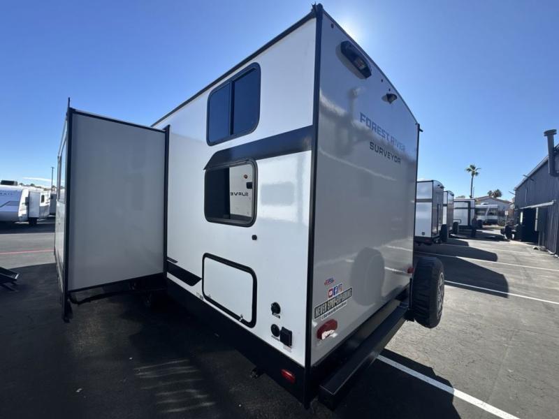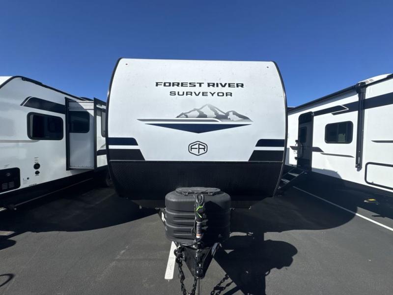 Value and versatility go hand-in-hand with the Surveyor Camp Series travel trailers by Forest River. The solid construction includes a 2" aluminum framed floor with block foam insulation and a sealed underbelly with forced heat and radiant foil insulation. A 100-watt roof mounted solar panel will provide some off-grid power, and the power tongue jack will let you easily hitch up and go whenever you're ready. Additional stand-out features include Surf(X) seamless countertops throughout, two A/C units, an electric awning with LED light strip, black glass friction hinge entry door(s), and so much more!