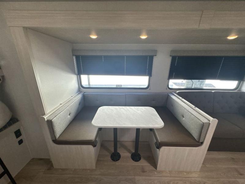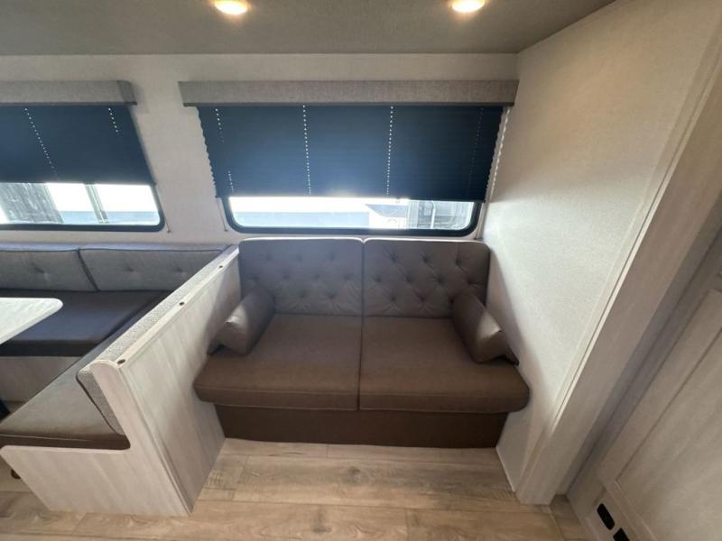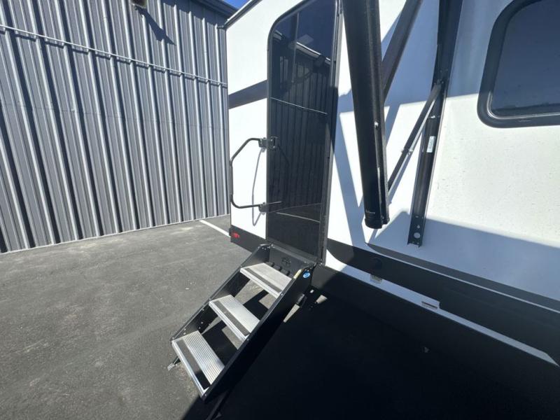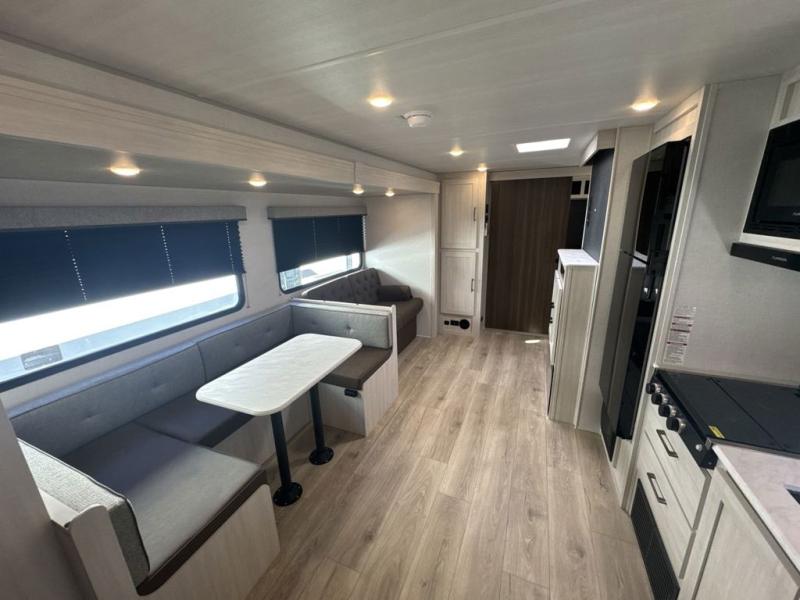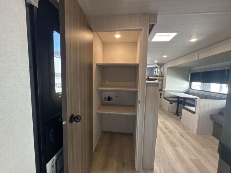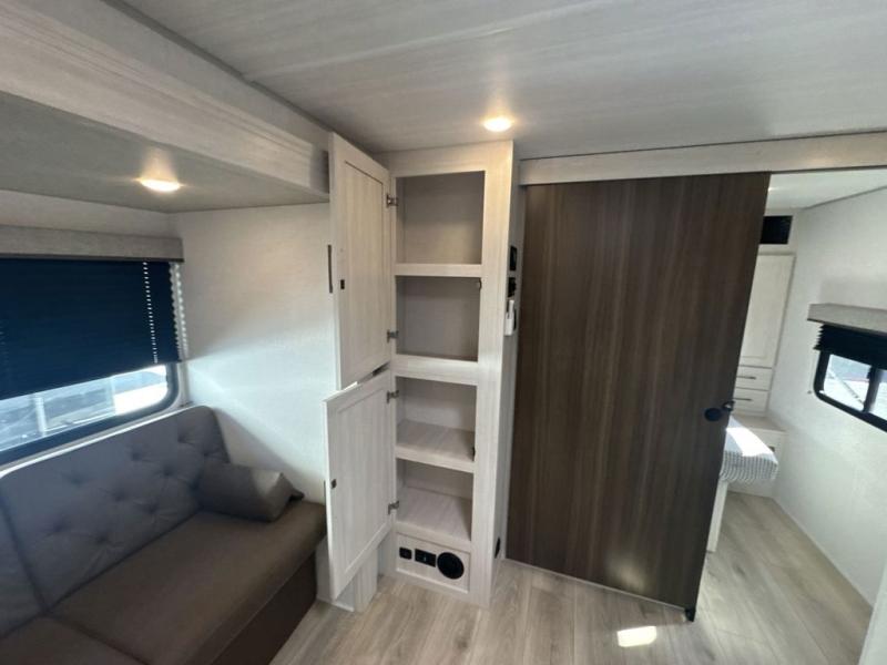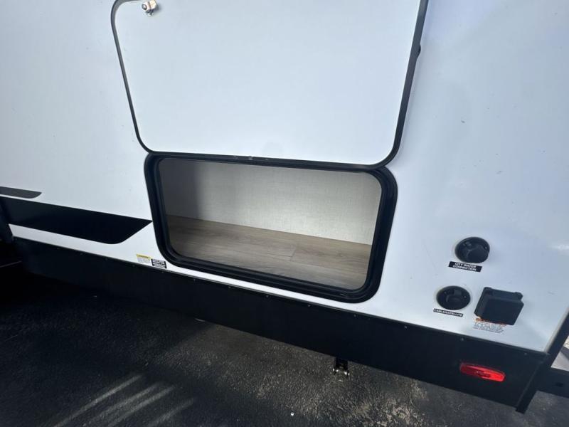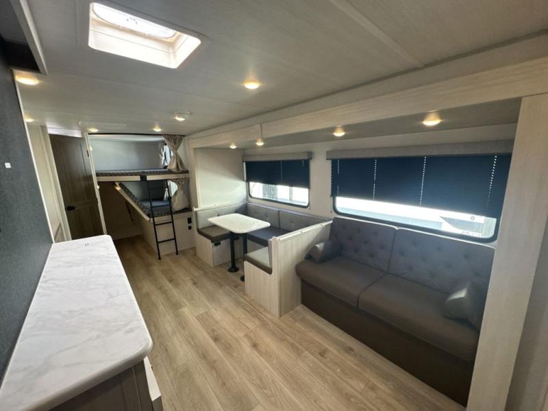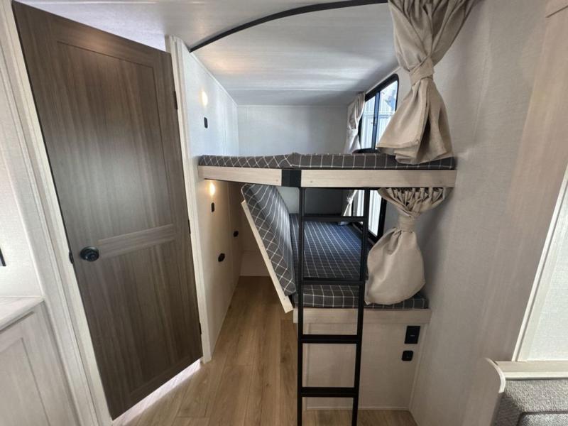 Head to your favorite camping spot with your favorite people in this spacious, dual entry travel trailer! The large slide out houses the U-shaped dinette and sofa where you can relax in the evenings and even let guests sleep over who haven't claimed the double-size bunks. A full bath with its own exterior entry door is convenient for all, and the full kitchen lets you whip up your best meals in the microwave with an air fryer. There is also a walk-in pantry with washer and dryer prep, which gives you the option to add those appliances. When it's time to call it a night, the front private bedroom with a queen bed will provide you with your own space to retreat to, and there are dual bedside wardrobes to keep your clothes organized.