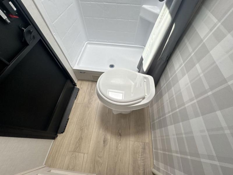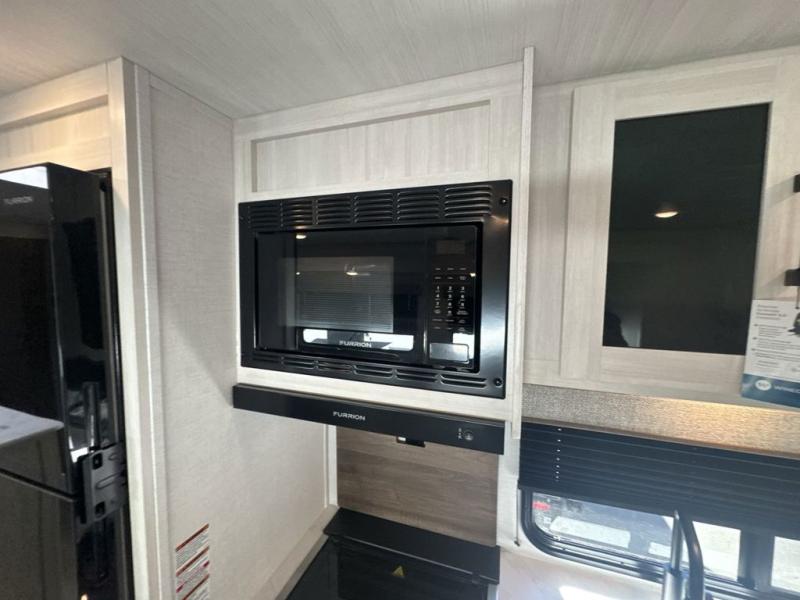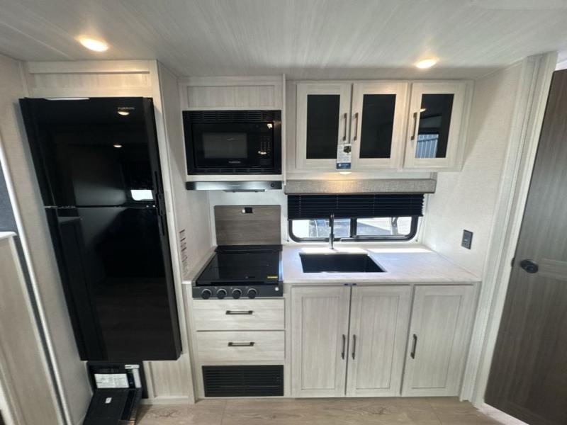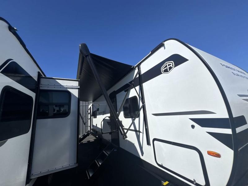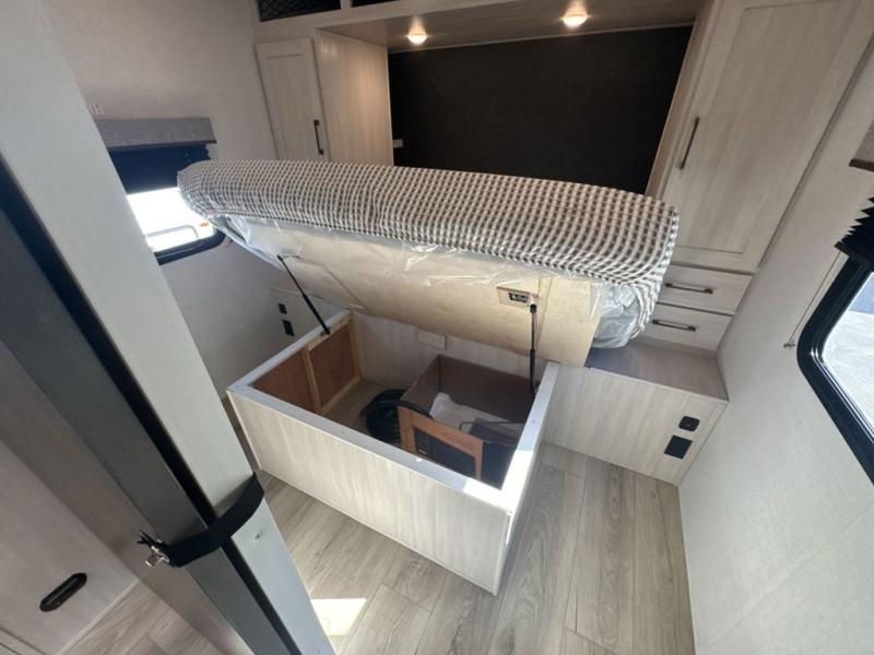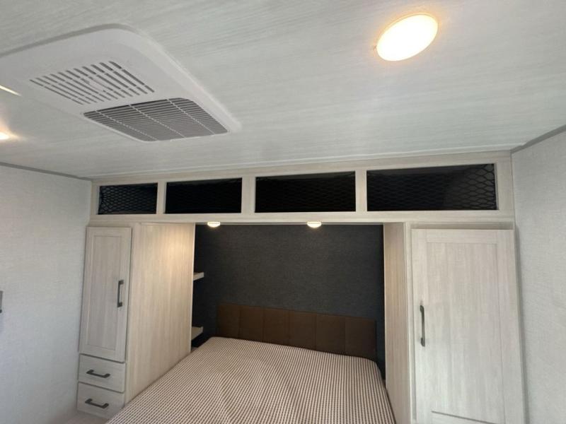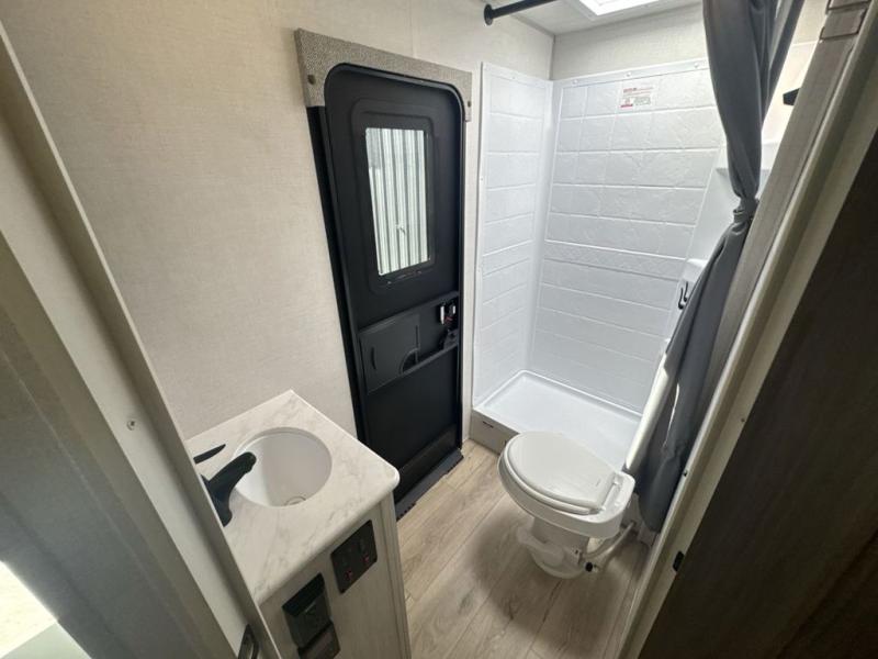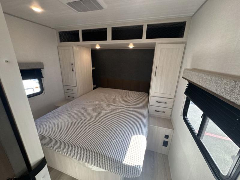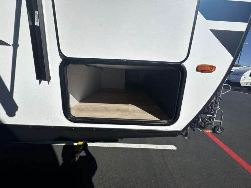 Head to your favorite camping spot with your favorite people in this spacious, dual entry travel trailer! The large slide out houses the U-shaped dinette and sofa where you can relax in the evenings and even let guests sleep over who haven't claimed the double-size bunks. A full bath with its own exterior entry door is convenient for all, and the full kitchen lets you whip up your best meals in the microwave with an air fryer. There is also a walk-in pantry with washer and dryer prep, which gives you the option to add those appliances. When it's time to call it a night, the front private bedroom with a queen bed will provide you with your own space to retreat to, and there are dual bedside wardrobes to keep your clothes organized.