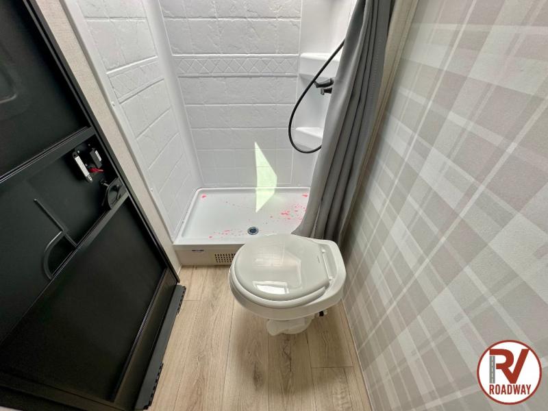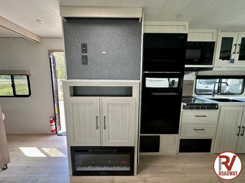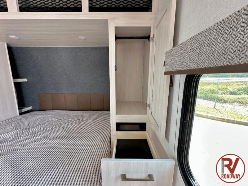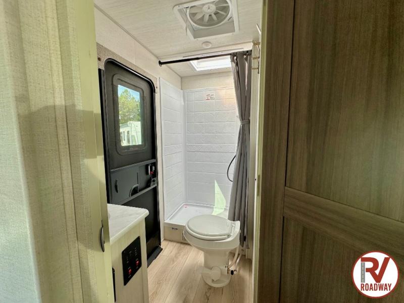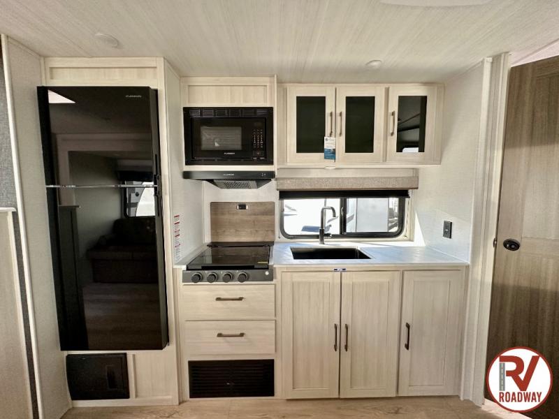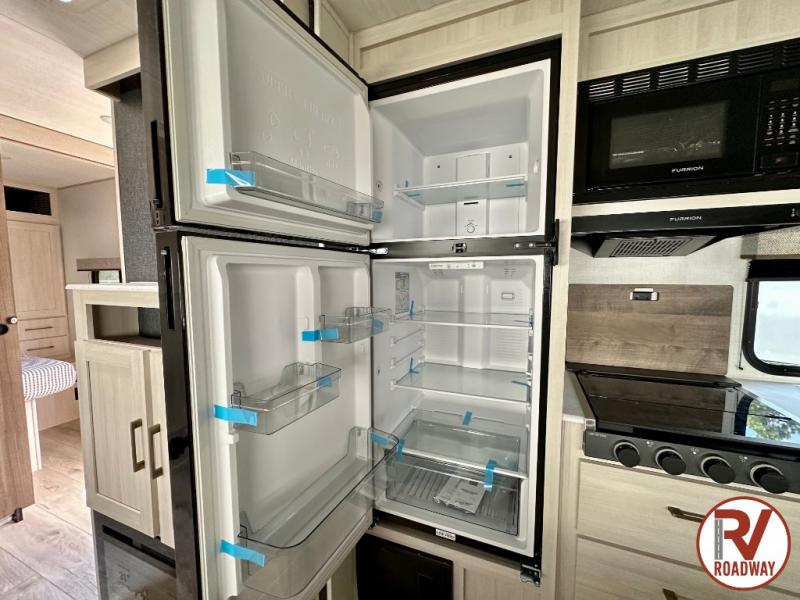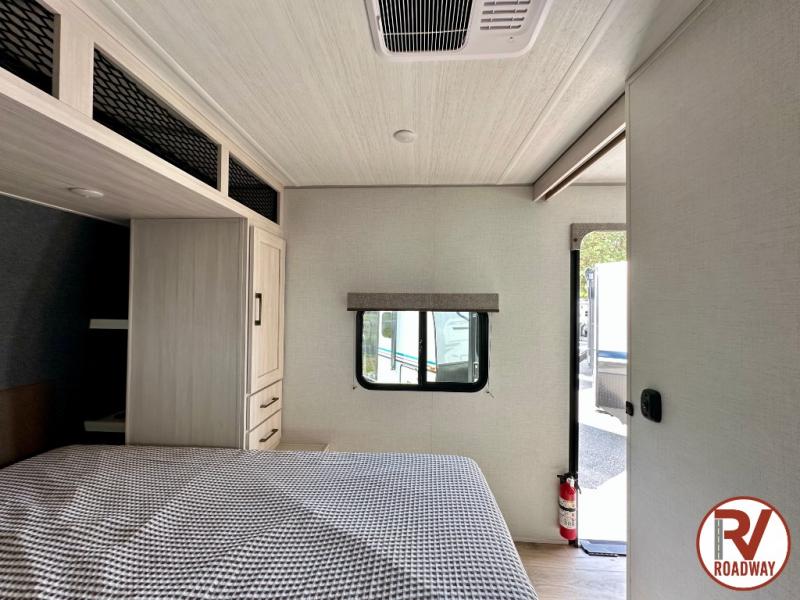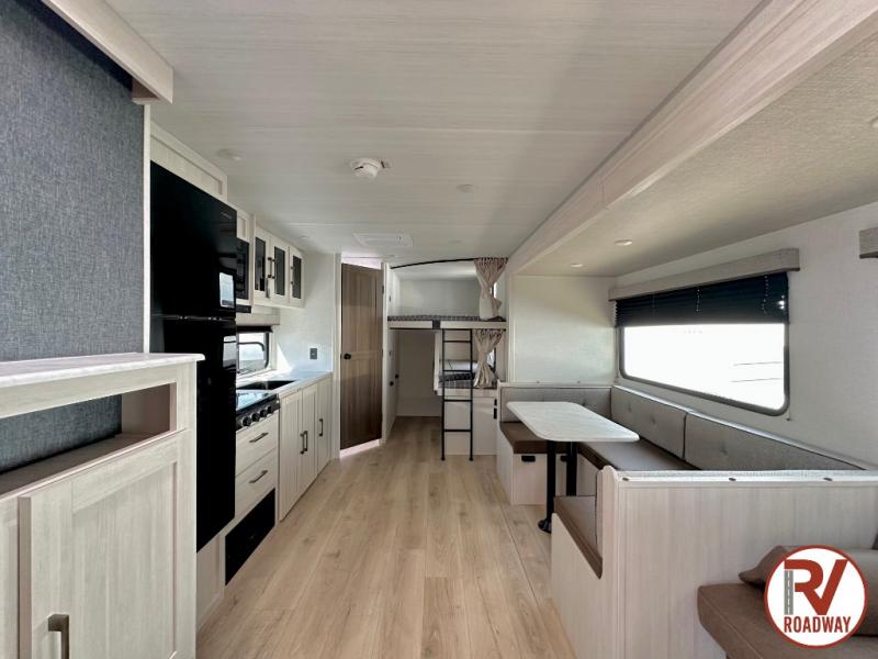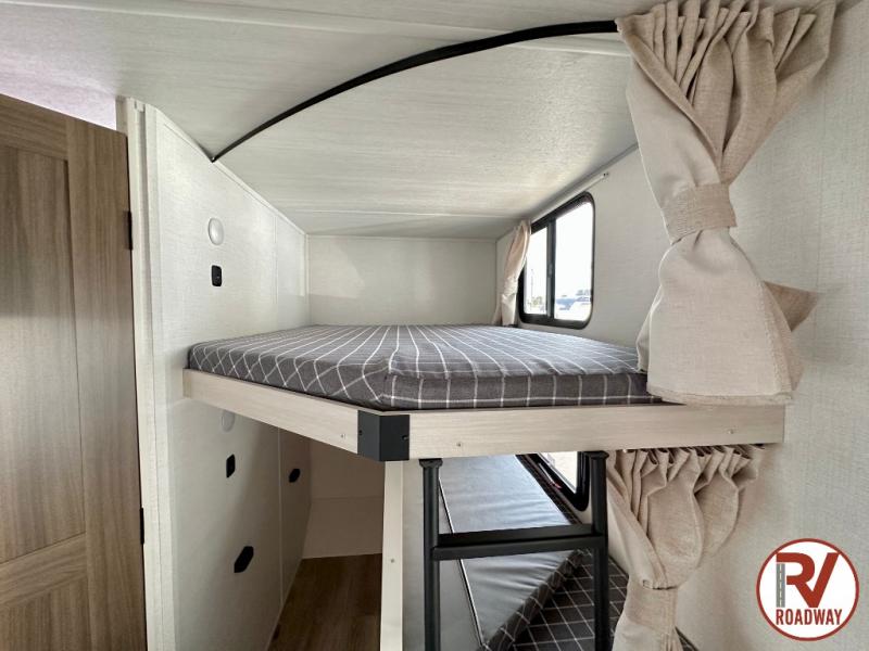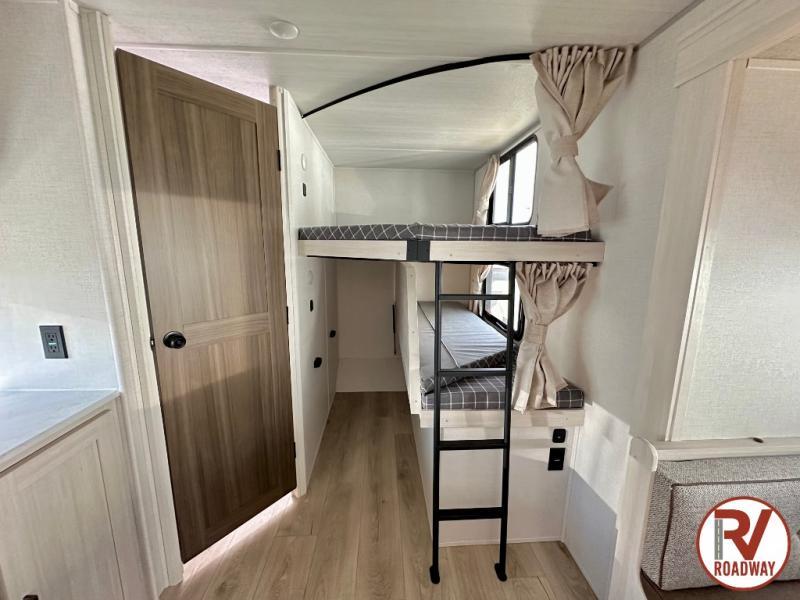 Head to your favorite camping spot with your favorite people in this spacious, dual entry travel trailer! The large slide out houses the U-shaped dinette and sofa where you can relax in the evenings and even let guests sleep over who haven't claimed the double-size bunks. A full bath with its own exterior entry door is convenient for all, and the full kitchen lets you whip up your best meals in the microwave with an air fryer. There is also a walk-in pantry with washer and dryer prep, which gives you the option to add those appliances. When it's time to call it a night, the front private bedroom with a queen bed will provide you with your own space to retreat to, and there are dual bedside wardrobes to keep your clothes organized.