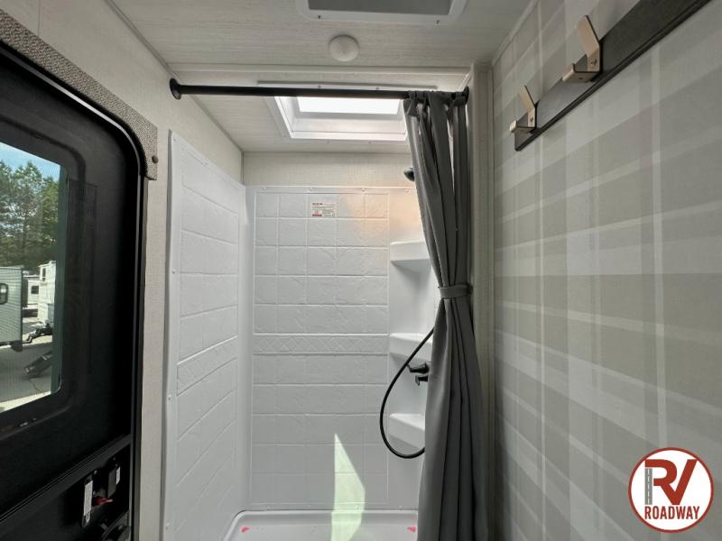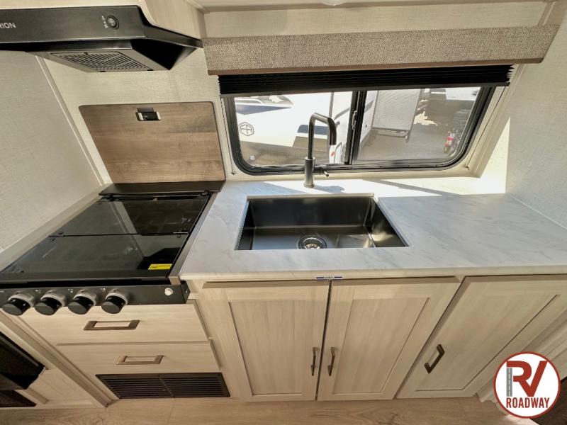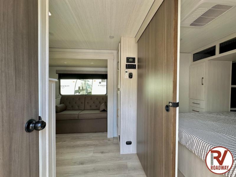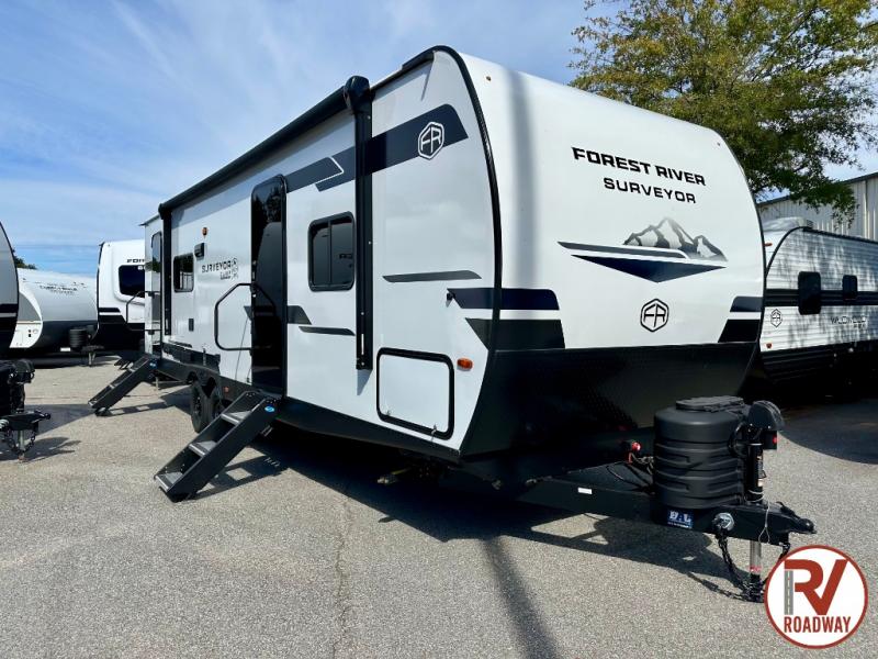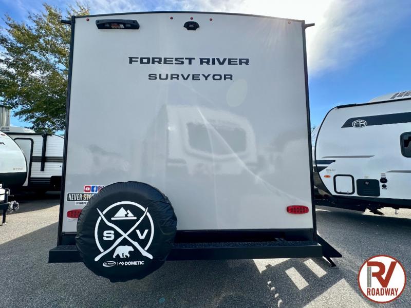 Value and versatility go hand-in-hand with the Surveyor Camp Series travel trailers by Forest River. The solid construction includes a 2" aluminum framed floor with block foam insulation and a sealed underbelly with forced heat and radiant foil insulation. A 100-watt roof mounted solar panel will provide some off-grid power, and the power tongue jack will let you easily hitch up and go whenever you're ready. Additional stand-out features include Surf(X) seamless countertops throughout, two A/C units, an electric awning with LED light strip, black glass friction hinge entry door(s), and so much more!