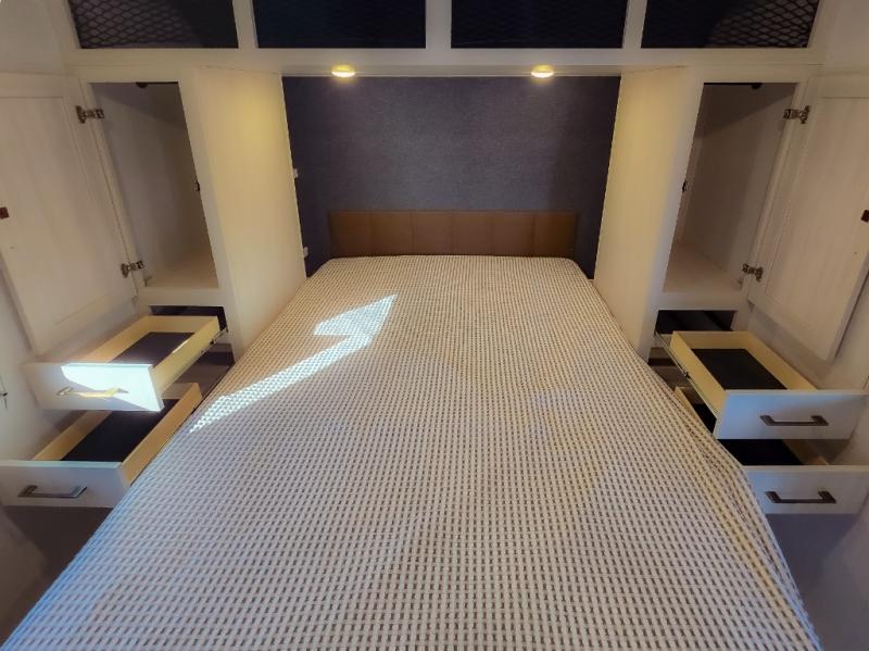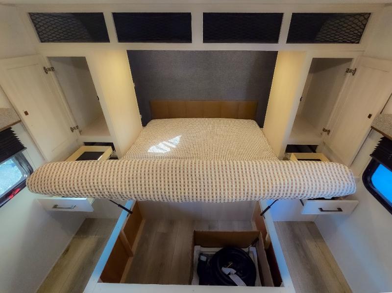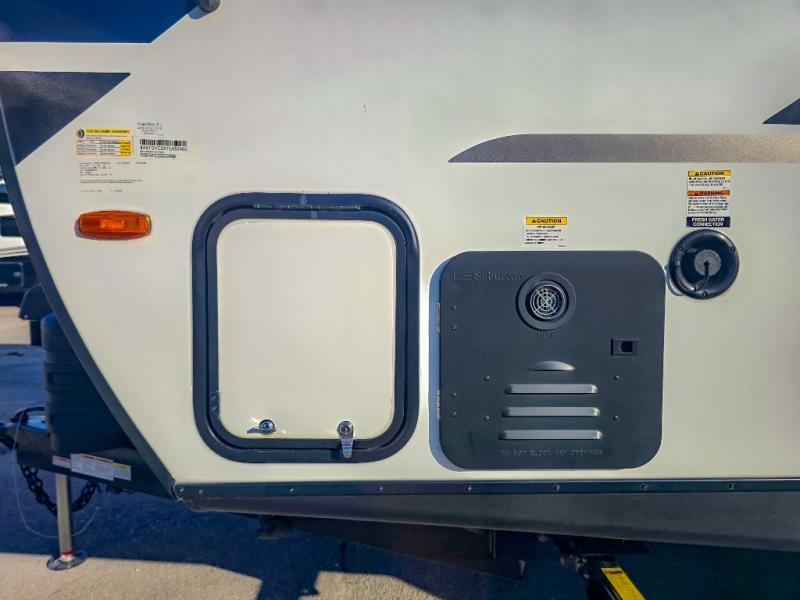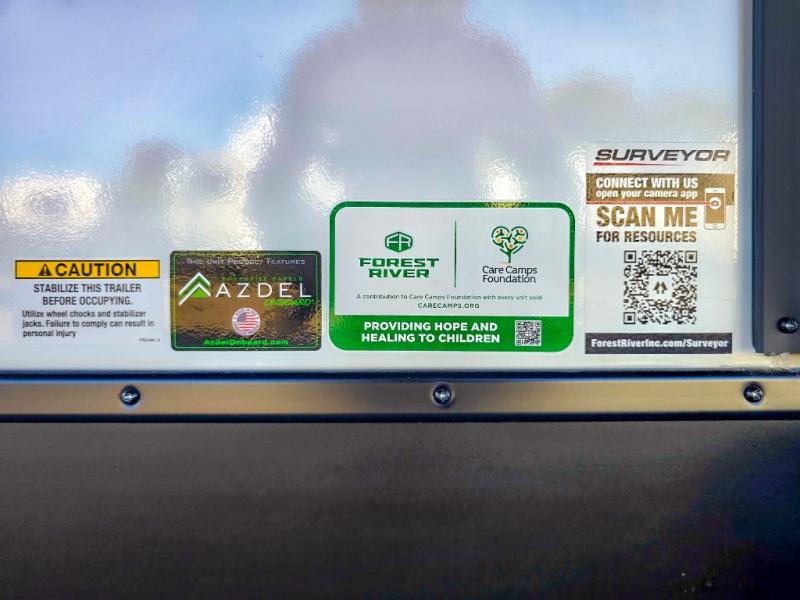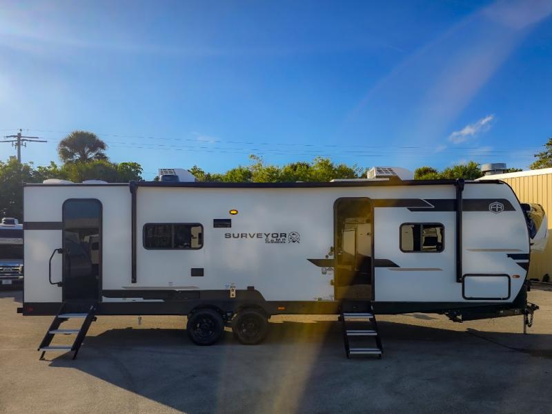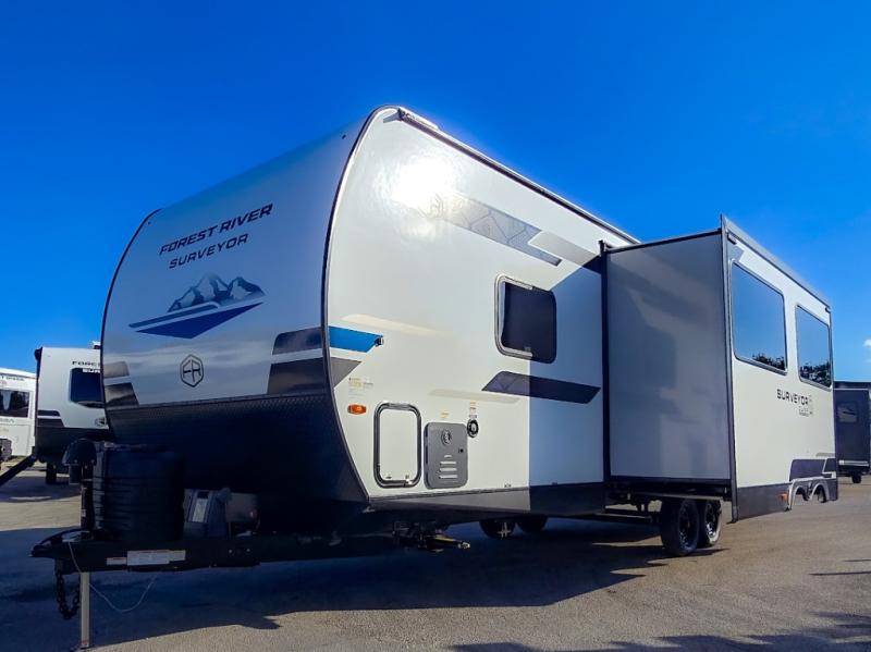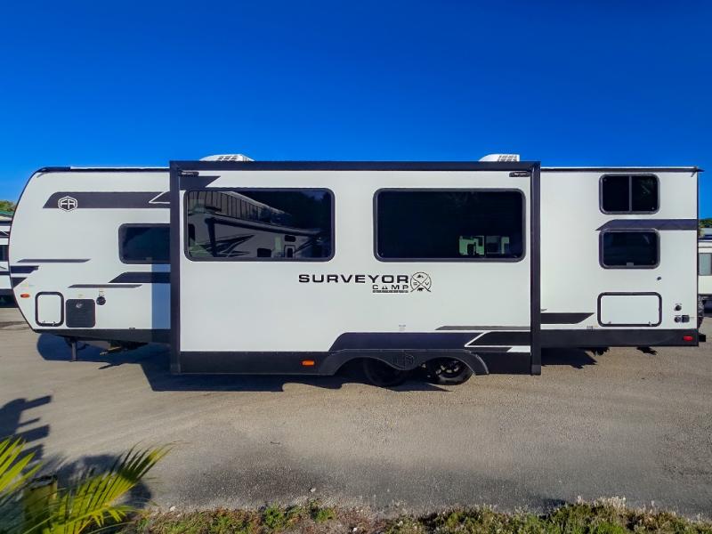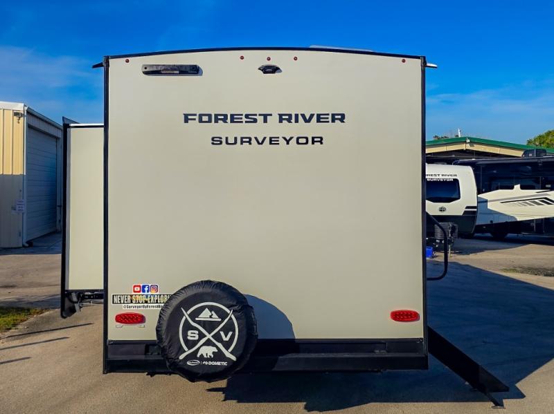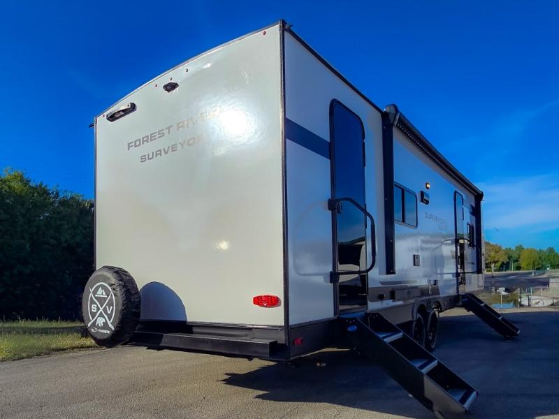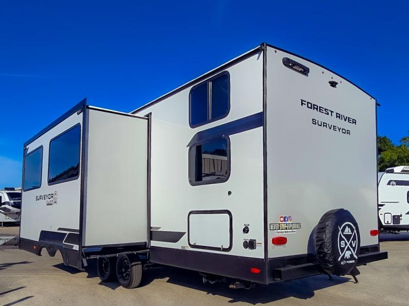 Value and versatility go hand-in-hand with the Surveyor Camp Series travel trailers by Forest River. The solid construction includes a 2" aluminum framed floor with block foam insulation and a sealed underbelly with forced heat and radiant foil insulation. A 100-watt roof mounted solar panel will provide some off-grid power, and the power tongue jack will let you easily hitch up and go whenever you're ready. Additional stand-out features include Surf(X) seamless countertops throughout, two A/C units, an electric awning with LED light strip, black glass friction hinge entry door(s), and so much more!