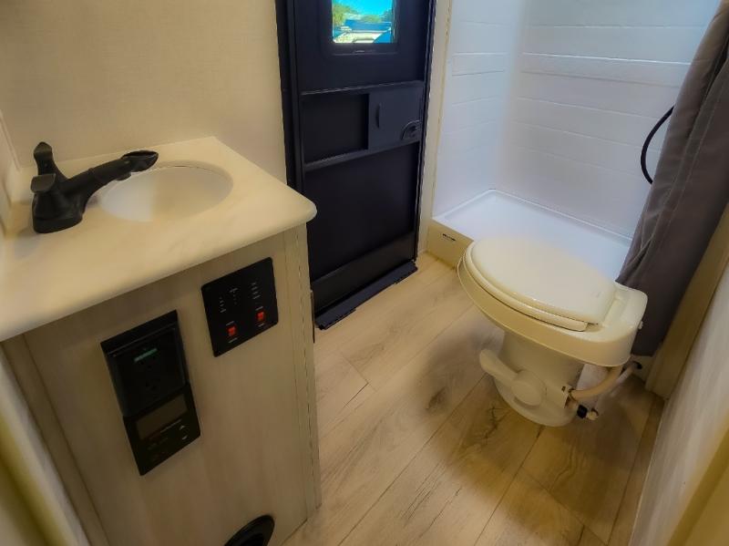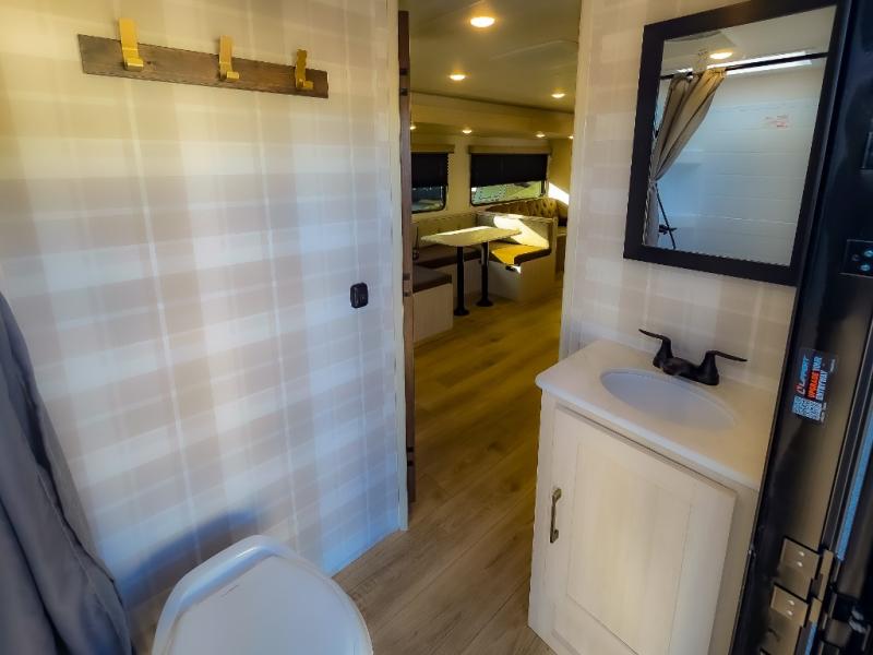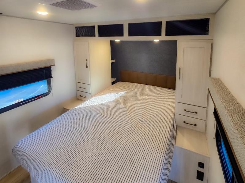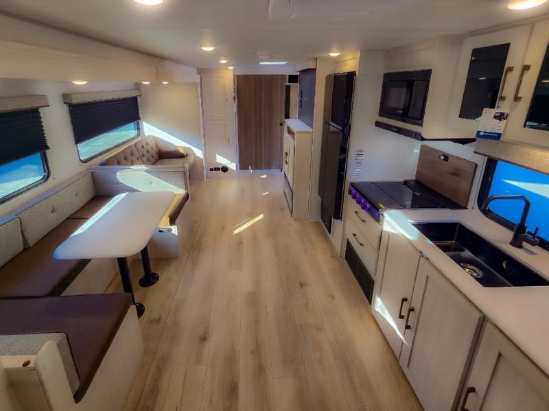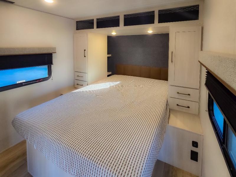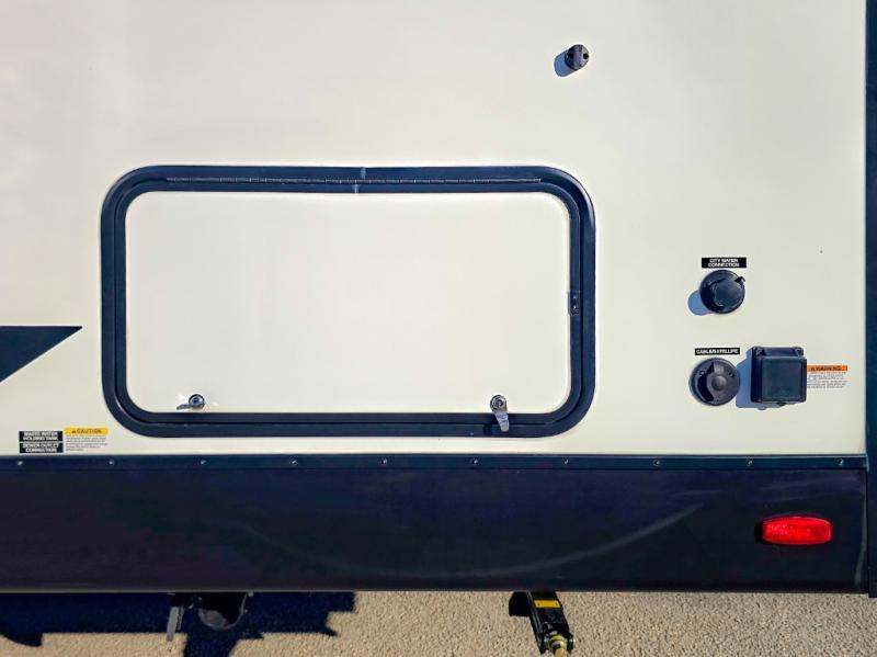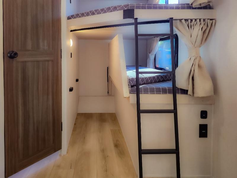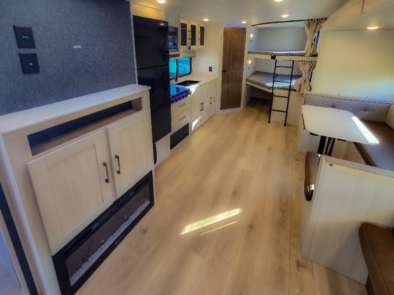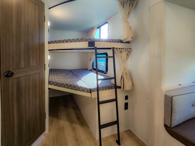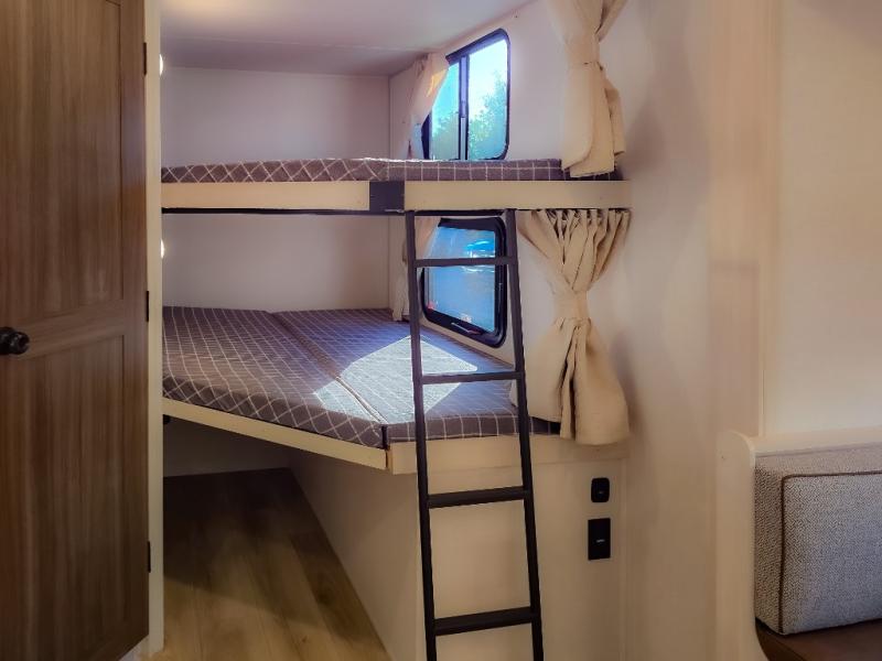 Head to your favorite camping spot with your favorite people in this spacious, dual entry travel trailer! The large slide out houses the U-shaped dinette and sofa where you can relax in the evenings and even let guests sleep over who haven't claimed the double-size bunks. A full bath with its own exterior entry door is convenient for all, and the full kitchen lets you whip up your best meals in the microwave with an air fryer. There is also a walk-in pantry with washer and dryer prep, which gives you the option to add those appliances. When it's time to call it a night, the front private bedroom with a queen bed will provide you with your own space to retreat to, and there are dual bedside wardrobes to keep your clothes organized.