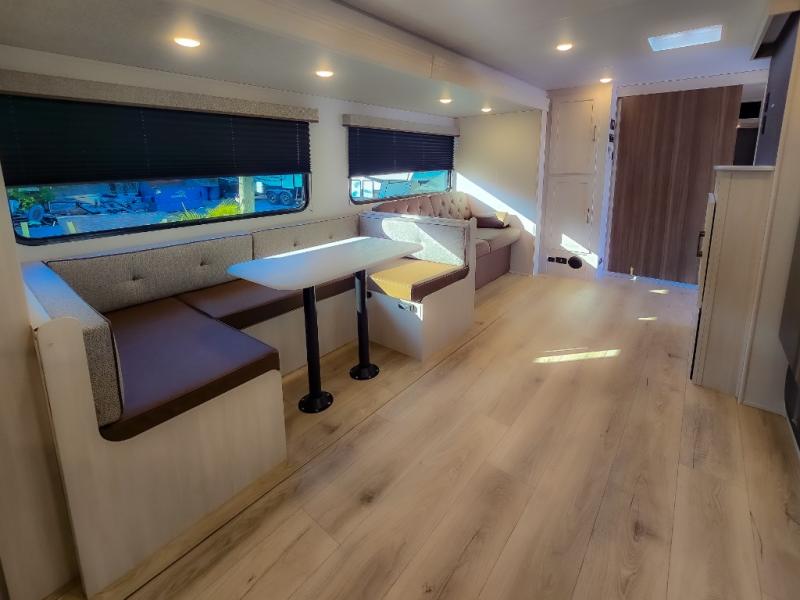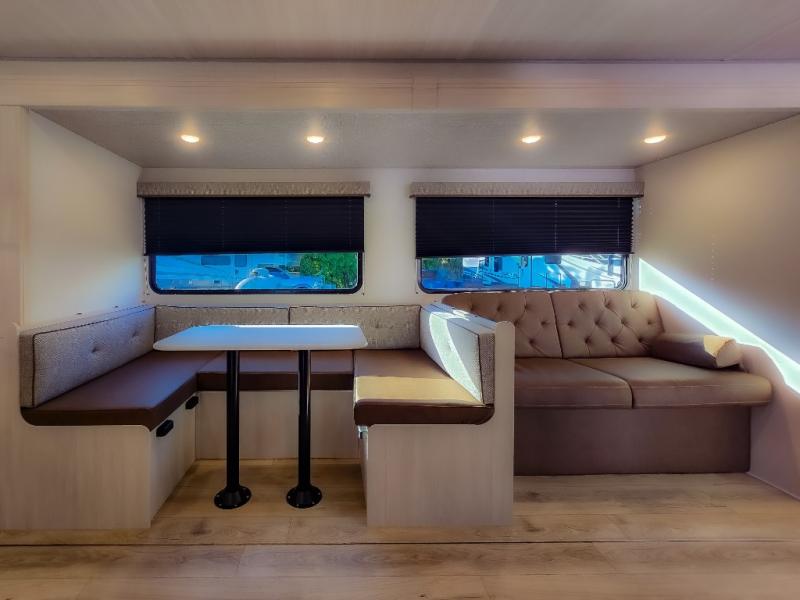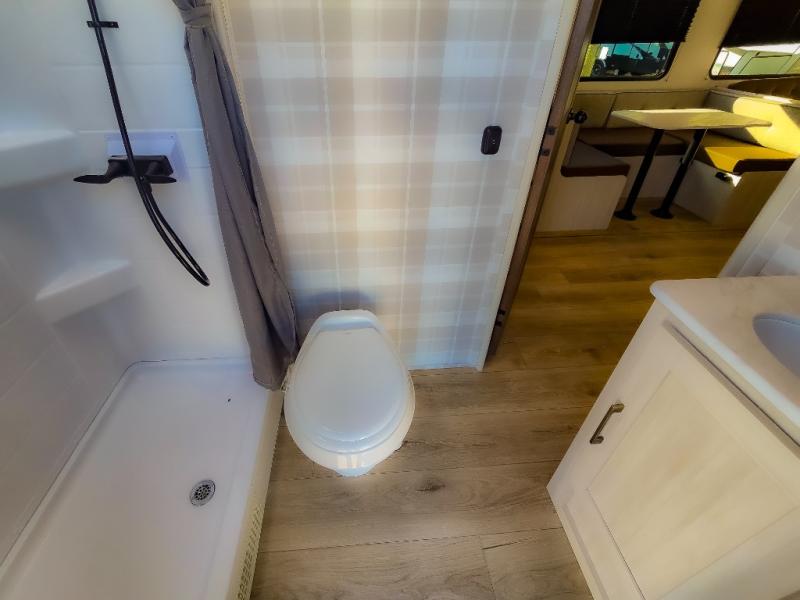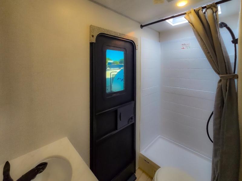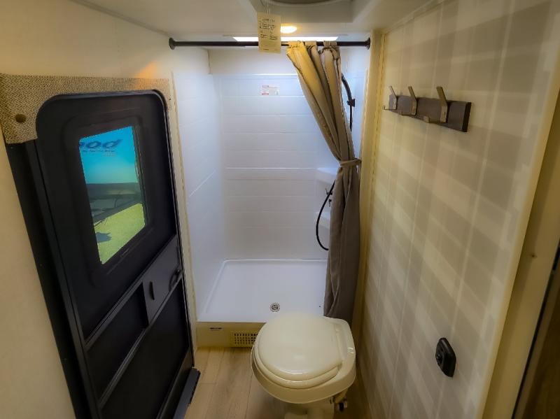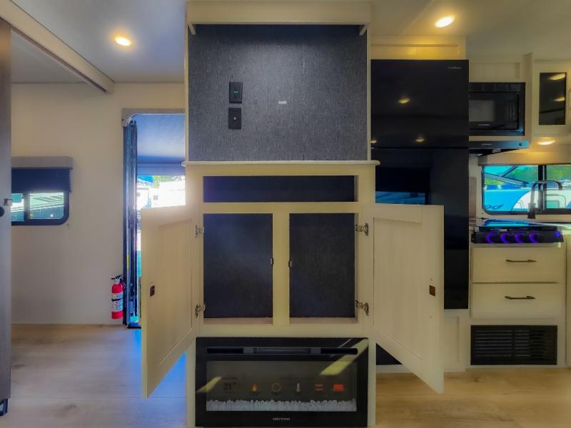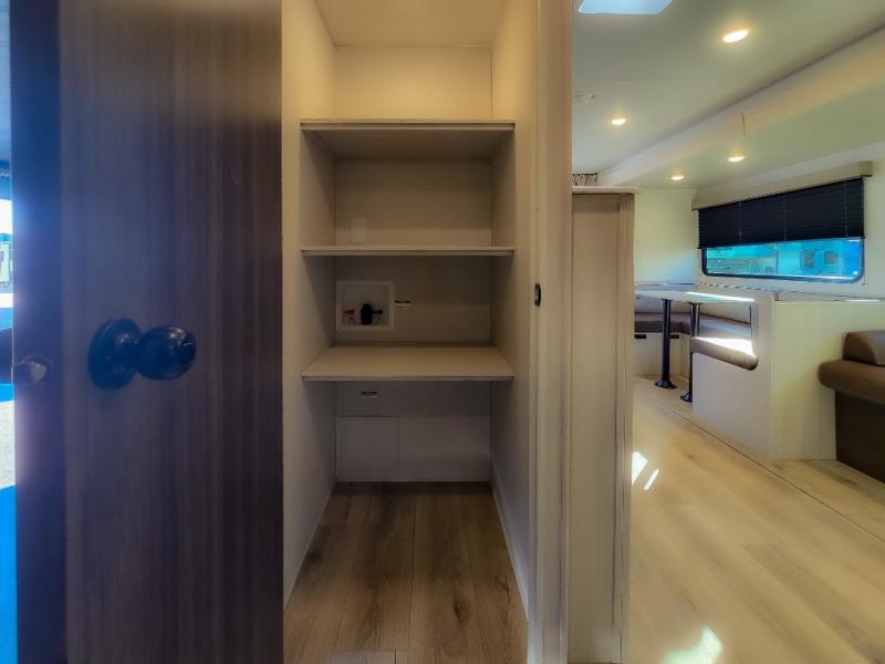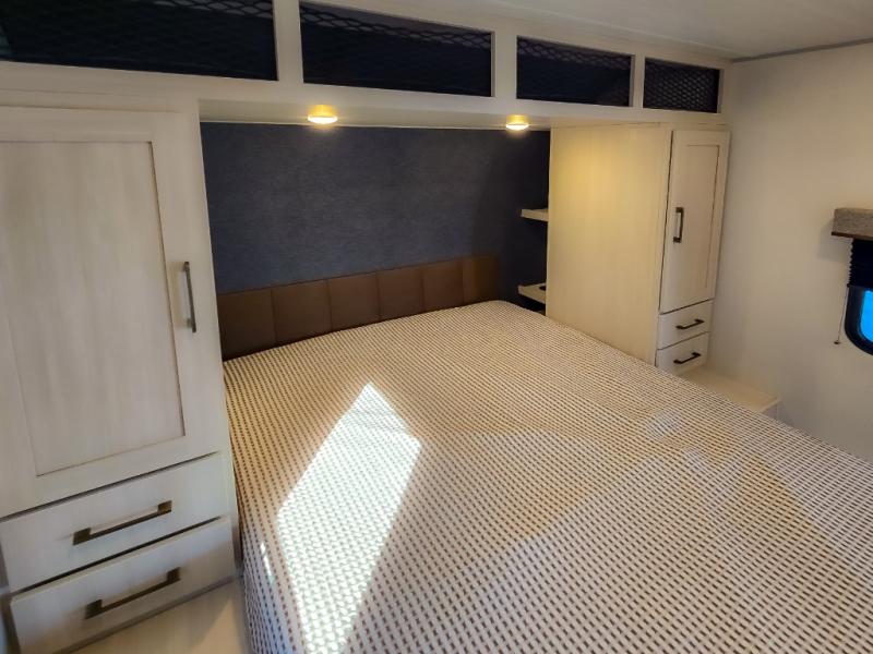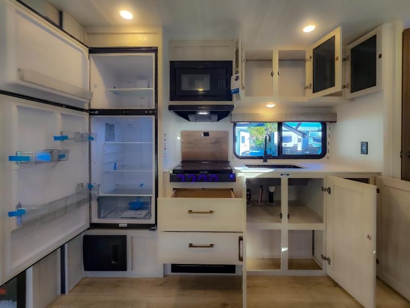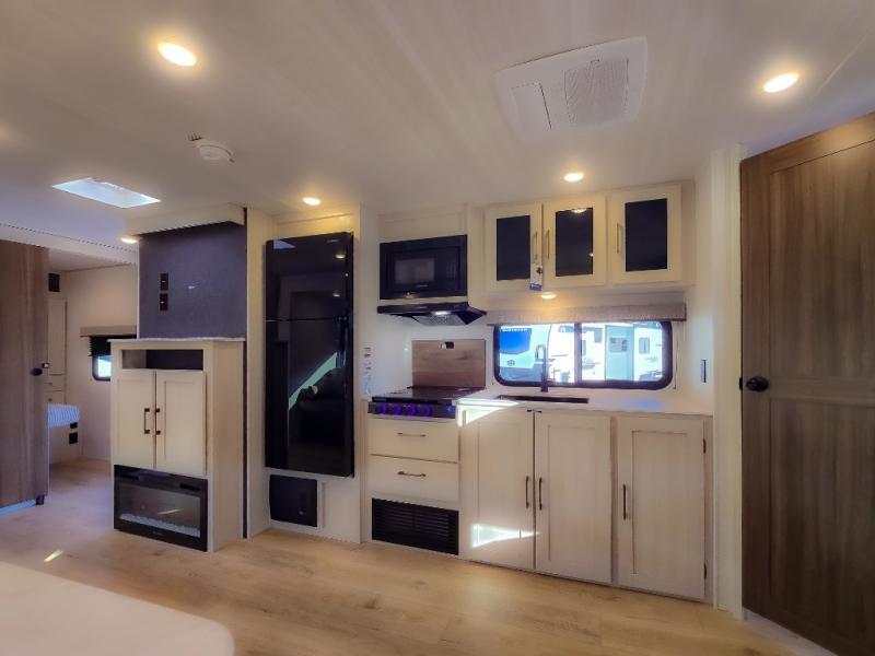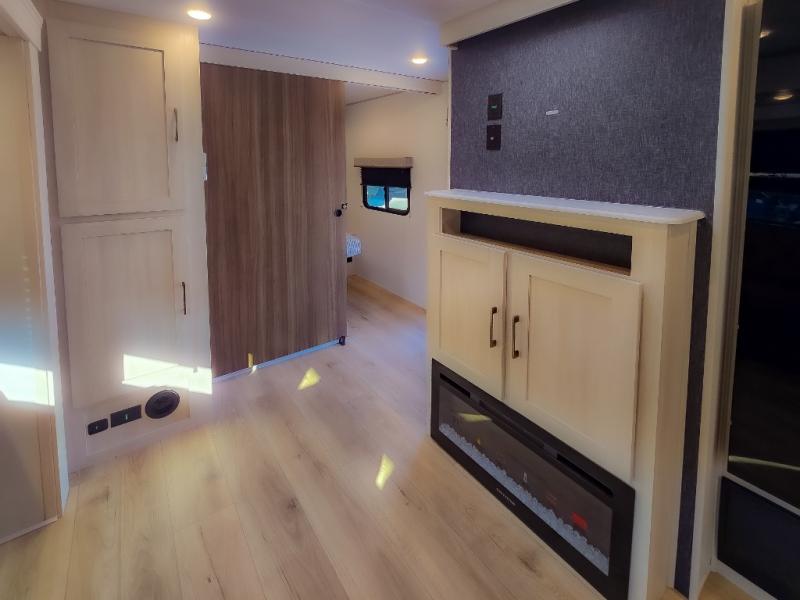 Head to your favorite camping spot with your favorite people in this spacious, dual entry travel trailer! The large slide out houses the U-shaped dinette and sofa where you can relax in the evenings and even let guests sleep over who haven't claimed the double-size bunks. A full bath with its own exterior entry door is convenient for all, and the full kitchen lets you whip up your best meals in the microwave with an air fryer. There is also a walk-in pantry with washer and dryer prep, which gives you the option to add those appliances. When it's time to call it a night, the front private bedroom with a queen bed will provide you with your own space to retreat to, and there are dual bedside wardrobes to keep your clothes organized.