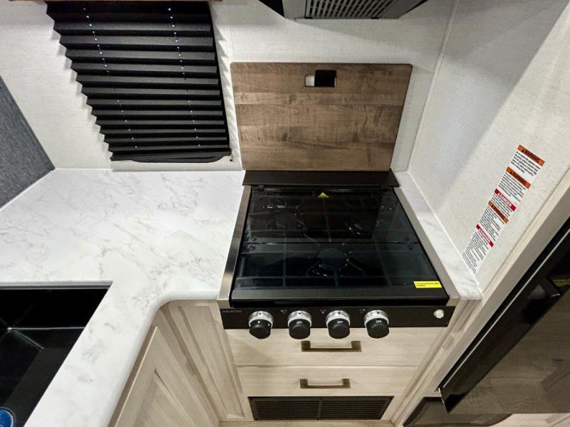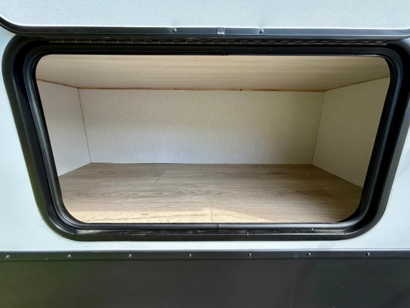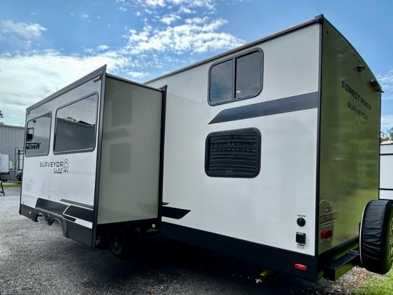 Value and versatility go hand-in-hand with the Surveyor Camp Series travel trailers by Forest River. The solid construction includes a 2" aluminum framed floor with block foam insulation and a sealed underbelly with forced heat and radiant foil insulation. A 100-watt roof mounted solar panel will provide some off-grid power, and the power tongue jack will let you easily hitch up and go whenever you're ready. Additional stand-out features include Surf(X) seamless countertops throughout, two A/C units, an electric awning with LED light strip, black glass friction hinge entry door(s), and so much more!