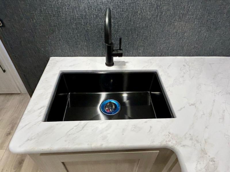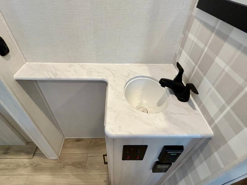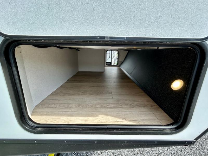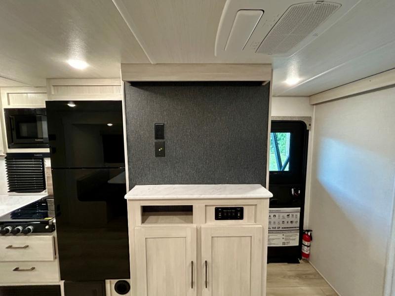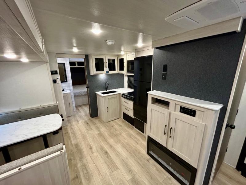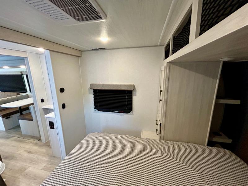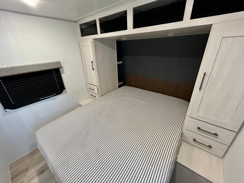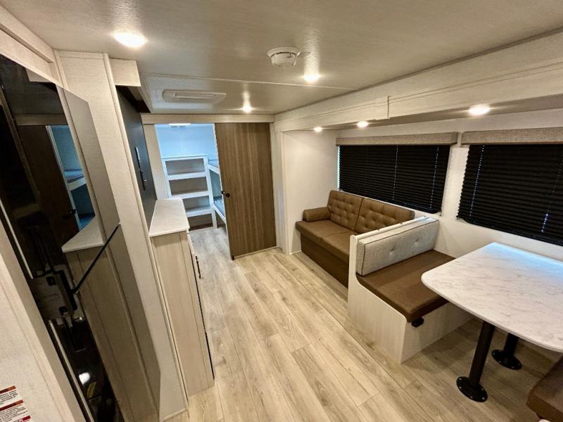 Head to your favorite camping spot with your favorite people in this spacious, dual entry travel trailer! The large slide out houses the booth dinette and sofa where you can relax in the evenings and even let guests sleep over who haven't claimed the quad bunks in the rear bunkhouse. A walk-thru bath is convenient for all, and the full kitchen lets you whip up your best meals in the microwave with an air fryer. And a walk-in pantry with washer and dryer prep makes it easier to go full-time if you choose! When it's time to call it a night, the front master bedroom with a queen bed will provide you with your own space to retreat to, and there are dual bedside wardrobes to keep your clothes organized.