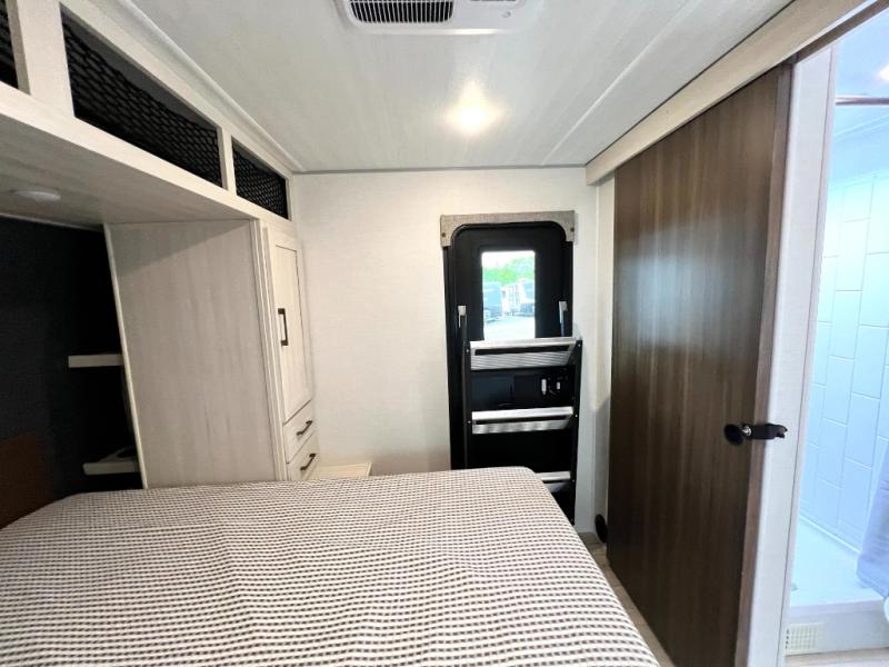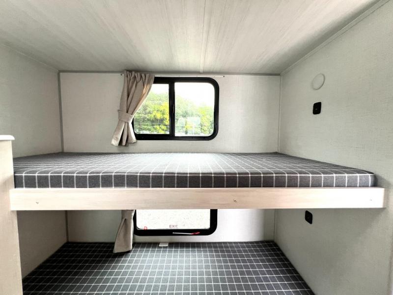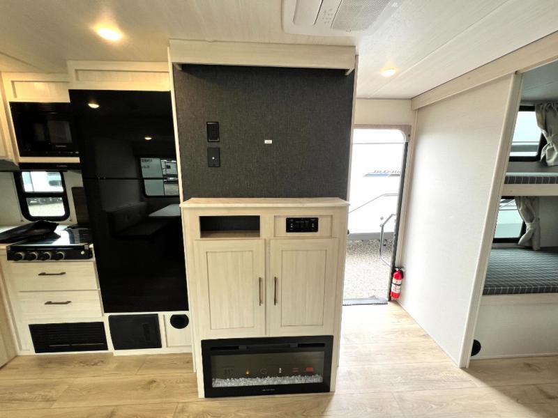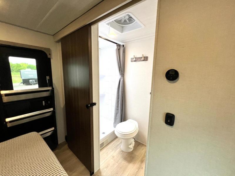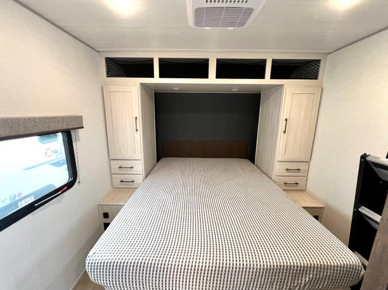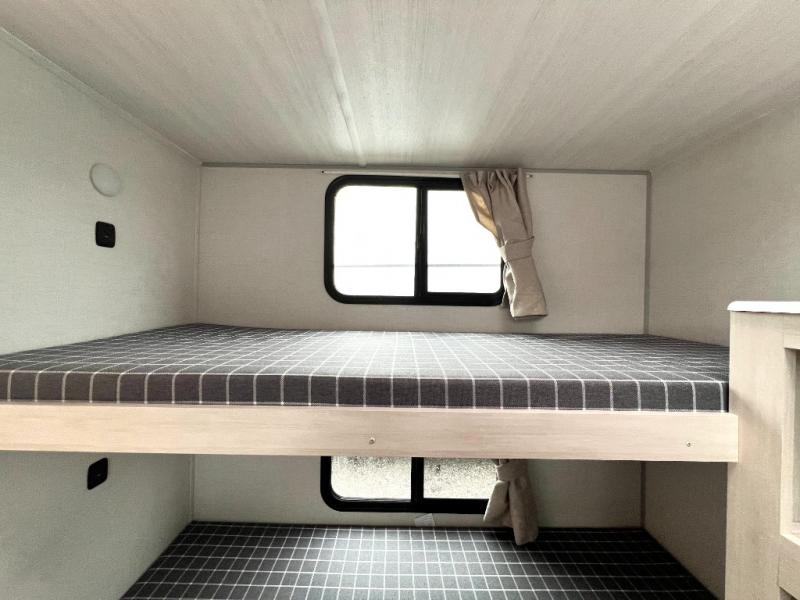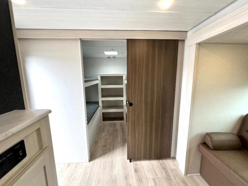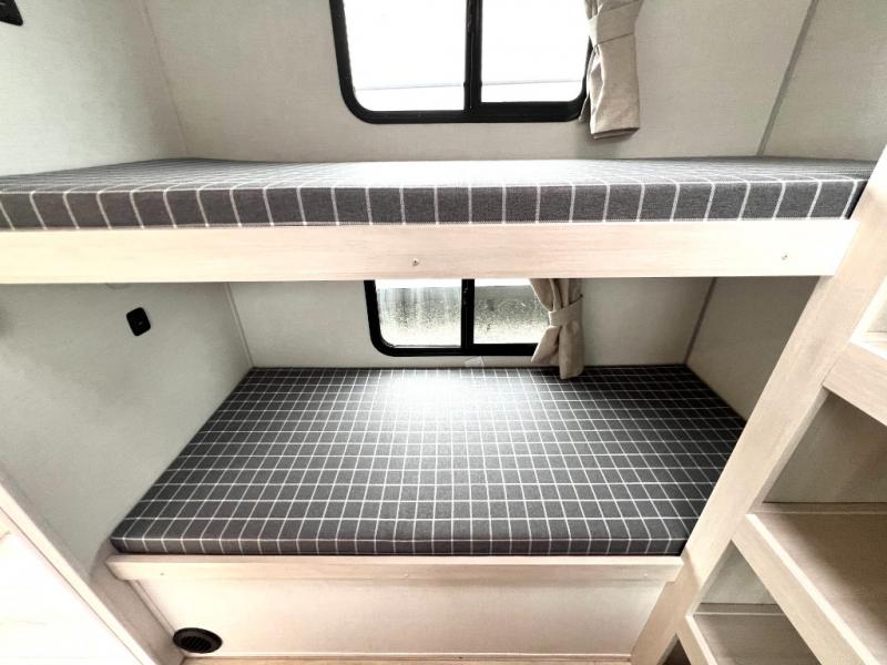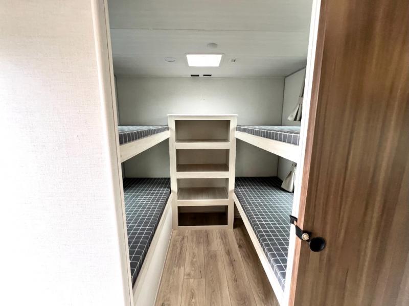 Head to your favorite camping spot with your favorite people in this spacious, dual entry travel trailer! The large slide out houses the booth dinette and sofa where you can relax in the evenings and even let guests sleep over who haven't claimed the quad bunks in the rear bunkhouse. A walk-thru bath is convenient for all, and the full kitchen lets you whip up your best meals in the microwave with an air fryer. And a walk-in pantry with washer and dryer prep makes it easier to go full-time if you choose! When it's time to call it a night, the front master bedroom with a queen bed will provide you with your own space to retreat to, and there are dual bedside wardrobes to keep your clothes organized.