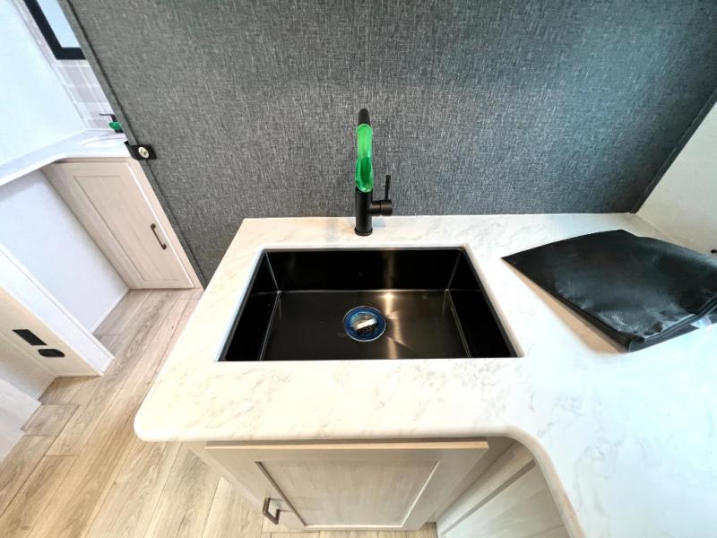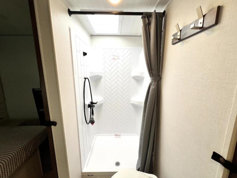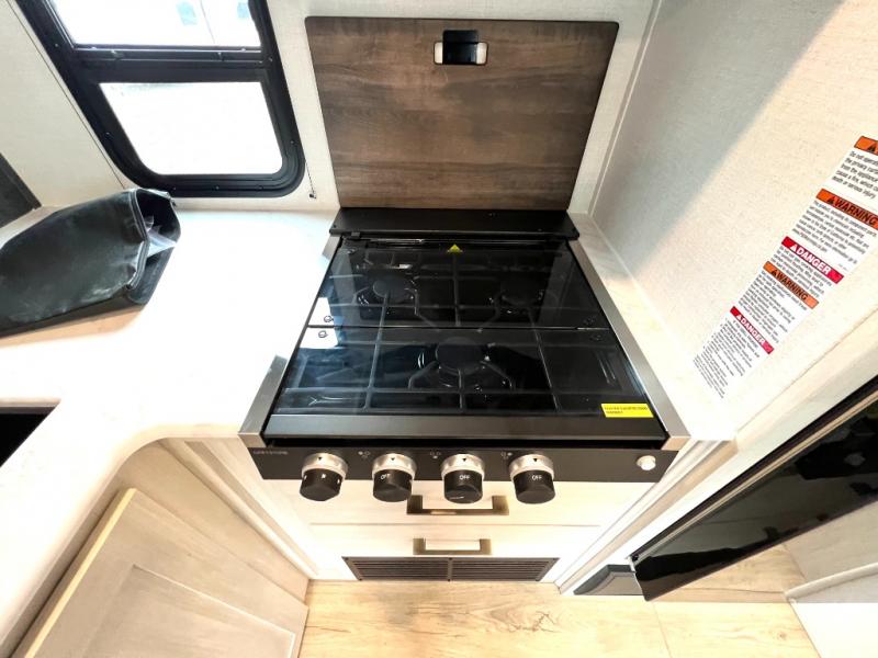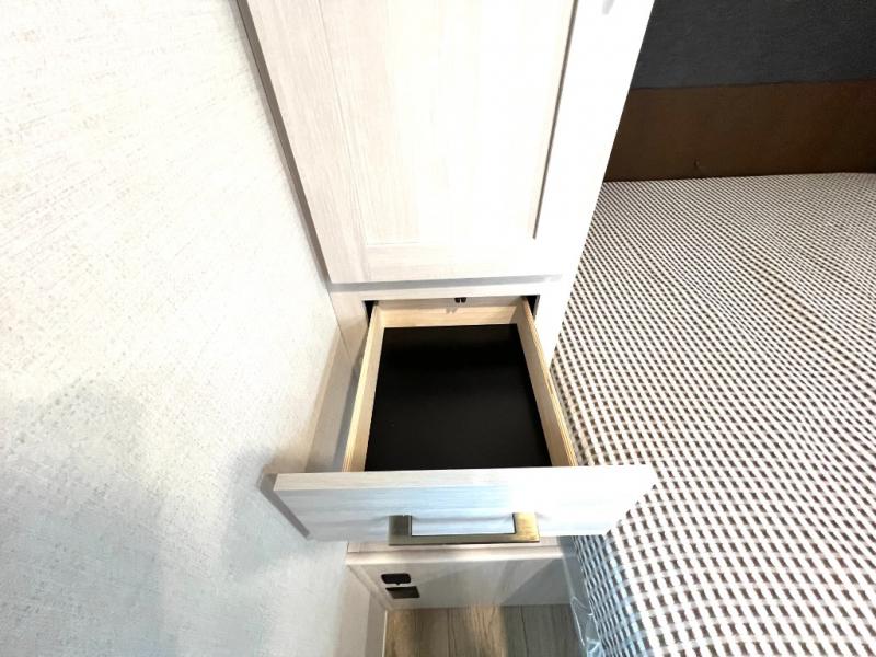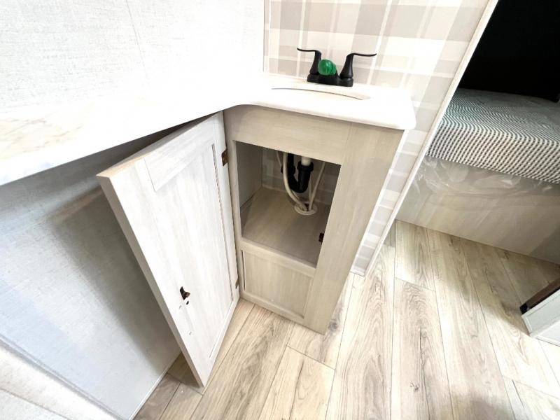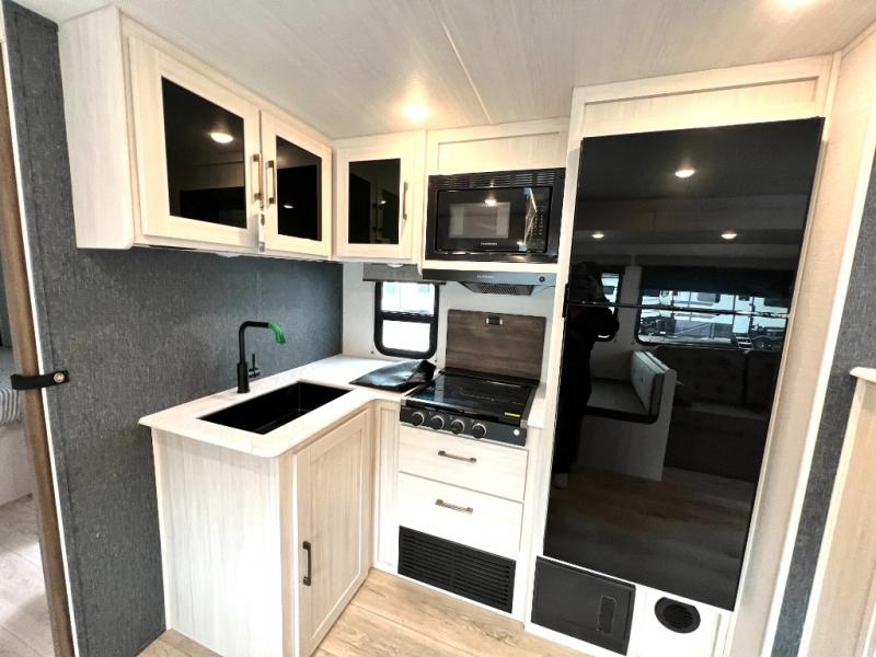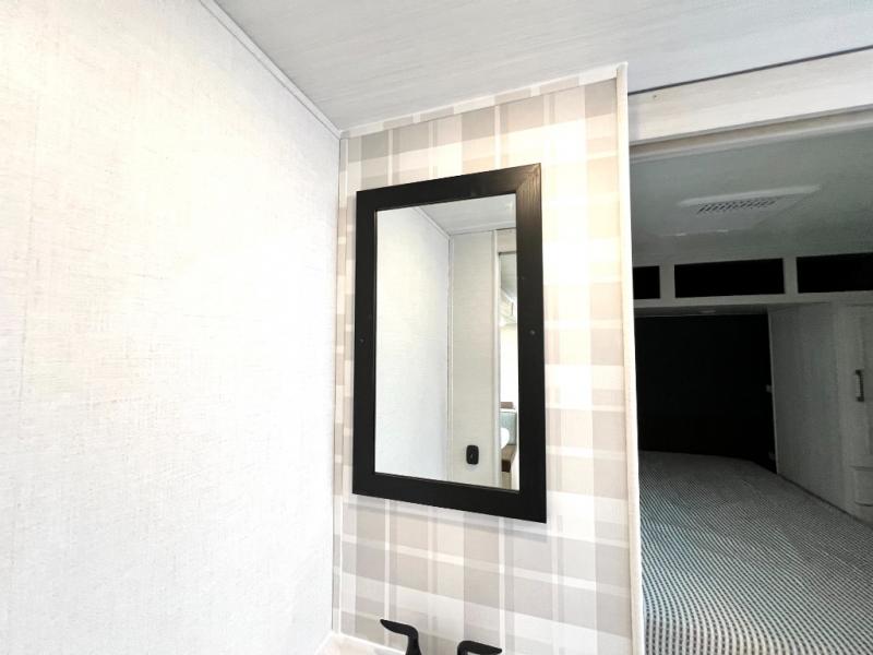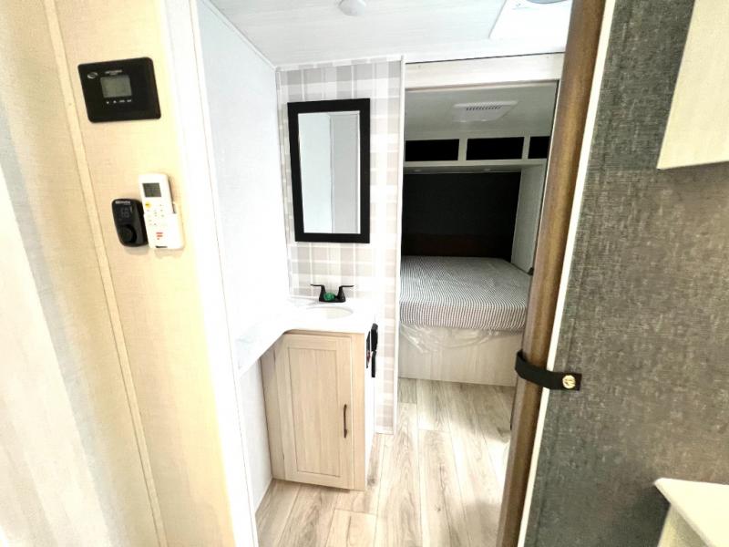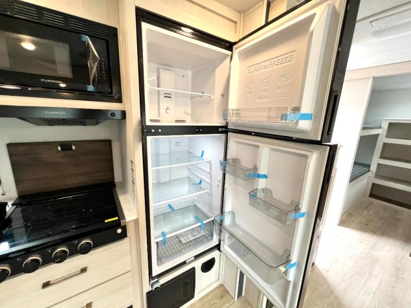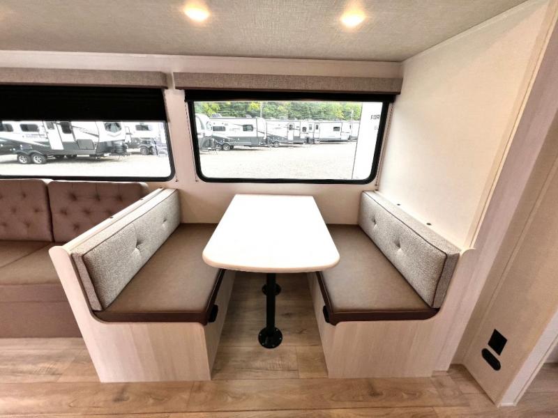 Head to your favorite camping spot with your favorite people in this spacious, dual entry travel trailer! The large slide out houses the booth dinette and sofa where you can relax in the evenings and even let guests sleep over who haven't claimed the quad bunks in the rear bunkhouse. A walk-thru bath is convenient for all, and the full kitchen lets you whip up your best meals in the microwave with an air fryer. And a walk-in pantry with washer and dryer prep makes it easier to go full-time if you choose! When it's time to call it a night, the front master bedroom with a queen bed will provide you with your own space to retreat to, and there are dual bedside wardrobes to keep your clothes organized.