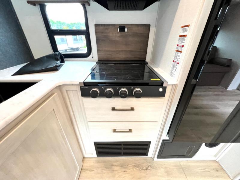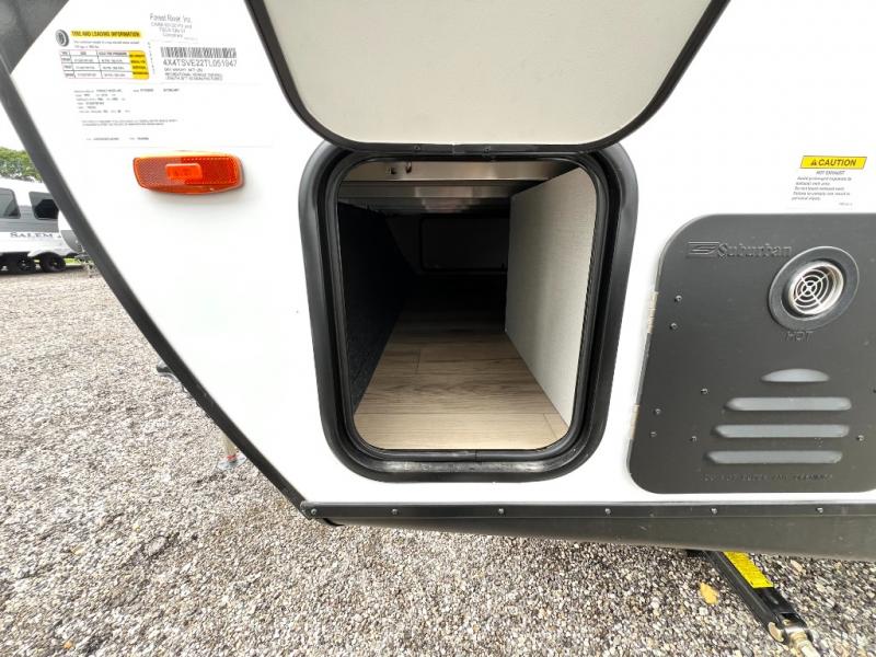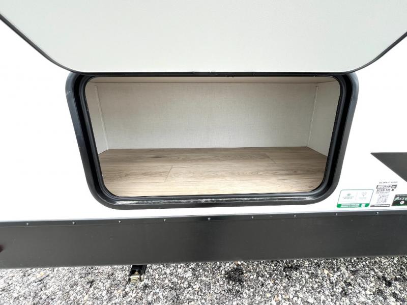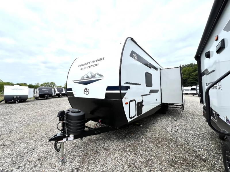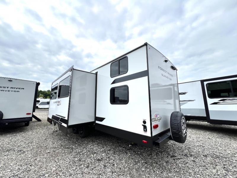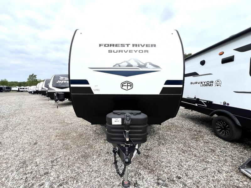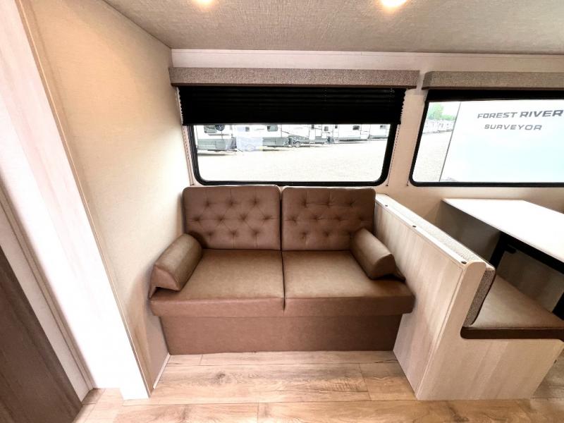 Value and versatility go hand-in-hand with the Surveyor Camp Series travel trailers by Forest River. The solid construction includes a 2" aluminum framed floor with block foam insulation and a sealed underbelly with forced heat and radiant foil insulation. A 100-watt roof mounted solar panel will provide some off-grid power, and the power tongue jack will let you easily hitch up and go whenever you're ready. Additional stand-out features include Surf(X) seamless countertops throughout, two A/C units, an electric awning with LED light strip, black glass friction hinge entry door(s), and so much more!