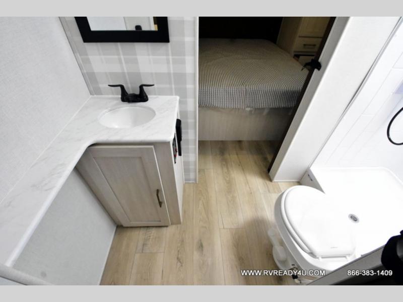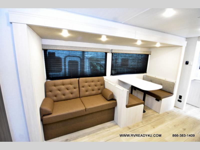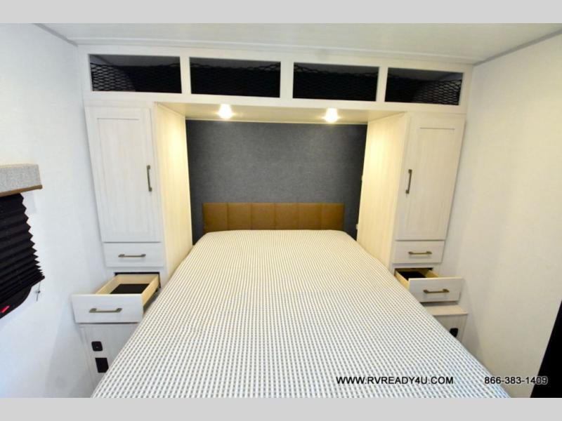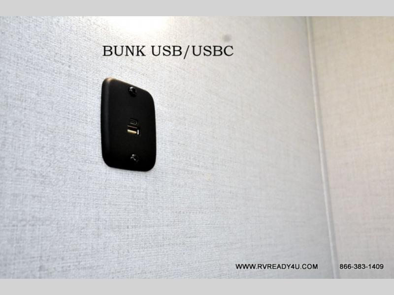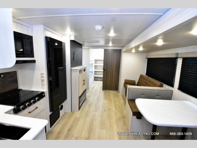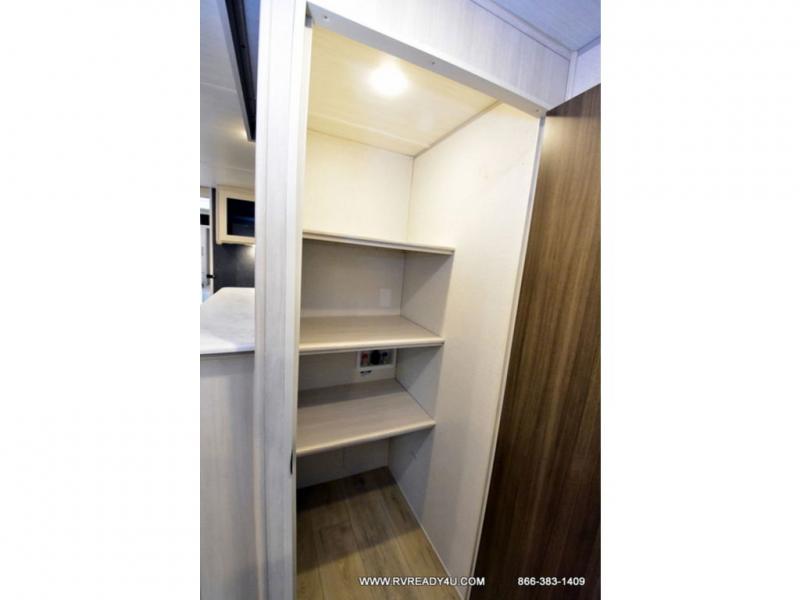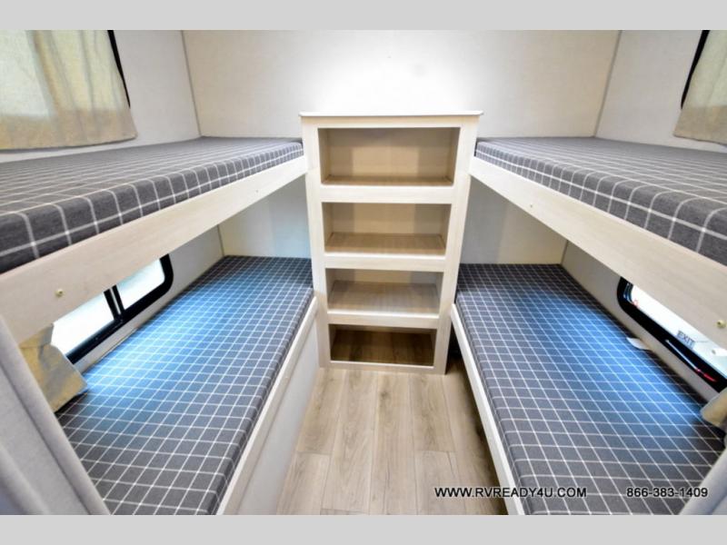 Head to your favorite camping spot with your favorite people in this spacious, dual entry travel trailer! The large slide out houses the booth dinette and sofa where you can relax in the evenings and even let guests sleep over who haven't claimed the quad bunks in the rear bunkhouse. A walk-thru bath is convenient for all, and the full kitchen lets you whip up your best meals in the microwave with an air fryer. And a walk-in pantry with washer and dryer prep makes it easier to go full-time if you choose! When it's time to call it a night, the front master bedroom with a queen bed will provide you with your own space to retreat to, and there are dual bedside wardrobes to keep your clothes organized.