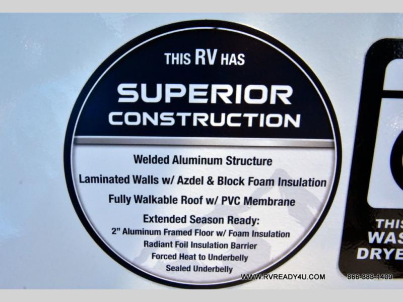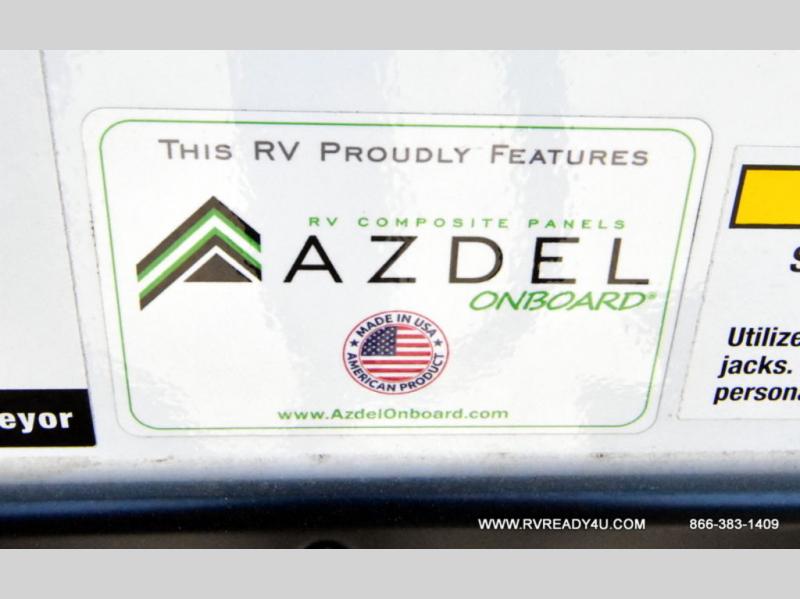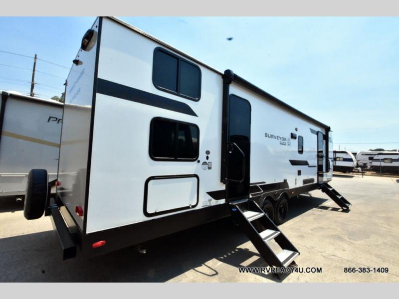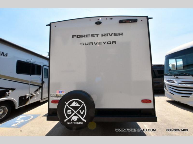 Value and versatility go hand-in-hand with the Surveyor Camp Series travel trailers by Forest River. The solid construction includes a 2" aluminum framed floor with block foam insulation and a sealed underbelly with forced heat and radiant foil insulation. A 100-watt roof mounted solar panel will provide some off-grid power, and the power tongue jack will let you easily hitch up and go whenever you're ready. Additional stand-out features include Surf(X) seamless countertops throughout, two A/C units, an electric awning with LED light strip, black glass friction hinge entry door(s), and so much more!