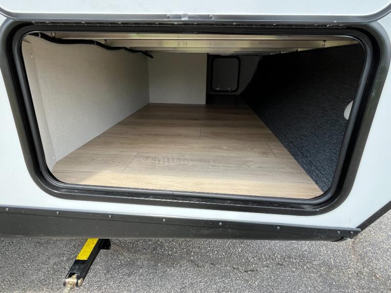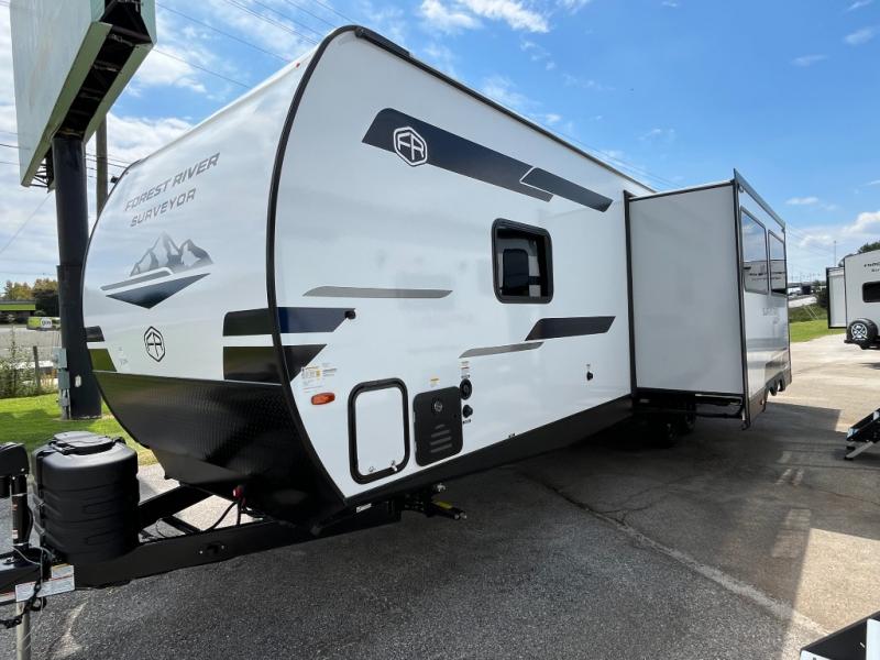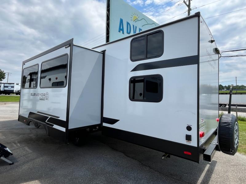 Value and versatility go hand-in-hand with the Surveyor Camp Series travel trailers by Forest River. The solid construction includes a 2" aluminum framed floor with block foam insulation and a sealed underbelly with forced heat and radiant foil insulation. A 100-watt roof mounted solar panel will provide some off-grid power, and the power tongue jack will let you easily hitch up and go whenever you're ready. Additional stand-out features include Surf(X) seamless countertops throughout, two A/C units, an electric awning with LED light strip, black glass friction hinge entry door(s), and so much more!