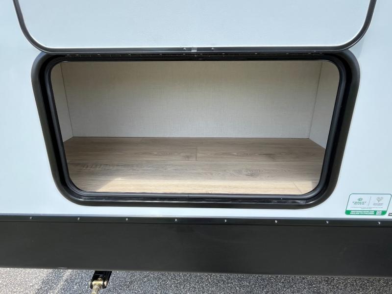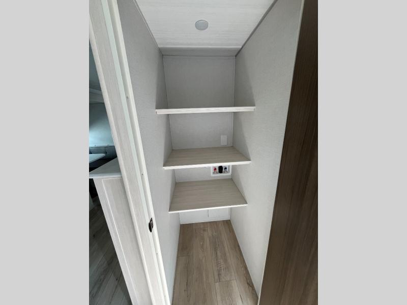 Head to your favorite camping spot with your favorite people in this spacious, dual entry travel trailer! The large slide out houses the booth dinette and sofa where you can relax in the evenings and even let guests sleep over who haven't claimed the quad bunks in the rear bunkhouse. A walk-thru bath is convenient for all, and the full kitchen lets you whip up your best meals in the microwave with an air fryer. And a walk-in pantry with washer and dryer prep makes it easier to go full-time if you choose! When it's time to call it a night, the front master bedroom with a queen bed will provide you with your own space to retreat to, and there are dual bedside wardrobes to keep your clothes organized.