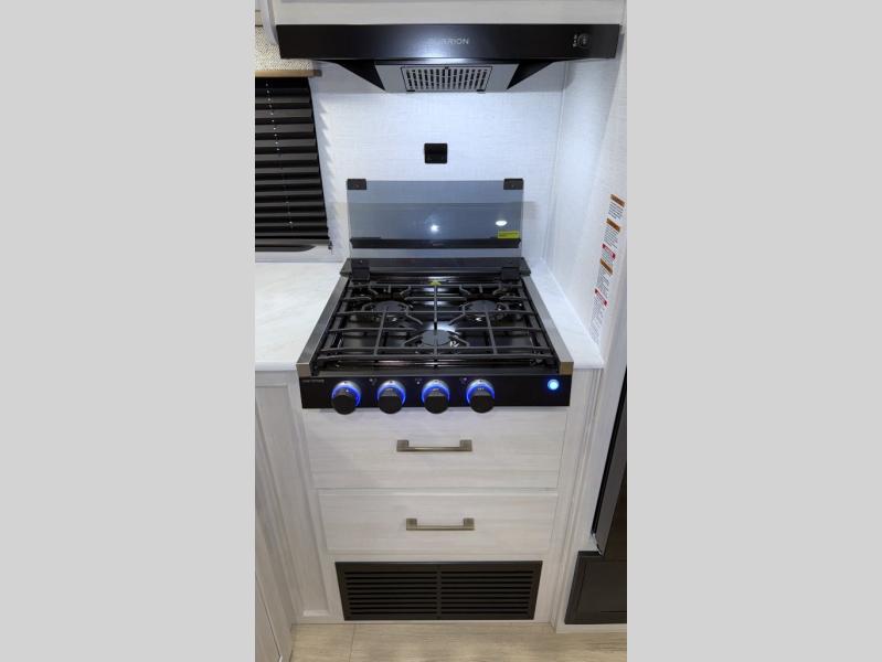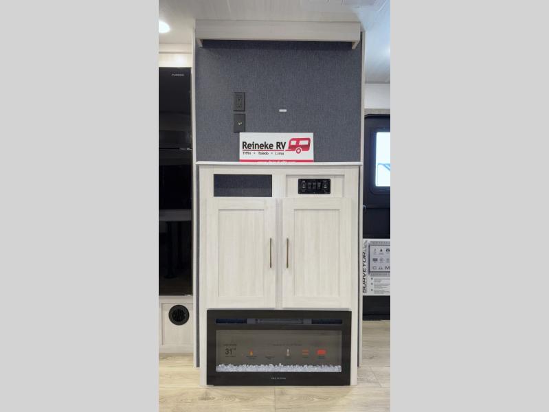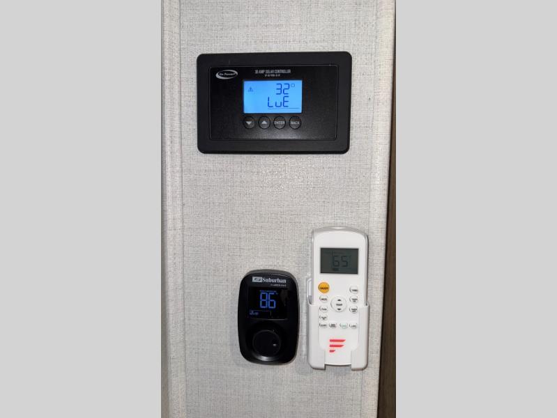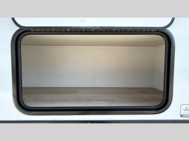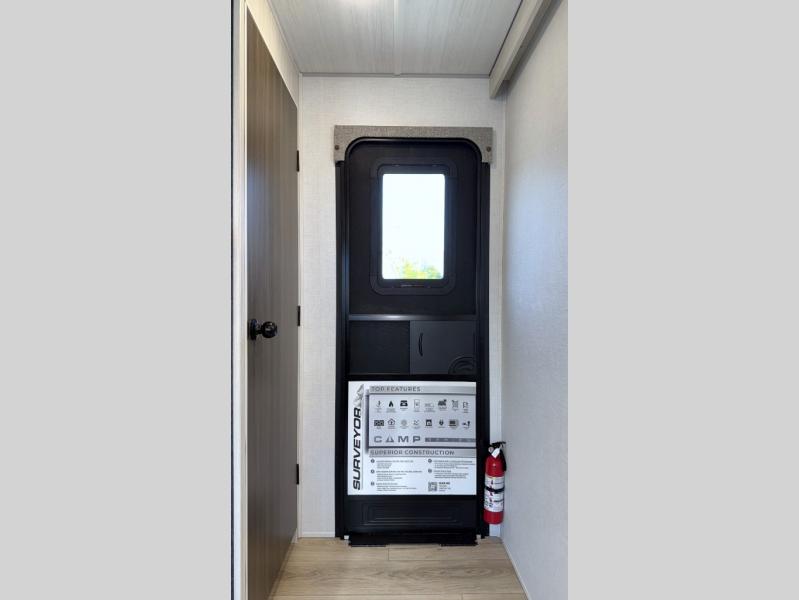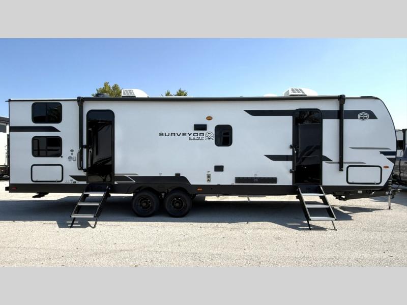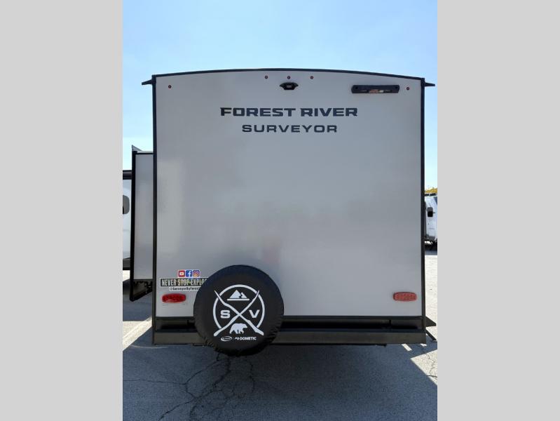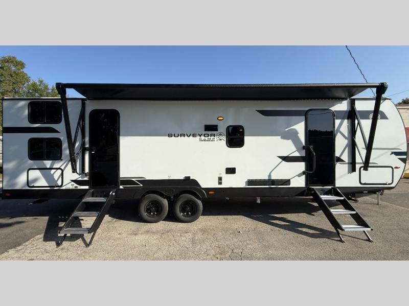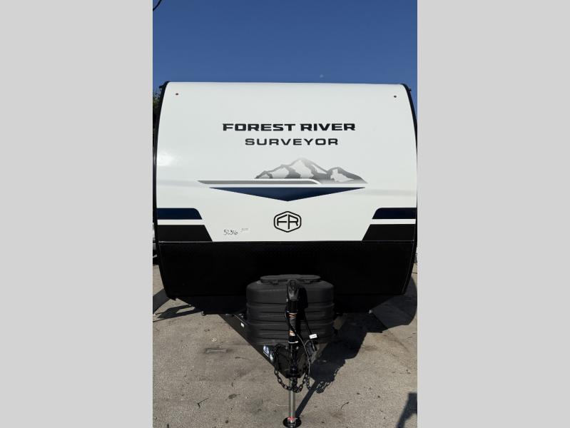 Value and versatility go hand-in-hand with the Surveyor Camp Series travel trailers by Forest River. The solid construction includes a 2" aluminum framed floor with block foam insulation and a sealed underbelly with forced heat and radiant foil insulation. A 100-watt roof mounted solar panel will provide some off-grid power, and the power tongue jack will let you easily hitch up and go whenever you're ready. Additional stand-out features include Surf(X) seamless countertops throughout, two A/C units, an electric awning with LED light strip, black glass friction hinge entry door(s), and so much more!