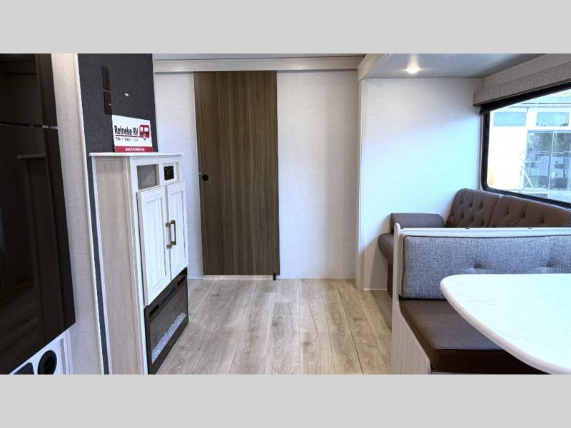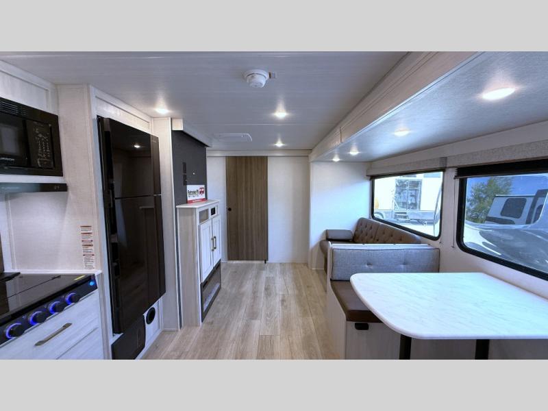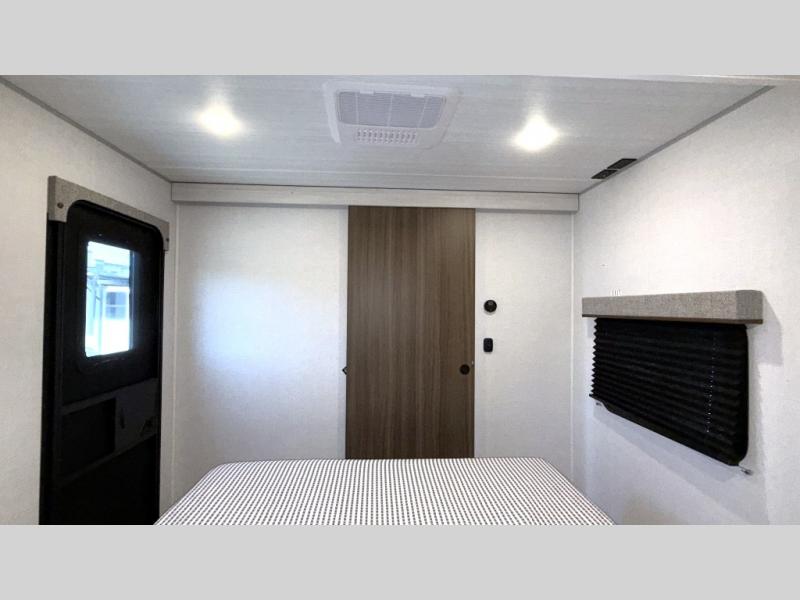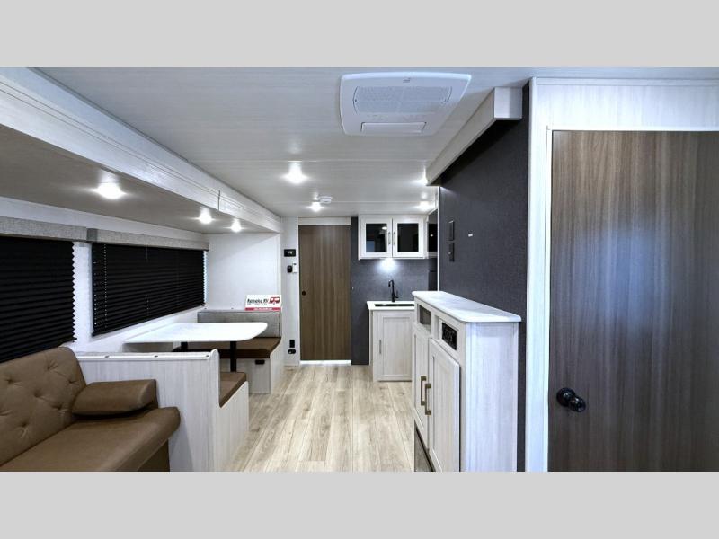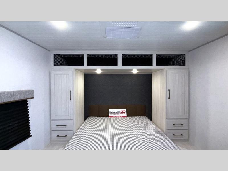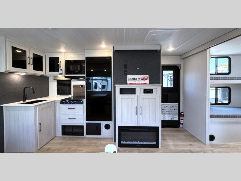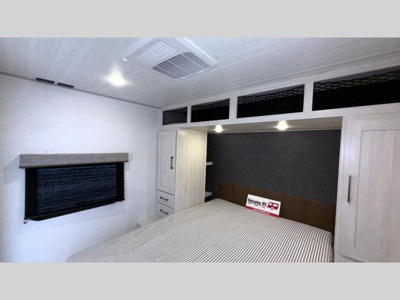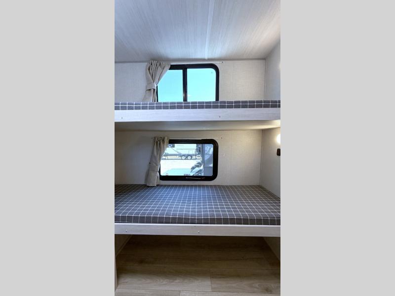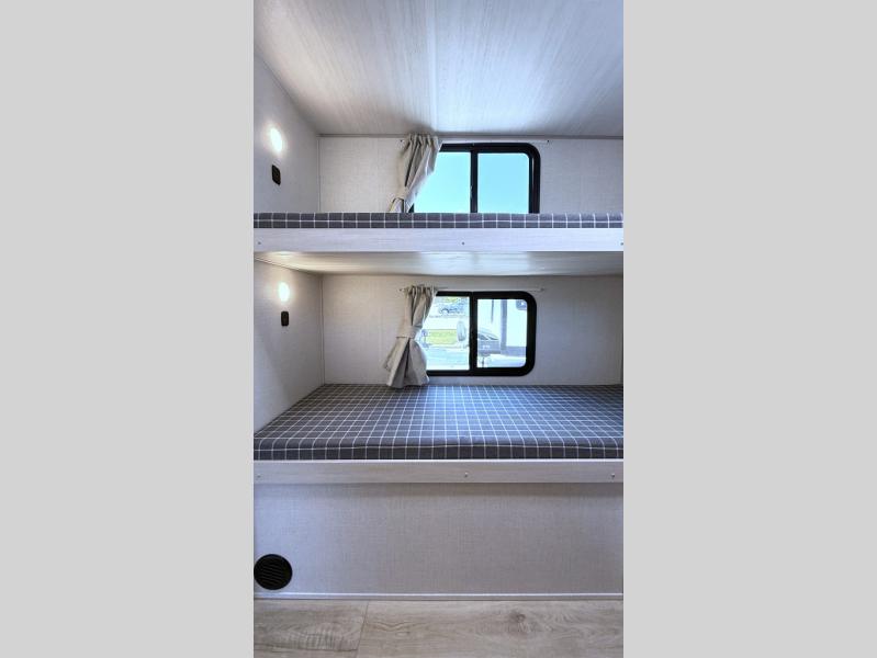 Head to your favorite camping spot with your favorite people in this spacious, dual entry travel trailer! The large slide out houses the booth dinette and sofa where you can relax in the evenings and even let guests sleep over who haven't claimed the quad bunks in the rear bunkhouse. A walk-thru bath is convenient for all, and the full kitchen lets you whip up your best meals in the microwave with an air fryer. And a walk-in pantry with washer and dryer prep makes it easier to go full-time if you choose! When it's time to call it a night, the front master bedroom with a queen bed will provide you with your own space to retreat to, and there are dual bedside wardrobes to keep your clothes organized.