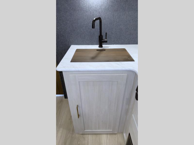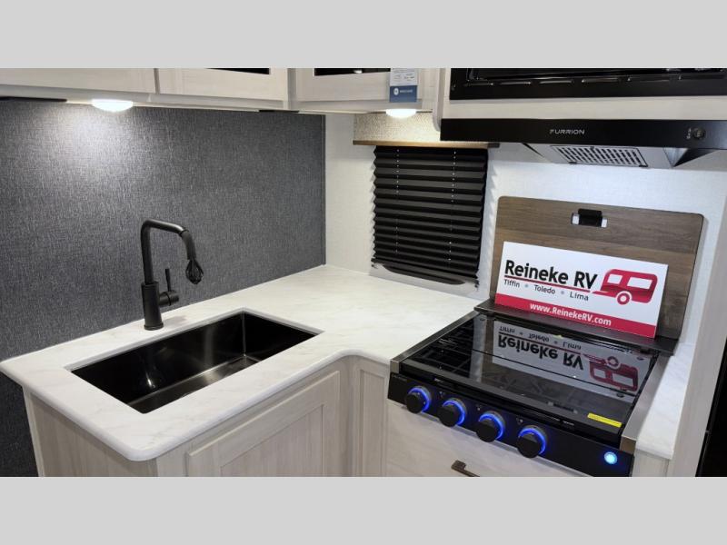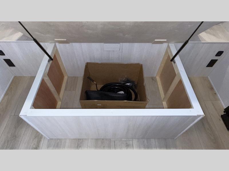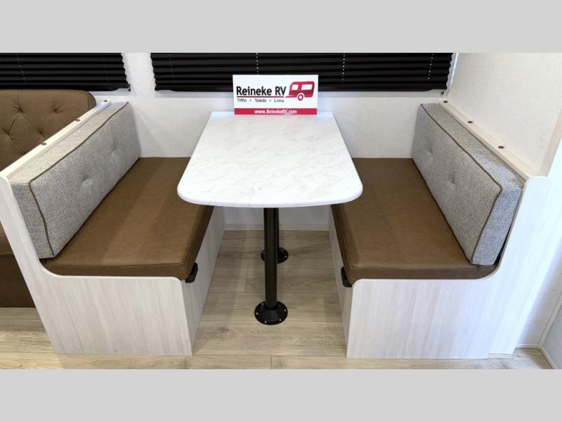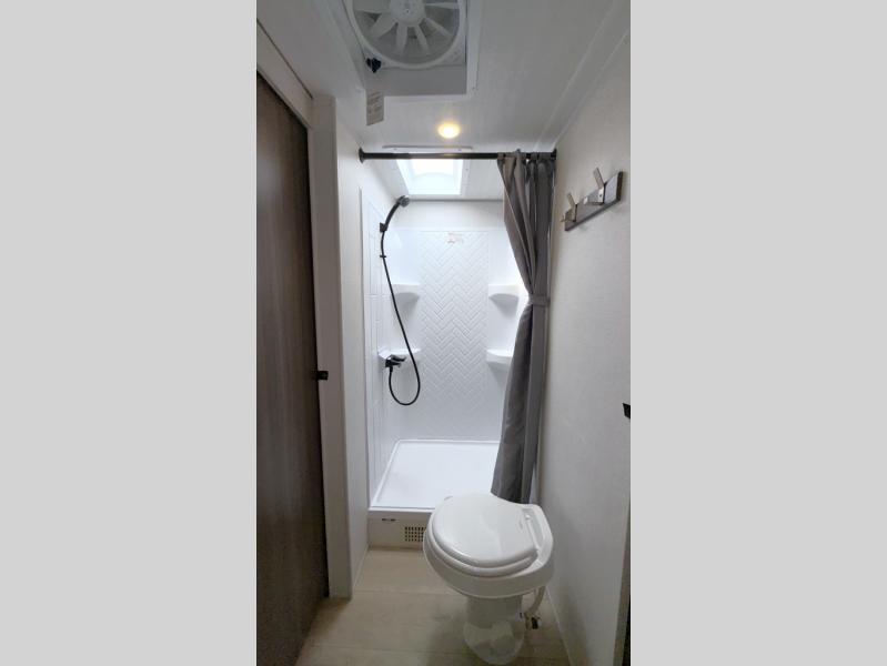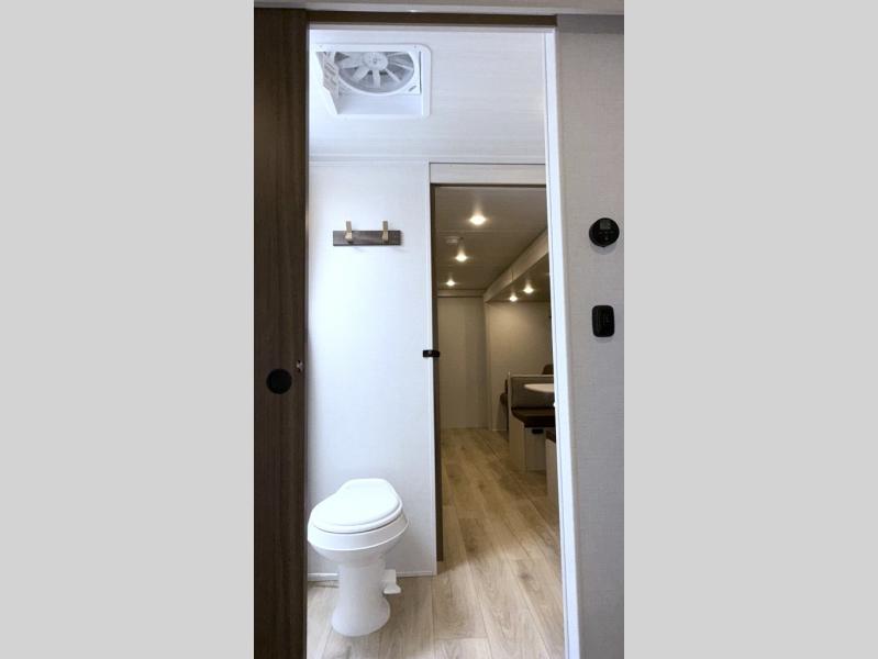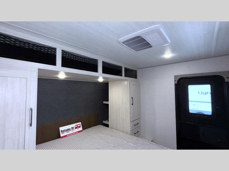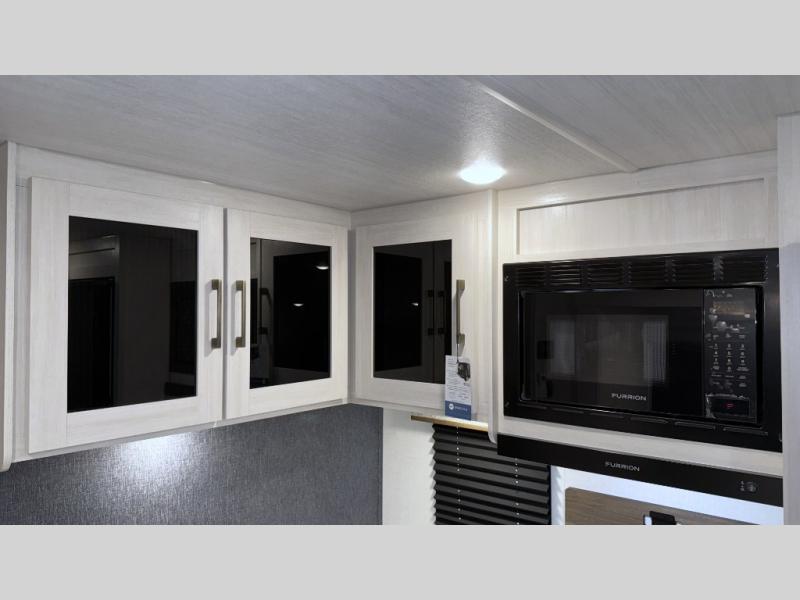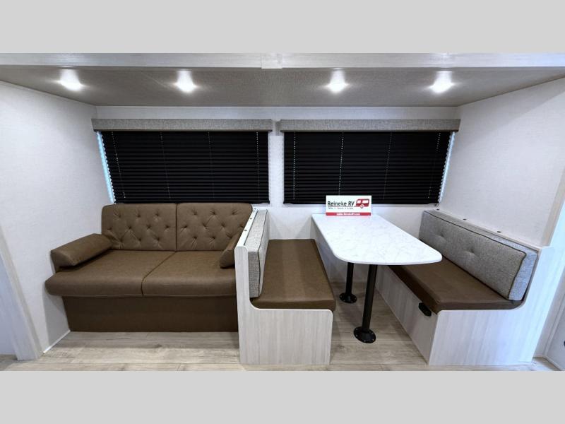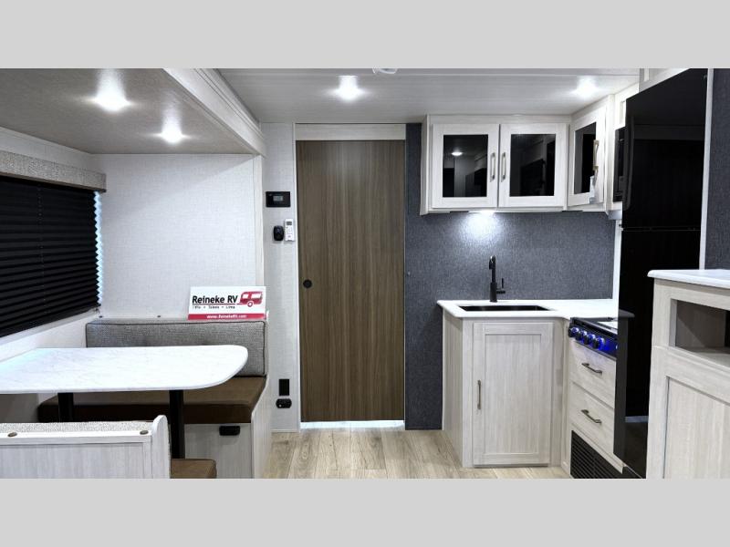 Head to your favorite camping spot with your favorite people in this spacious, dual entry travel trailer! The large slide out houses the booth dinette and sofa where you can relax in the evenings and even let guests sleep over who haven't claimed the quad bunks in the rear bunkhouse. A walk-thru bath is convenient for all, and the full kitchen lets you whip up your best meals in the microwave with an air fryer. And a walk-in pantry with washer and dryer prep makes it easier to go full-time if you choose! When it's time to call it a night, the front master bedroom with a queen bed will provide you with your own space to retreat to, and there are dual bedside wardrobes to keep your clothes organized.