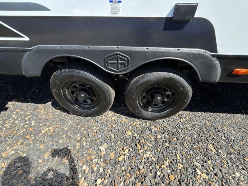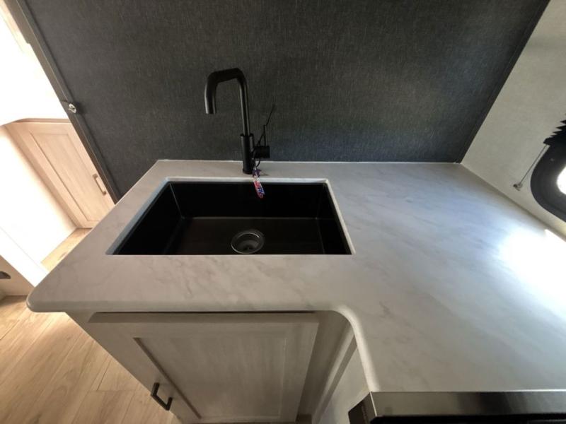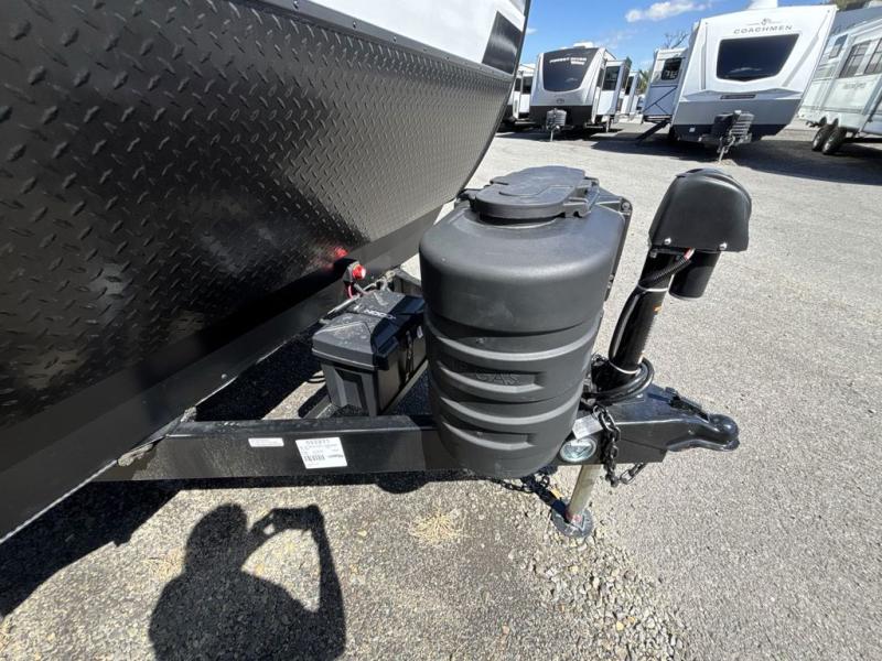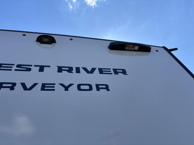 Value and versatility go hand-in-hand with the Surveyor Camp Series travel trailers by Forest River. The solid construction includes a 2" aluminum framed floor with block foam insulation and a sealed underbelly with forced heat and radiant foil insulation. A 100-watt roof mounted solar panel will provide some off-grid power, and the power tongue jack will let you easily hitch up and go whenever you're ready. Additional stand-out features include Surf(X) seamless countertops throughout, two A/C units, an electric awning with LED light strip, black glass friction hinge entry door(s), and so much more!