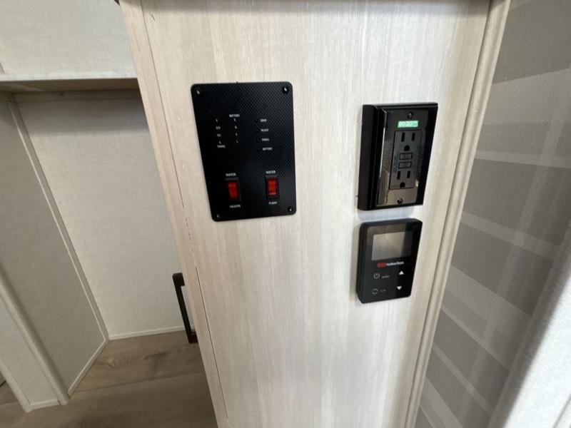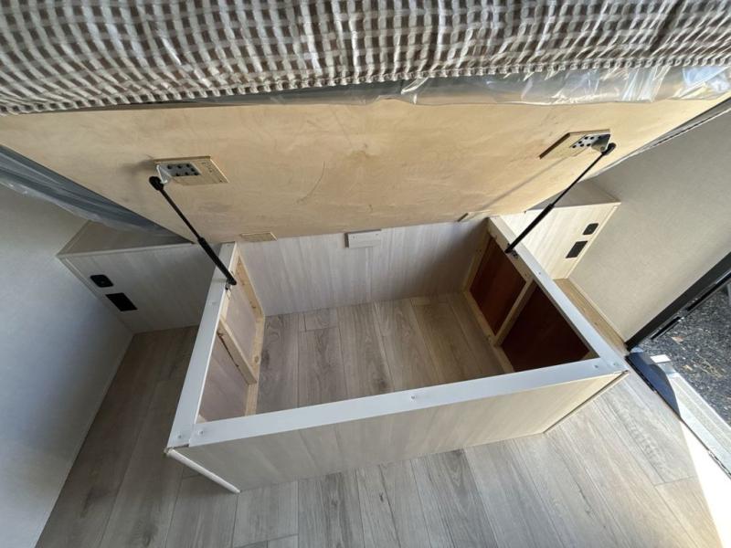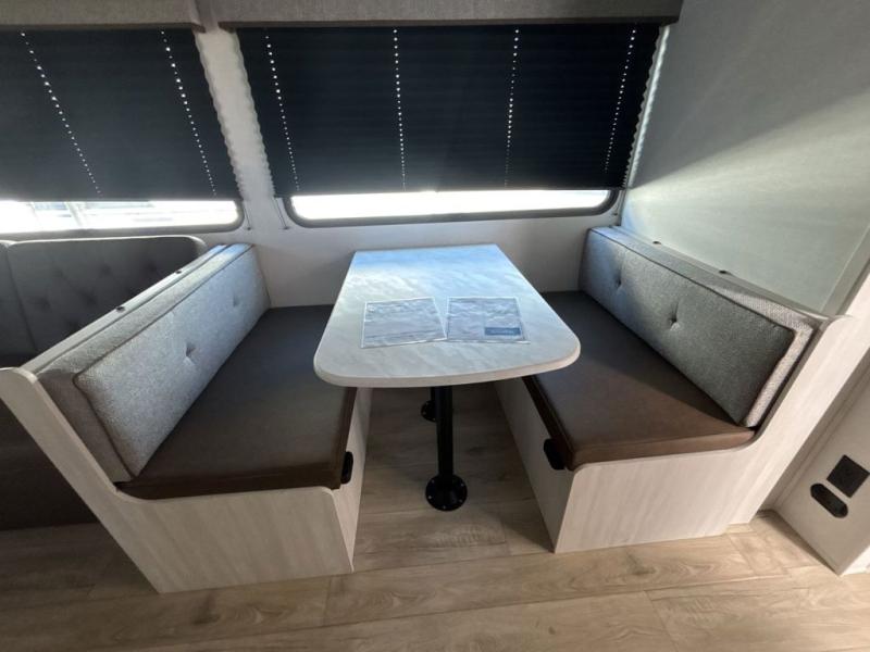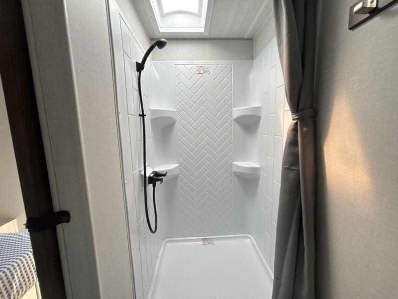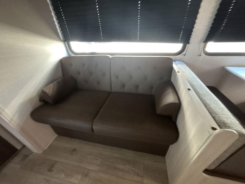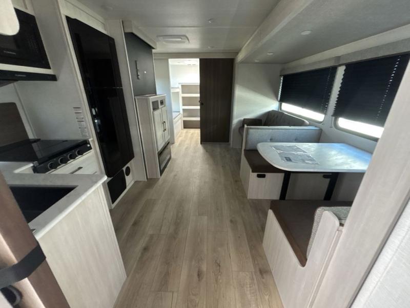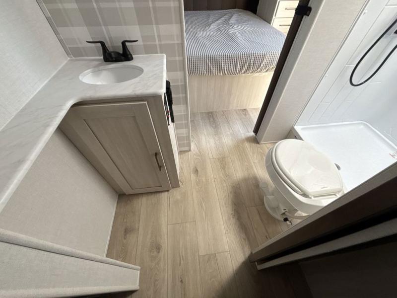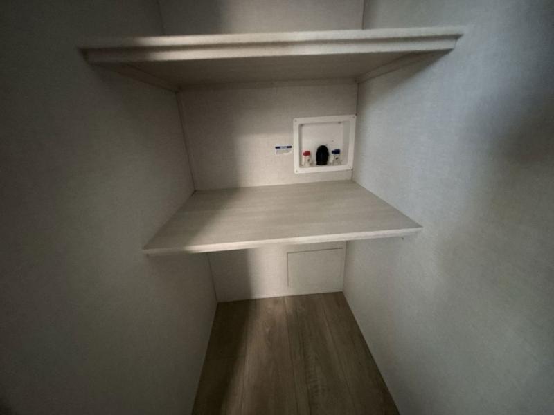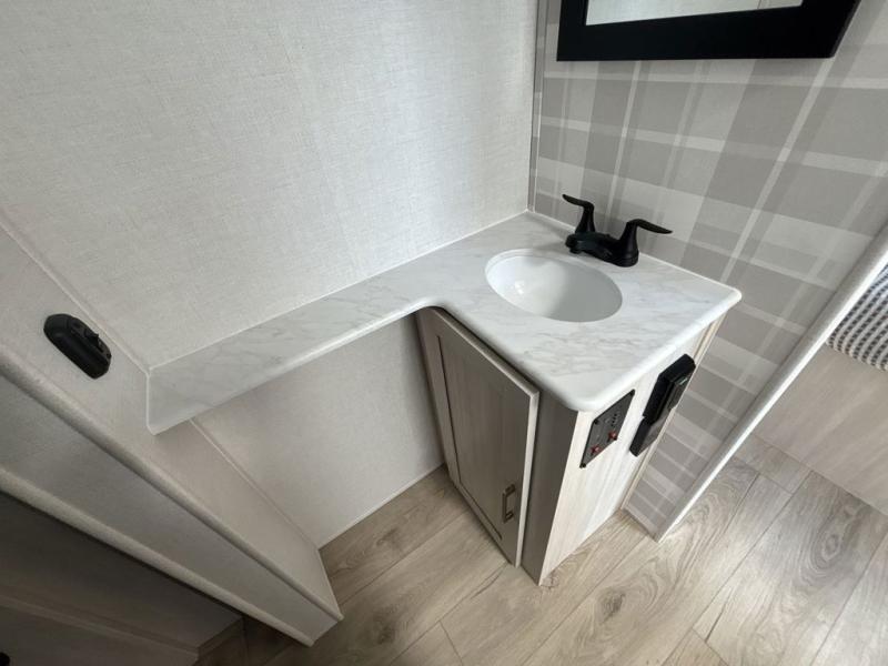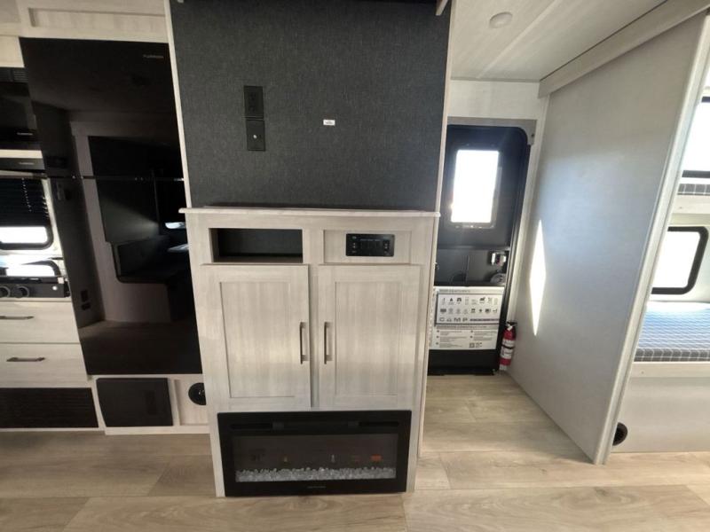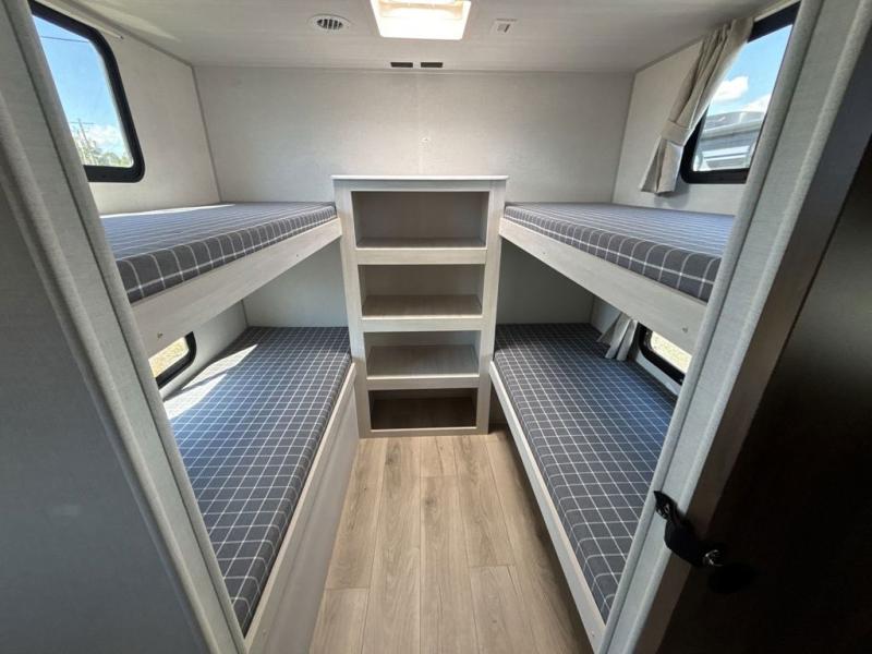 Head to your favorite camping spot with your favorite people in this spacious, dual entry travel trailer! The large slide out houses the booth dinette and sofa where you can relax in the evenings and even let guests sleep over who haven't claimed the quad bunks in the rear bunkhouse. A walk-thru bath is convenient for all, and the full kitchen lets you whip up your best meals in the microwave with an air fryer. And a walk-in pantry with washer and dryer prep makes it easier to go full-time if you choose! When it's time to call it a night, the front master bedroom with a queen bed will provide you with your own space to retreat to, and there are dual bedside wardrobes to keep your clothes organized.