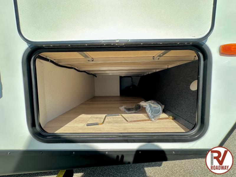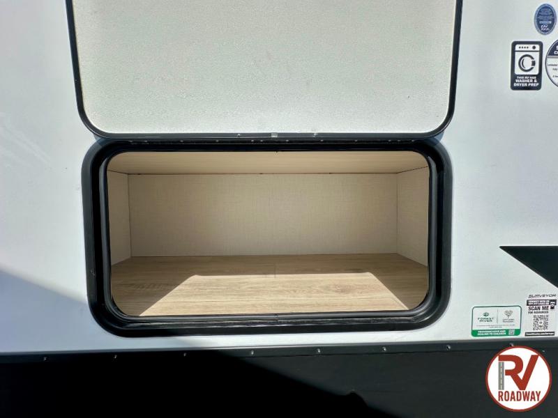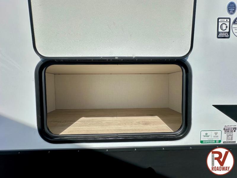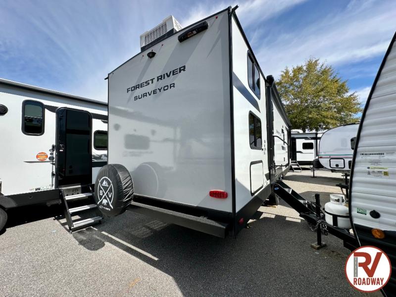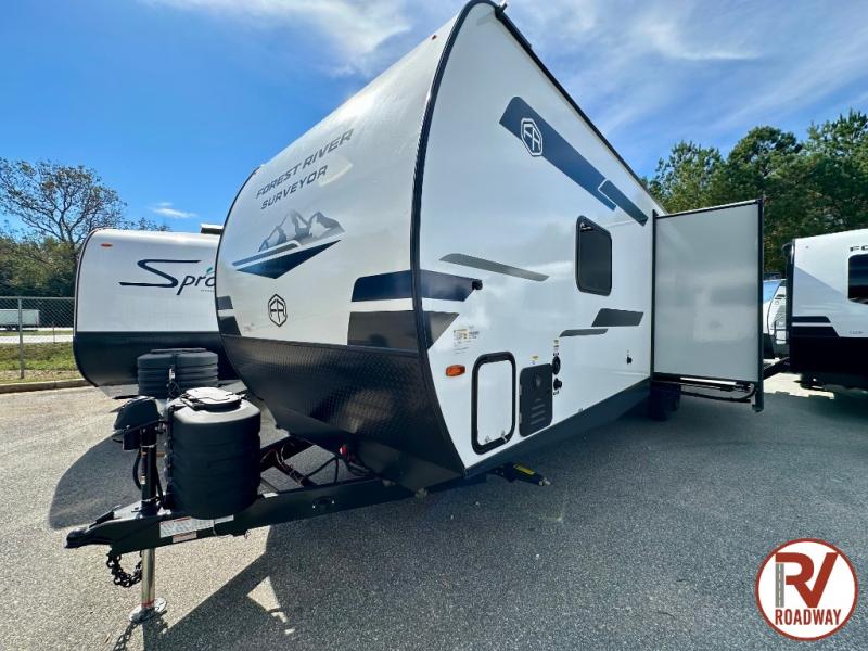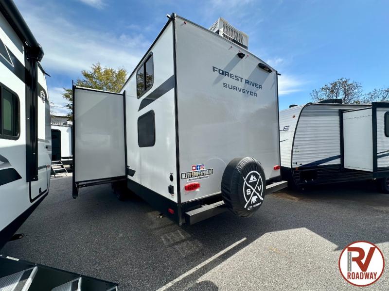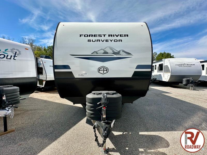 Value and versatility go hand-in-hand with the Surveyor Camp Series travel trailers by Forest River. The solid construction includes a 2" aluminum framed floor with block foam insulation and a sealed underbelly with forced heat and radiant foil insulation. A 100-watt roof mounted solar panel will provide some off-grid power, and the power tongue jack will let you easily hitch up and go whenever you're ready. Additional stand-out features include Surf(X) seamless countertops throughout, two A/C units, an electric awning with LED light strip, black glass friction hinge entry door(s), and so much more!