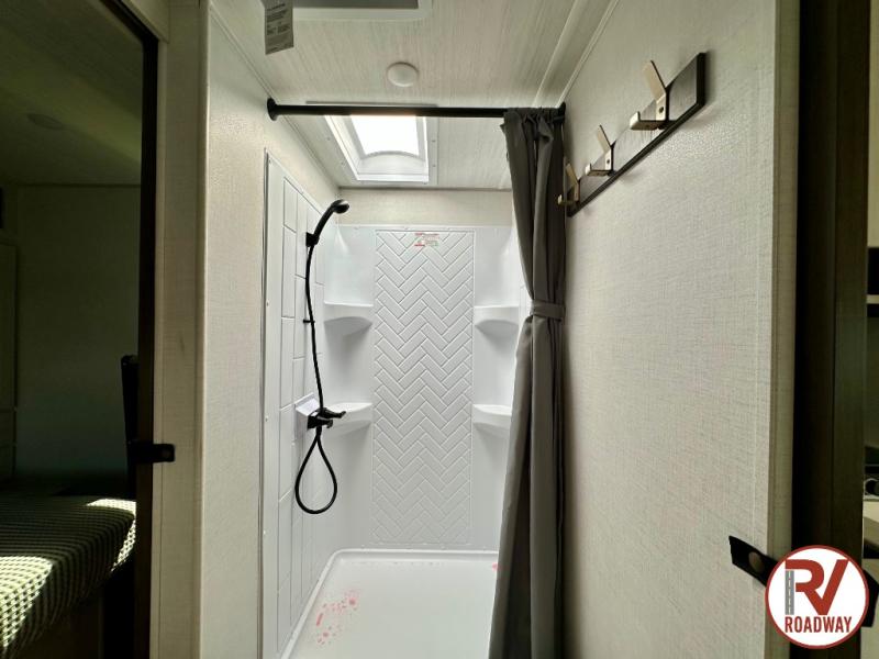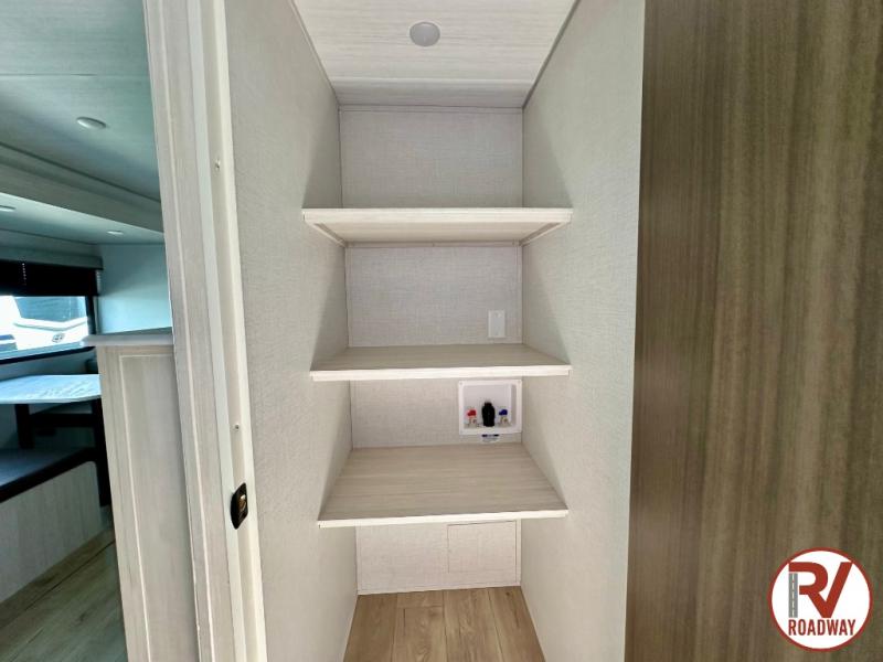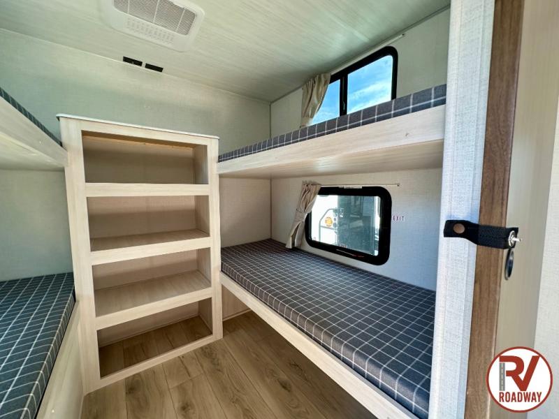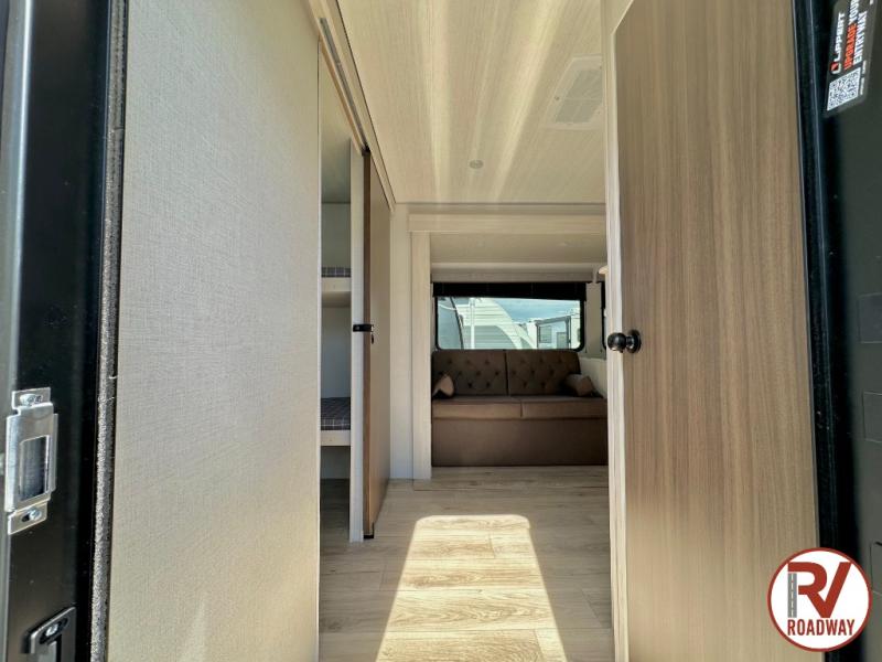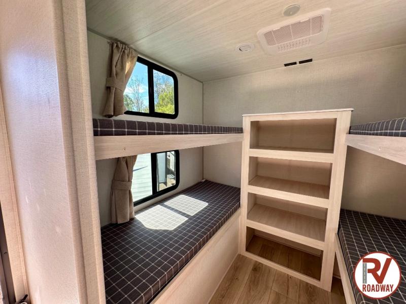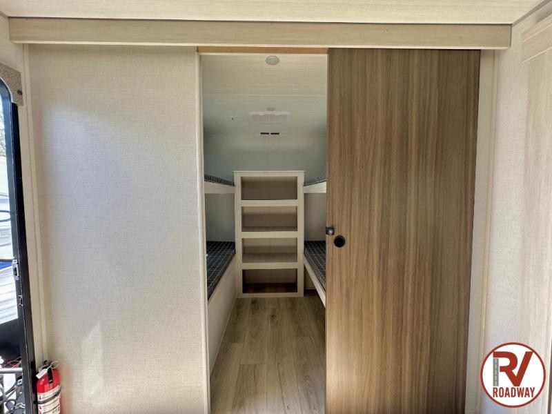 Head to your favorite camping spot with your favorite people in this spacious, dual entry travel trailer! The large slide out houses the booth dinette and sofa where you can relax in the evenings and even let guests sleep over who haven't claimed the quad bunks in the rear bunkhouse. A walk-thru bath is convenient for all, and the full kitchen lets you whip up your best meals in the microwave with an air fryer. And a walk-in pantry with washer and dryer prep makes it easier to go full-time if you choose! When it's time to call it a night, the front master bedroom with a queen bed will provide you with your own space to retreat to, and there are dual bedside wardrobes to keep your clothes organized.