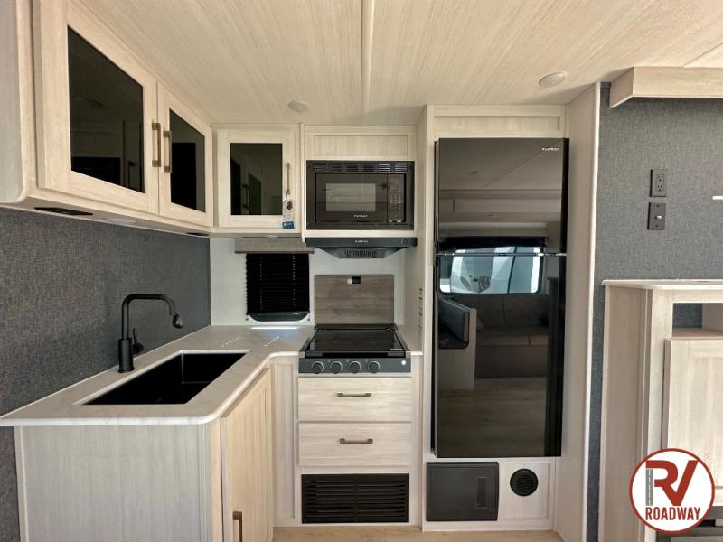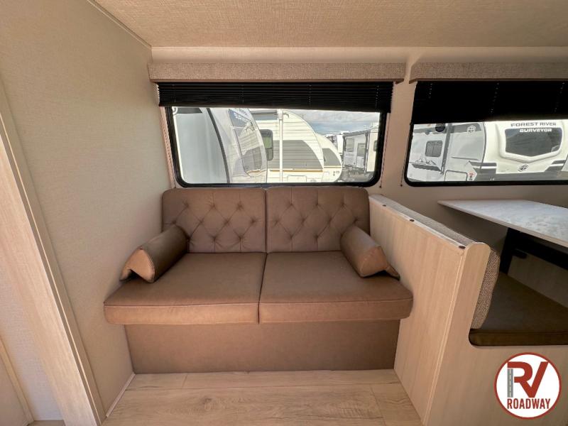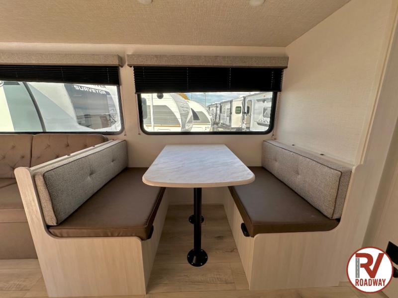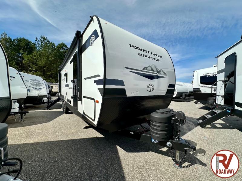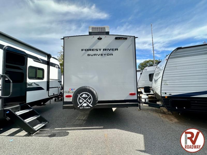 Value and versatility go hand-in-hand with the Surveyor Camp Series travel trailers by Forest River. The solid construction includes a 2" aluminum framed floor with block foam insulation and a sealed underbelly with forced heat and radiant foil insulation. A 100-watt roof mounted solar panel will provide some off-grid power, and the power tongue jack will let you easily hitch up and go whenever you're ready. Additional stand-out features include Surf(X) seamless countertops throughout, two A/C units, an electric awning with LED light strip, black glass friction hinge entry door(s), and so much more!