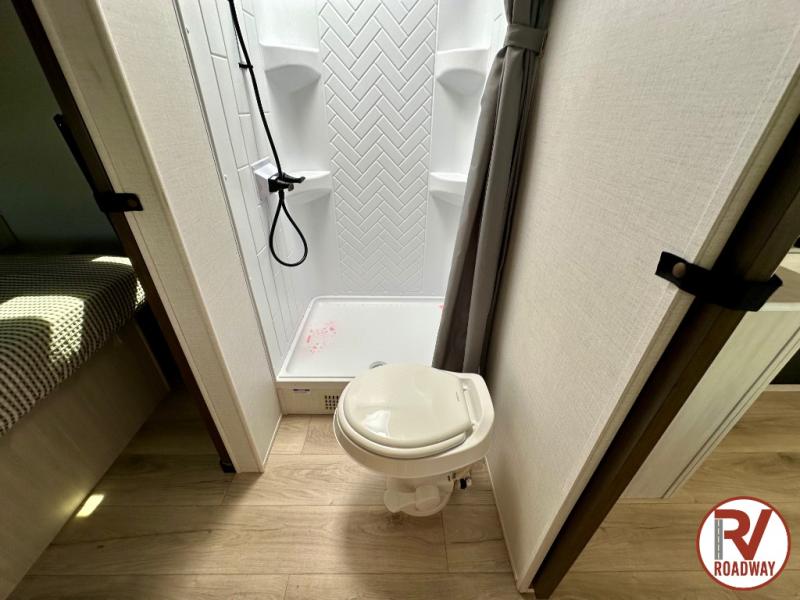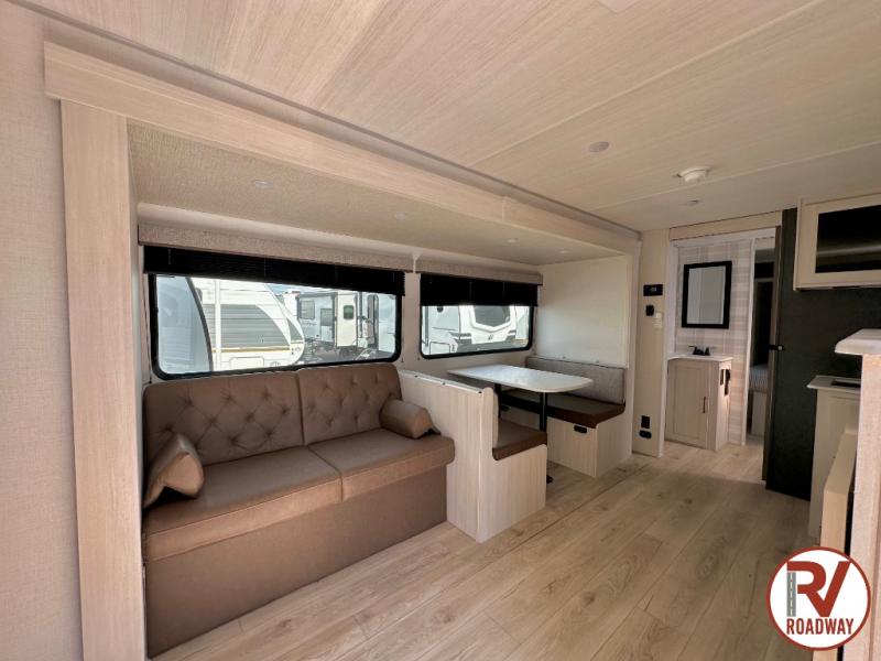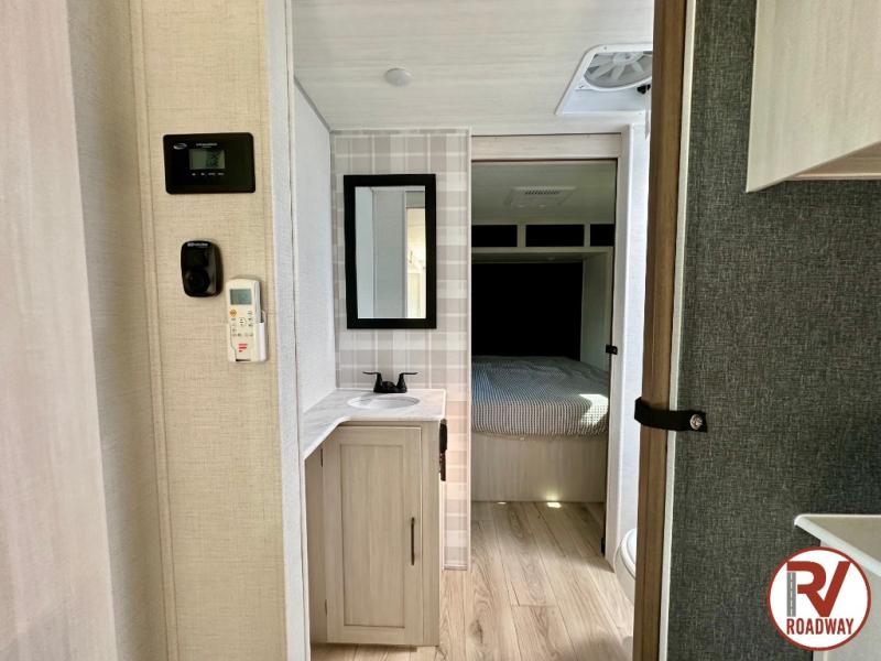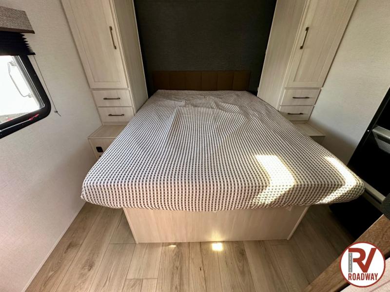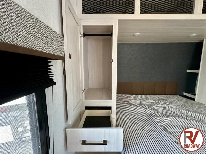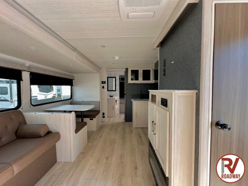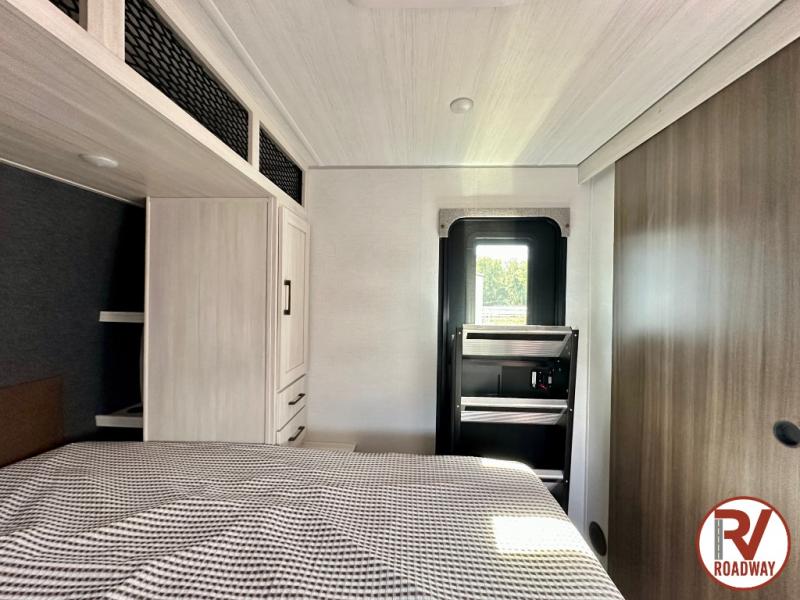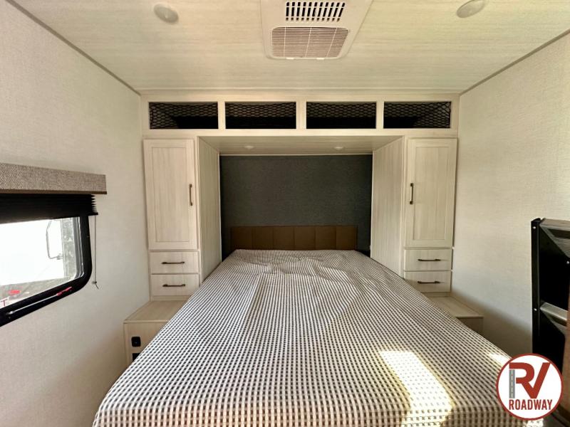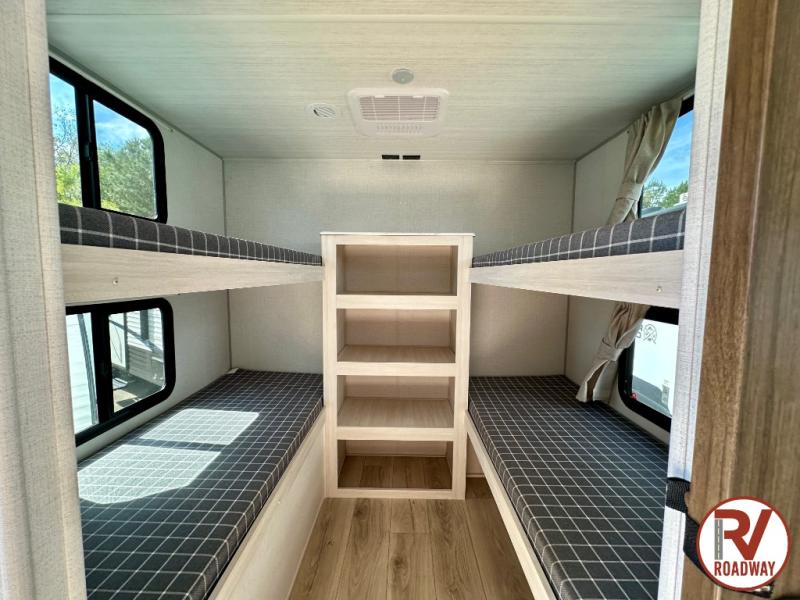 Head to your favorite camping spot with your favorite people in this spacious, dual entry travel trailer! The large slide out houses the booth dinette and sofa where you can relax in the evenings and even let guests sleep over who haven't claimed the quad bunks in the rear bunkhouse. A walk-thru bath is convenient for all, and the full kitchen lets you whip up your best meals in the microwave with an air fryer. And a walk-in pantry with washer and dryer prep makes it easier to go full-time if you choose! When it's time to call it a night, the front master bedroom with a queen bed will provide you with your own space to retreat to, and there are dual bedside wardrobes to keep your clothes organized.