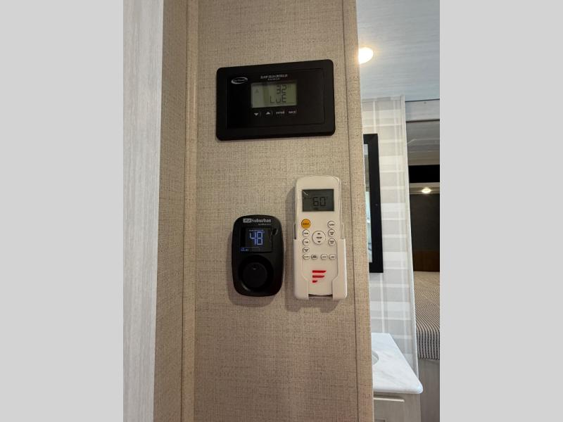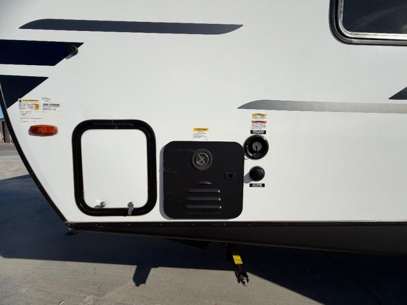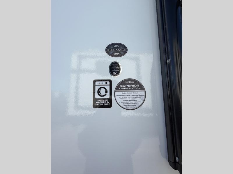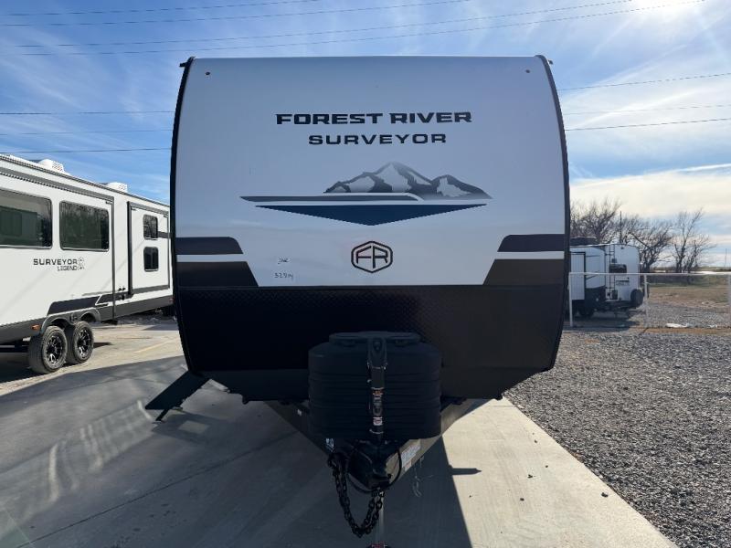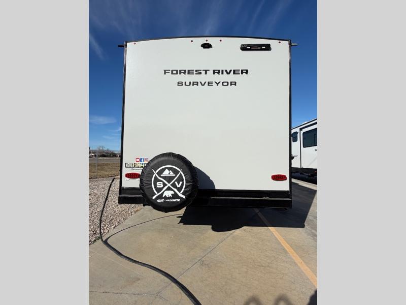 Value and versatility go hand-in-hand with the Surveyor Camp Series travel trailers by Forest River. The solid construction includes a 2" aluminum framed floor with block foam insulation and a sealed underbelly with forced heat and radiant foil insulation. A 100-watt roof mounted solar panel will provide some off-grid power, and the power tongue jack will let you easily hitch up and go whenever you're ready. Additional stand-out features include Surf(X) seamless countertops throughout, two A/C units, an electric awning with LED light strip, black glass friction hinge entry door(s), and so much more!