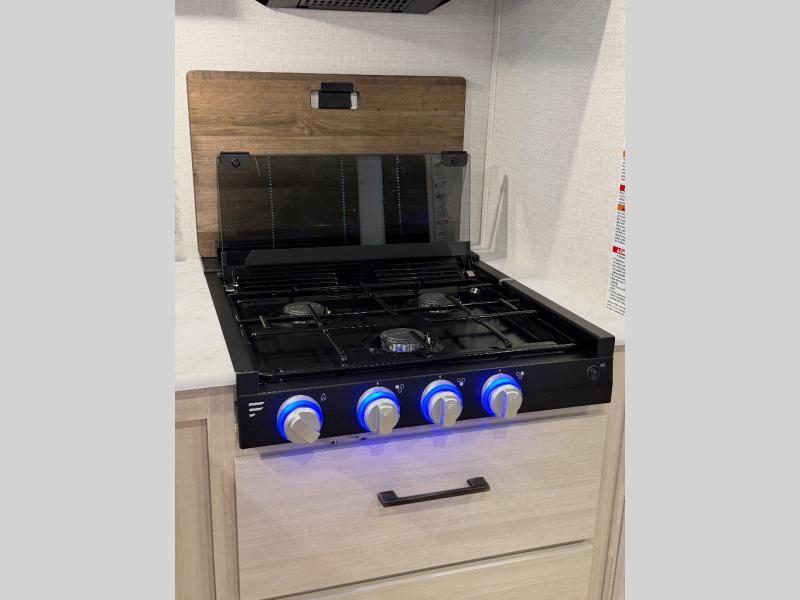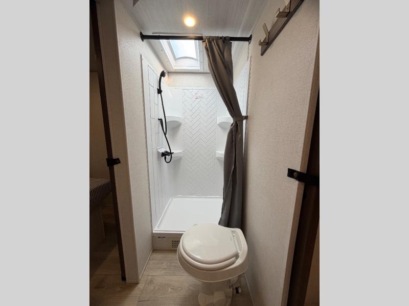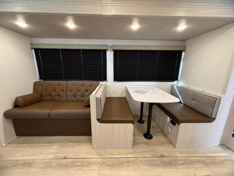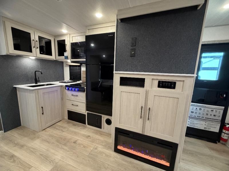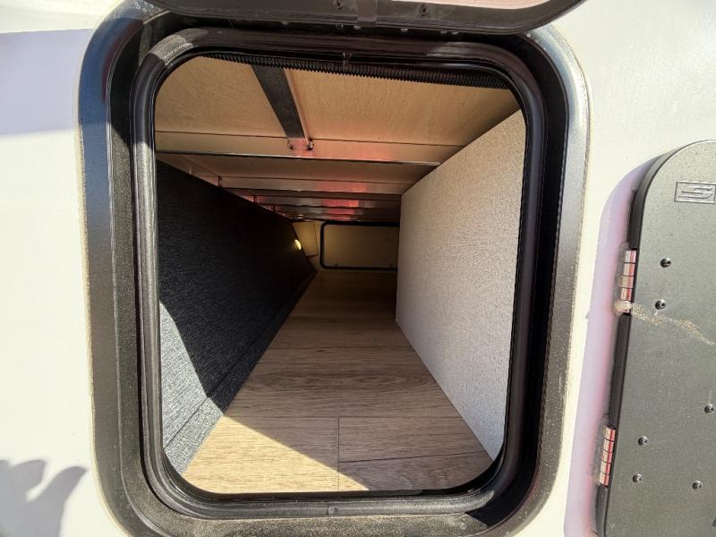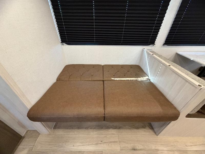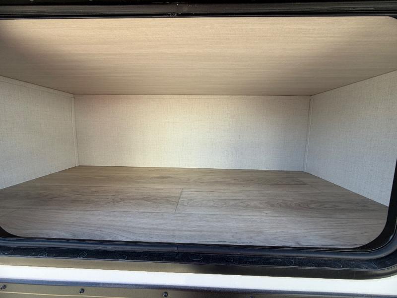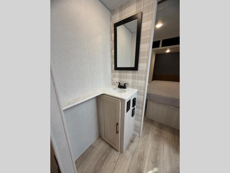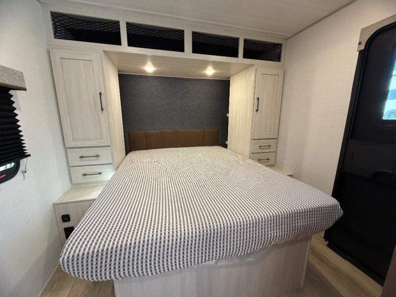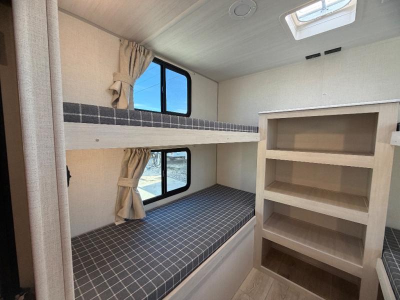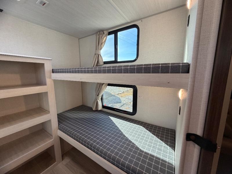 Head to your favorite camping spot with your favorite people in this spacious, dual entry travel trailer! The large slide out houses the booth dinette and sofa where you can relax in the evenings and even let guests sleep over who haven't claimed the quad bunks in the rear bunkhouse. A walk-thru bath is convenient for all, and the full kitchen lets you whip up your best meals in the microwave with an air fryer. And a walk-in pantry with washer and dryer prep makes it easier to go full-time if you choose! When it's time to call it a night, the front master bedroom with a queen bed will provide you with your own space to retreat to, and there are dual bedside wardrobes to keep your clothes organized.