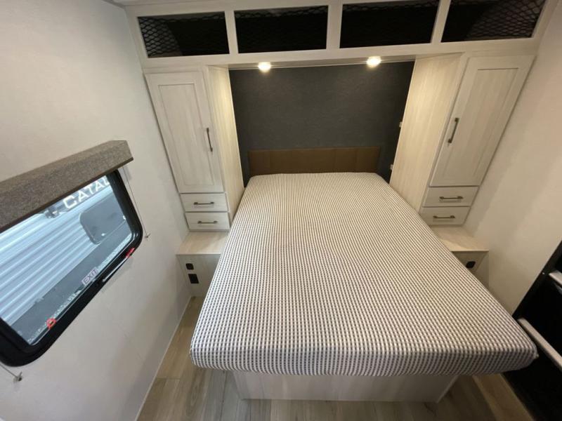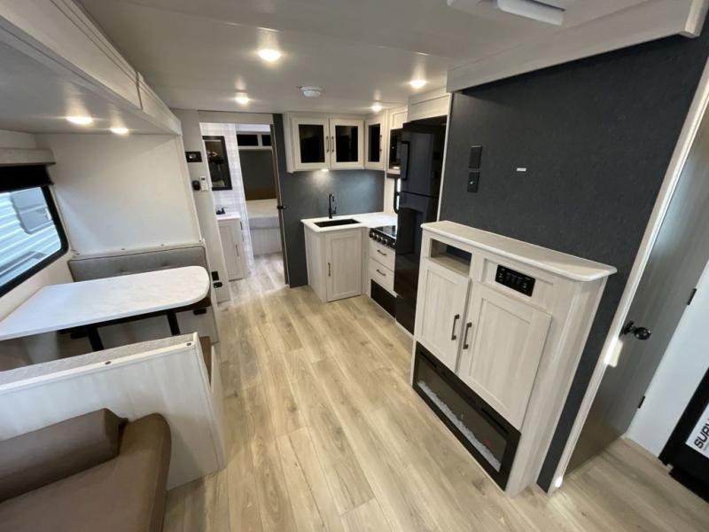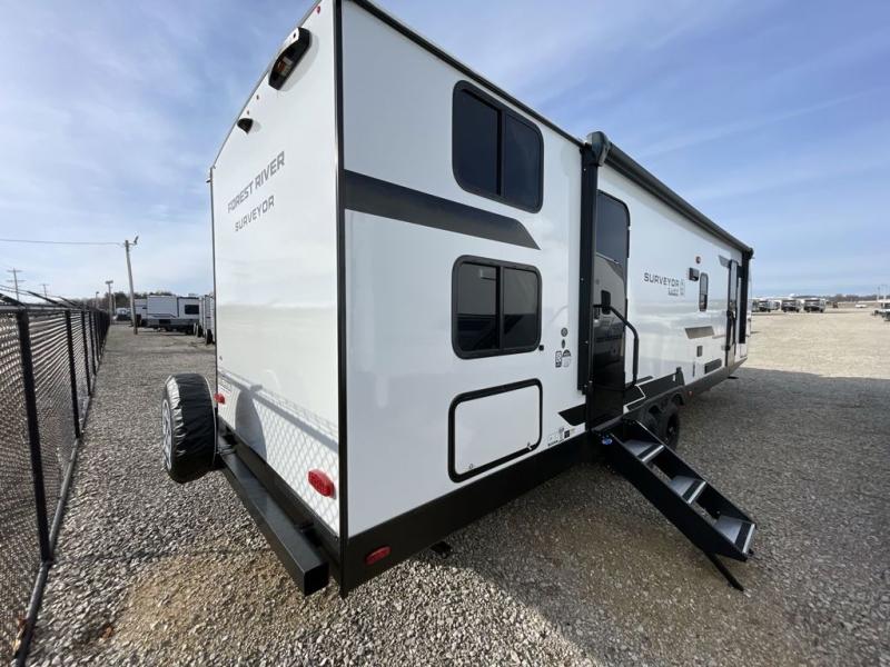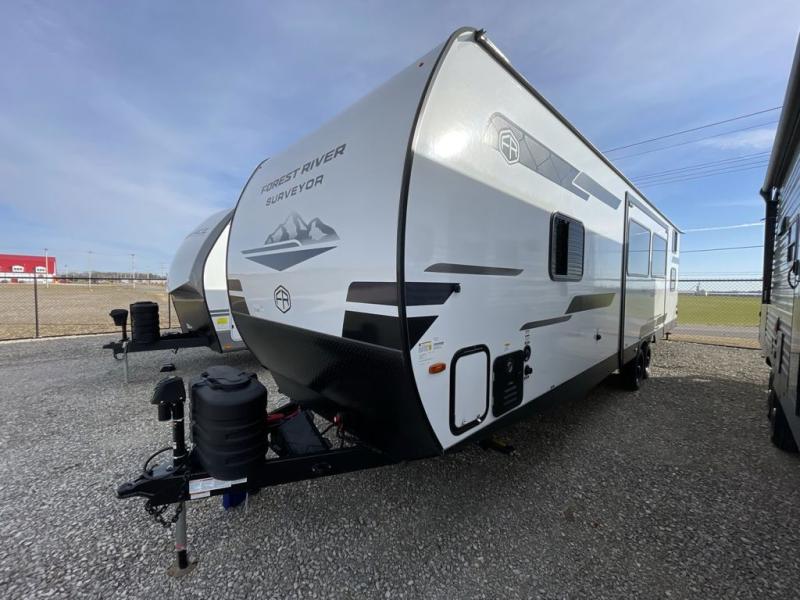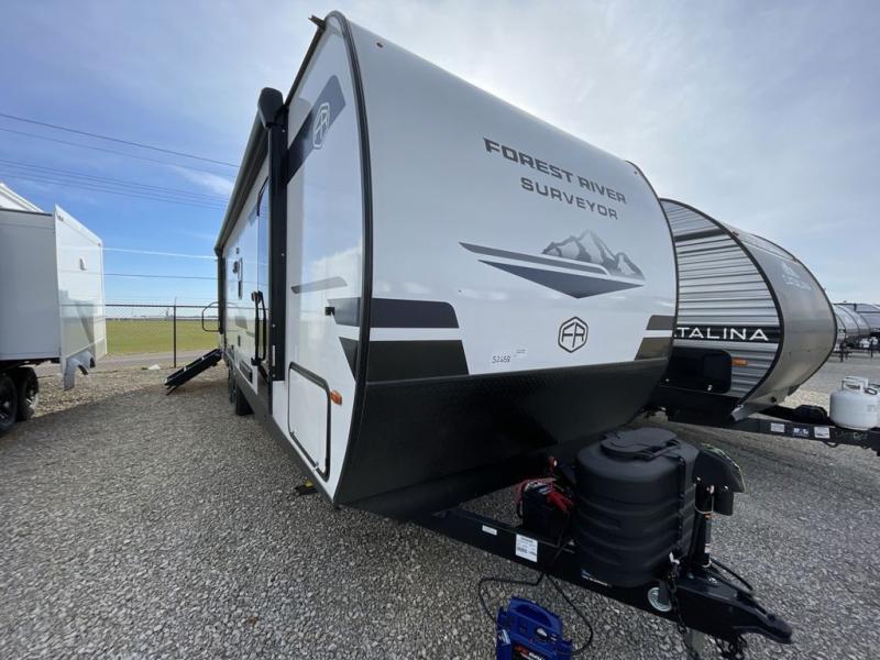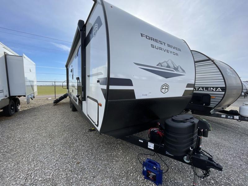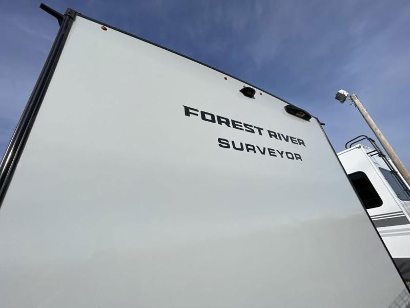 Value and versatility go hand-in-hand with the Surveyor Camp Series travel trailers by Forest River. The solid construction includes a 2" aluminum framed floor with block foam insulation and a sealed underbelly with forced heat and radiant foil insulation. A 100-watt roof mounted solar panel will provide some off-grid power, and the power tongue jack will let you easily hitch up and go whenever you're ready. Additional stand-out features include Surf(X) seamless countertops throughout, two A/C units, an electric awning with LED light strip, black glass friction hinge entry door(s), and so much more!