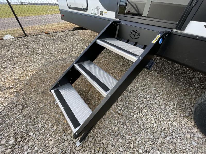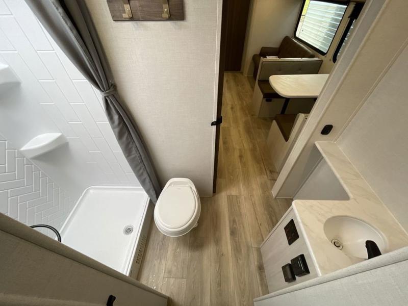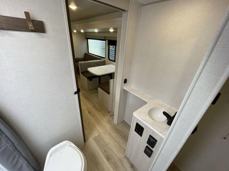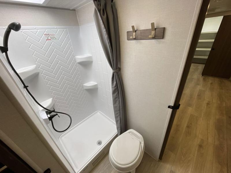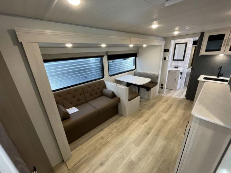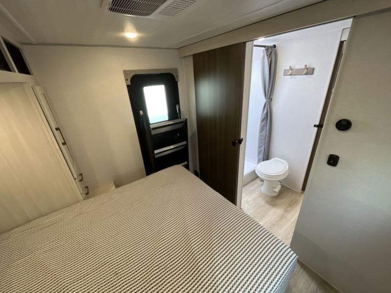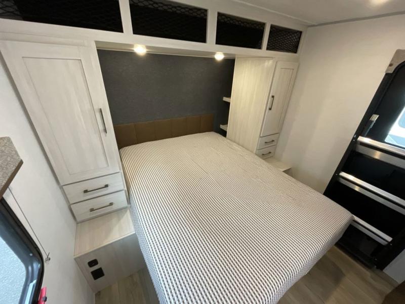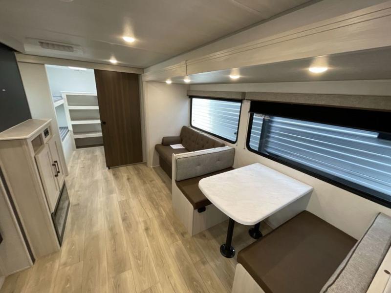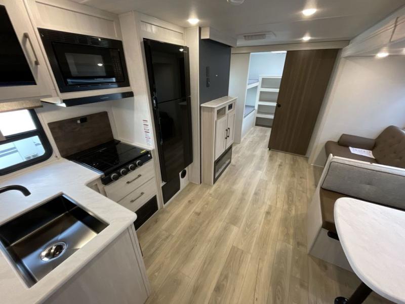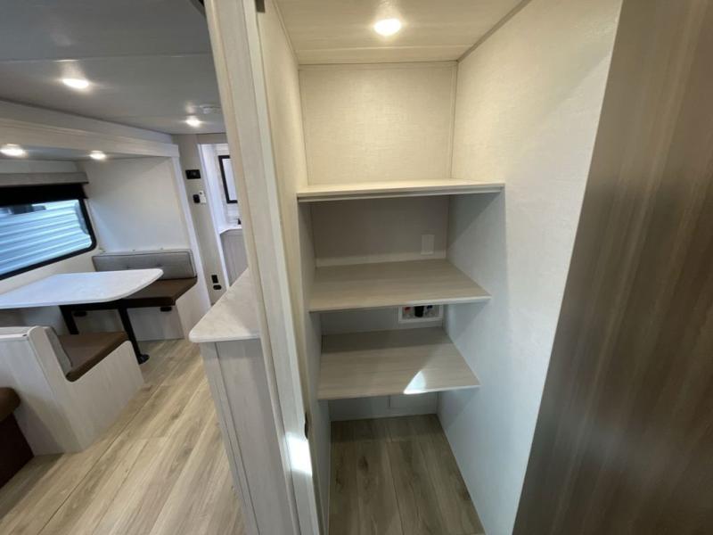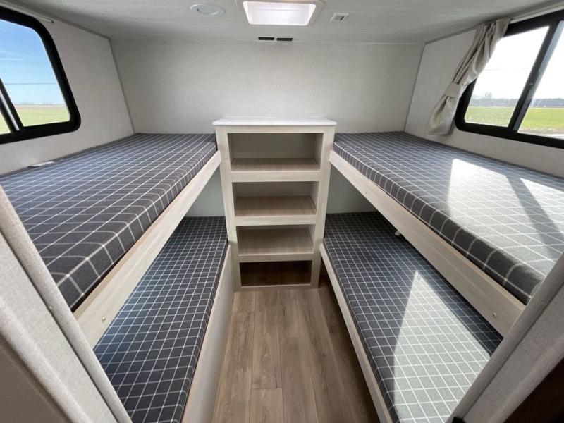 Head to your favorite camping spot with your favorite people in this spacious, dual entry travel trailer! The large slide out houses the booth dinette and sofa where you can relax in the evenings and even let guests sleep over who haven't claimed the quad bunks in the rear bunkhouse. A walk-thru bath is convenient for all, and the full kitchen lets you whip up your best meals in the microwave with an air fryer. And a walk-in pantry with washer and dryer prep makes it easier to go full-time if you choose! When it's time to call it a night, the front master bedroom with a queen bed will provide you with your own space to retreat to, and there are dual bedside wardrobes to keep your clothes organized.