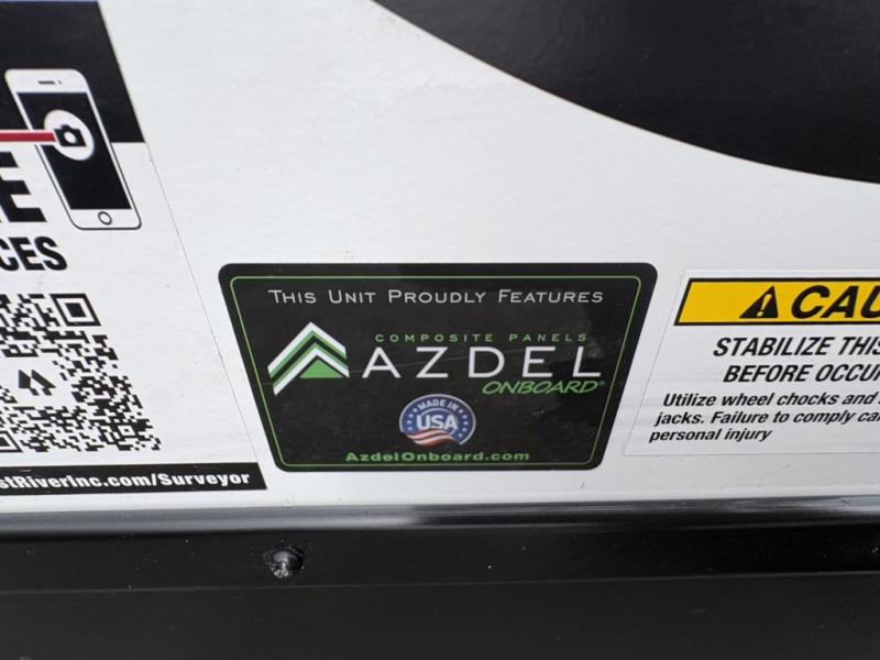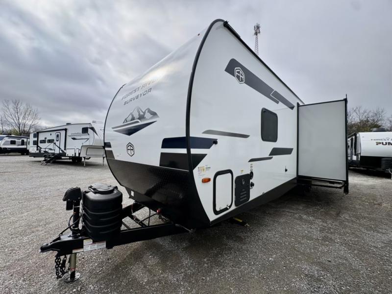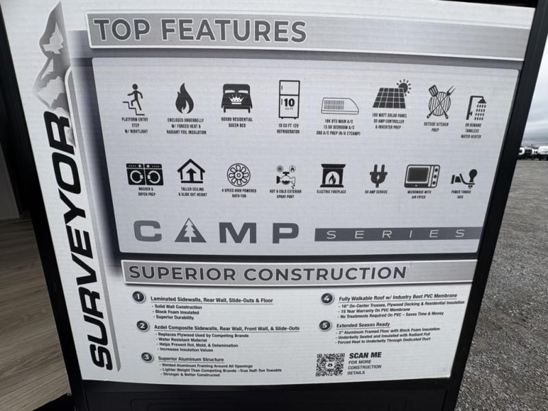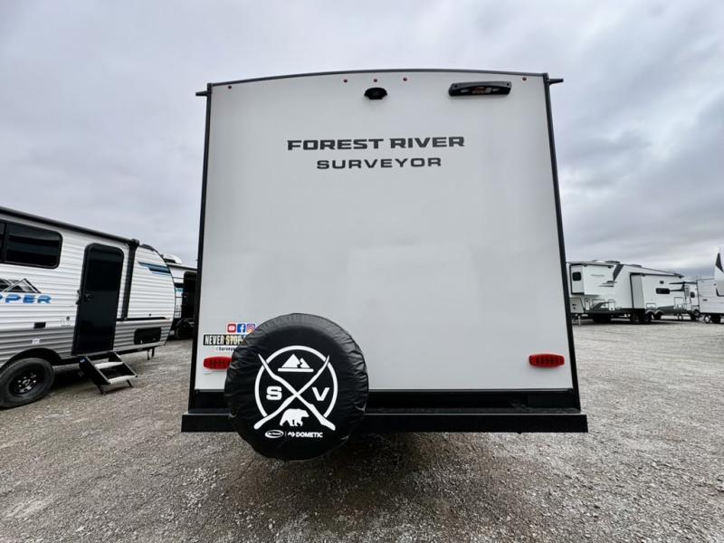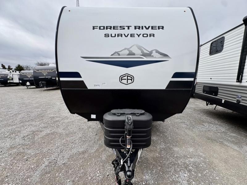 Value and versatility go hand-in-hand with the Surveyor Camp Series travel trailers by Forest River. The solid construction includes a 2" aluminum framed floor with block foam insulation and a sealed underbelly with forced heat and radiant foil insulation. A 100-watt roof mounted solar panel will provide some off-grid power, and the power tongue jack will let you easily hitch up and go whenever you're ready. Additional stand-out features include Surf(X) seamless countertops throughout, two A/C units, an electric awning with LED light strip, black glass friction hinge entry door(s), and so much more!