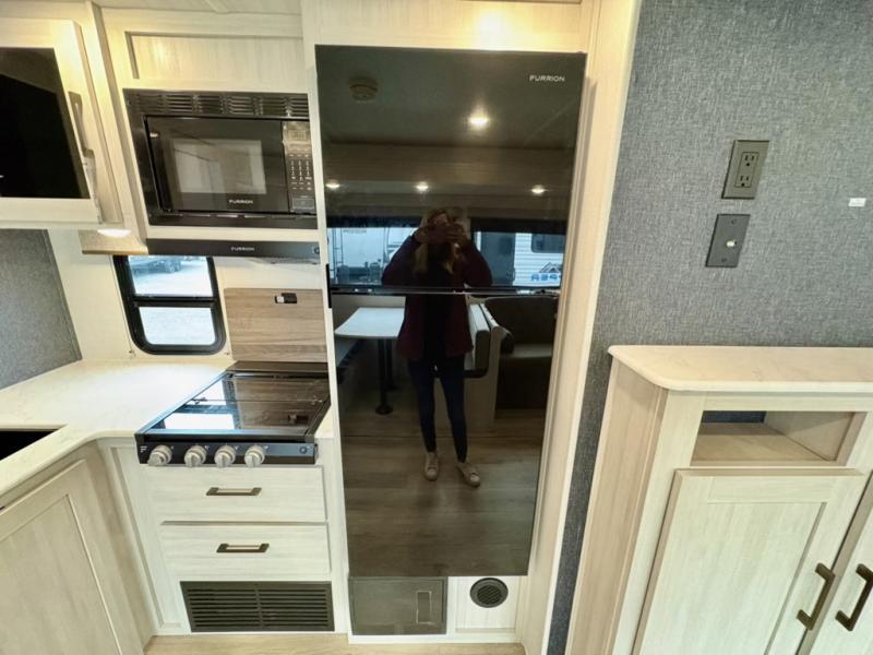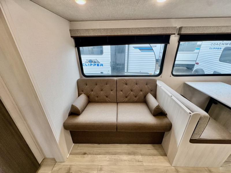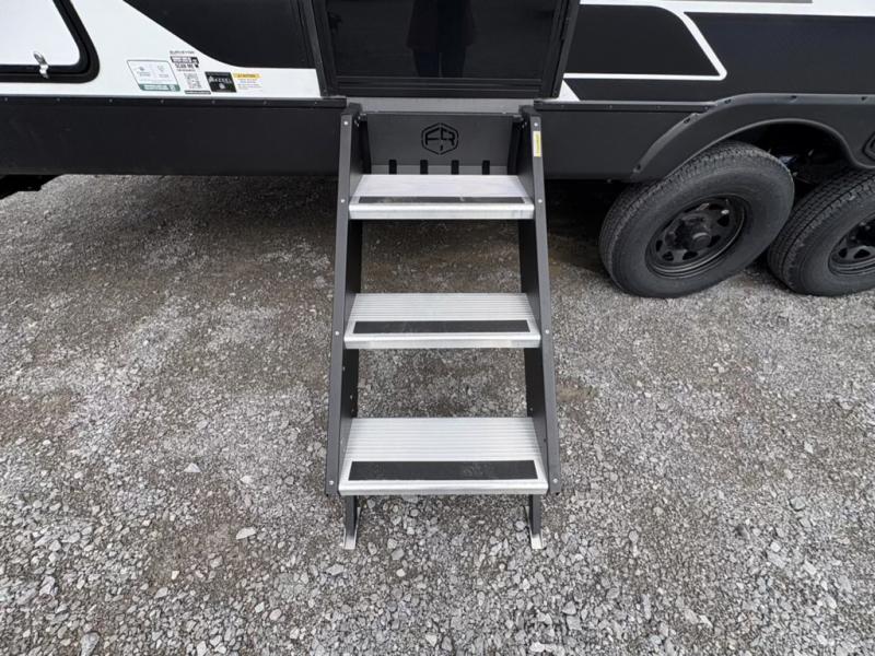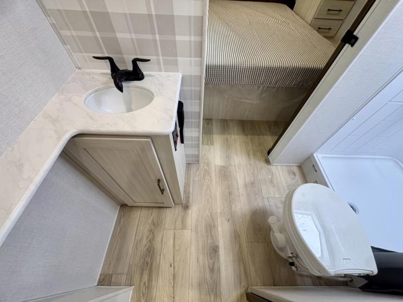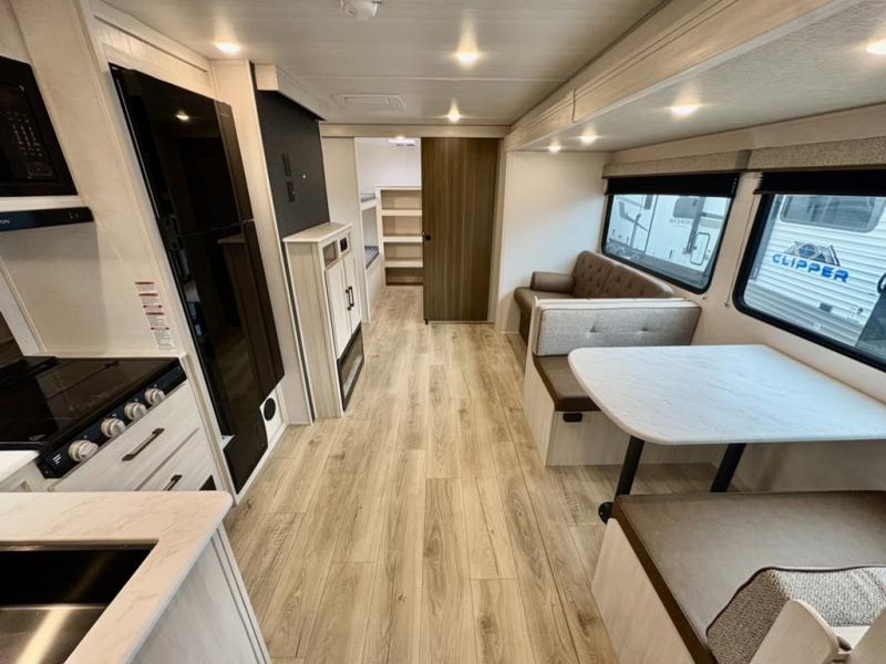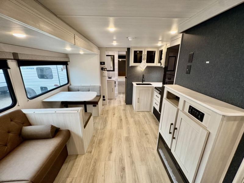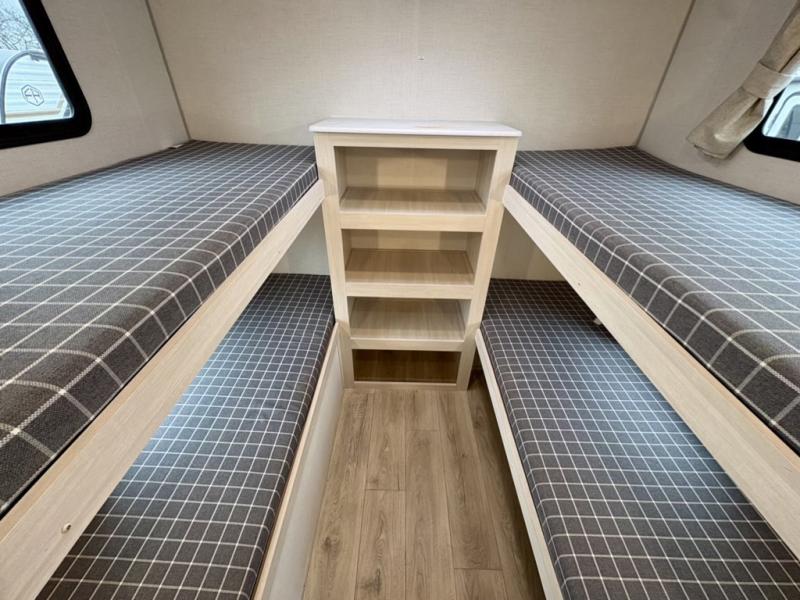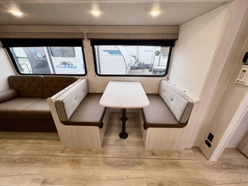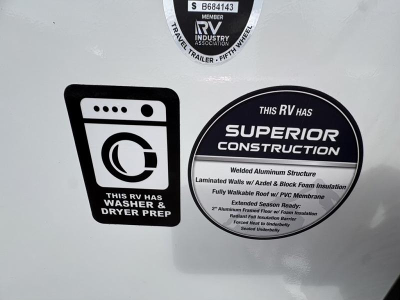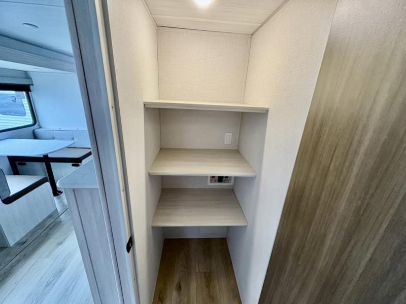 Head to your favorite camping spot with your favorite people in this spacious, dual entry travel trailer! The large slide out houses the booth dinette and sofa where you can relax in the evenings and even let guests sleep over who haven't claimed the quad bunks in the rear bunkhouse. A walk-thru bath is convenient for all, and the full kitchen lets you whip up your best meals in the microwave with an air fryer. And a walk-in pantry with washer and dryer prep makes it easier to go full-time if you choose! When it's time to call it a night, the front master bedroom with a queen bed will provide you with your own space to retreat to, and there are dual bedside wardrobes to keep your clothes organized.