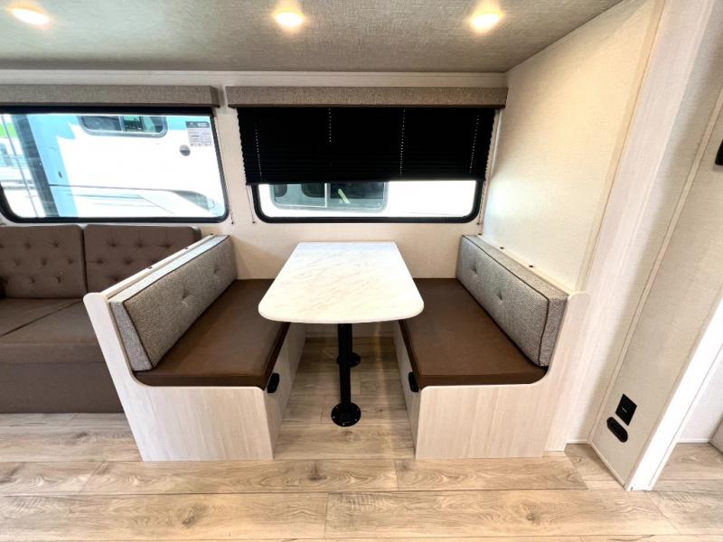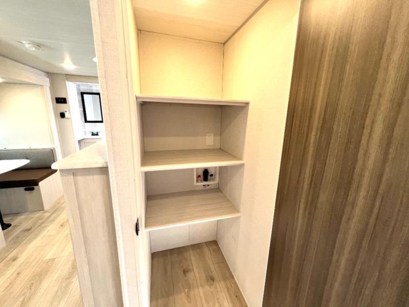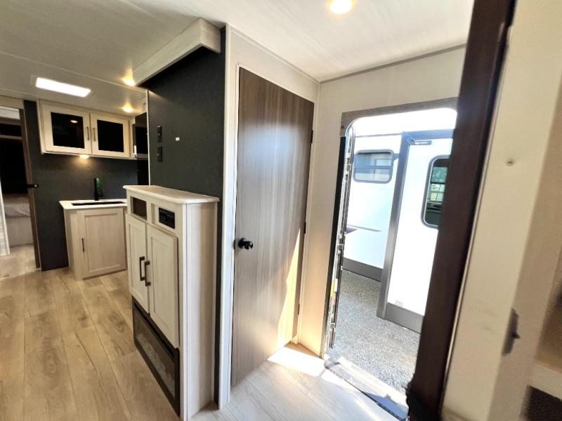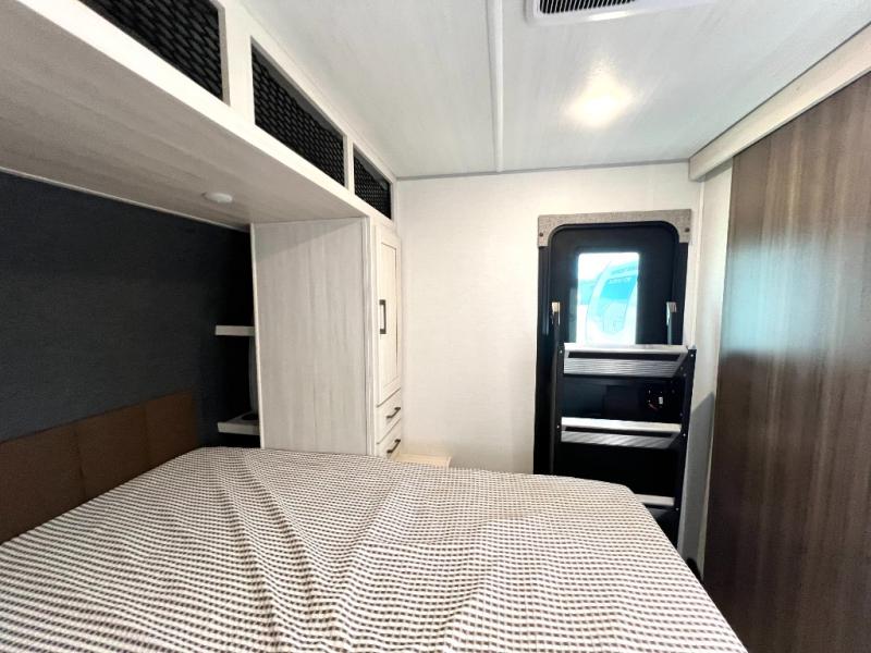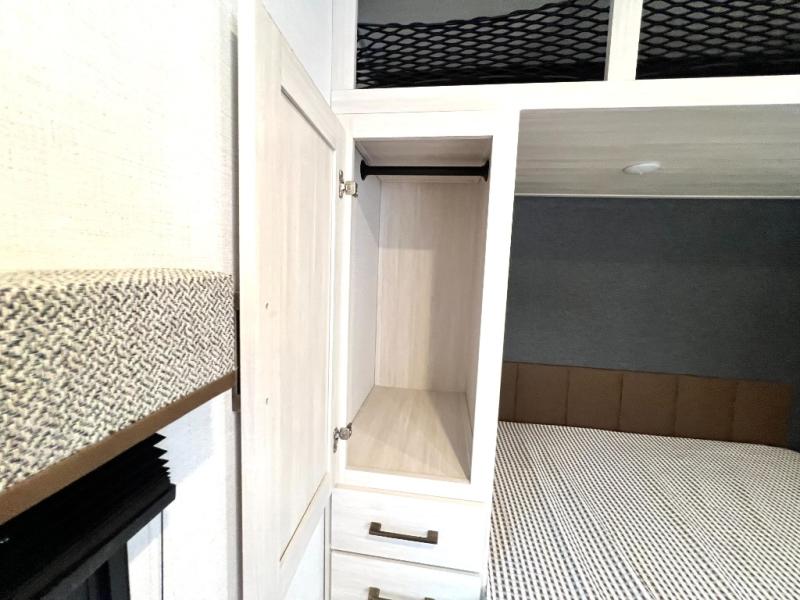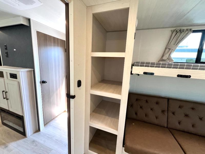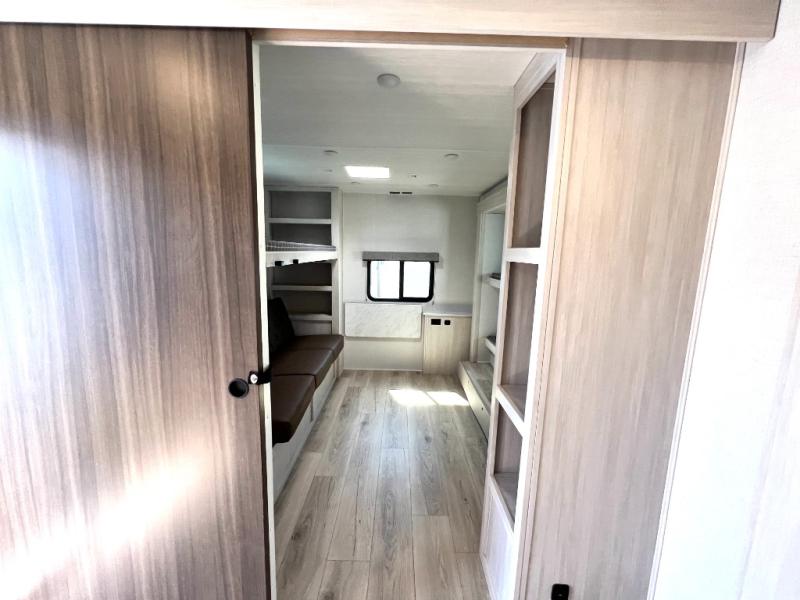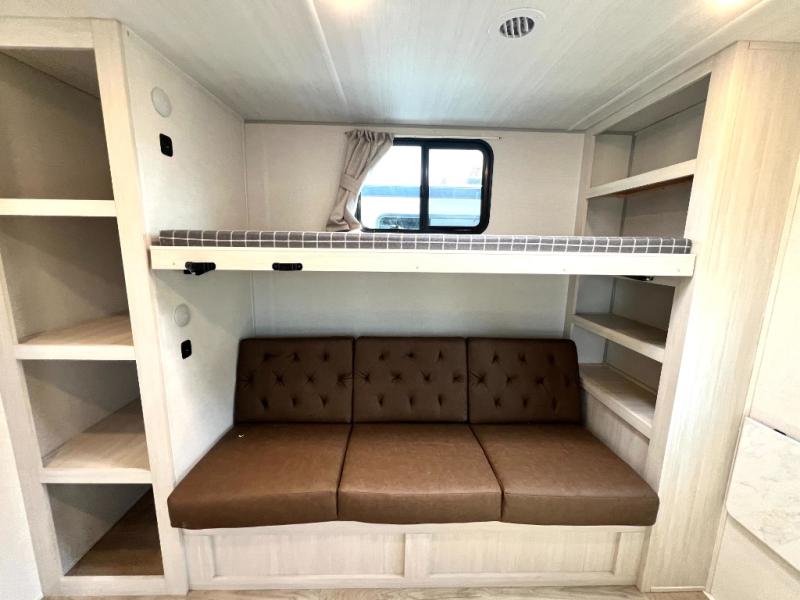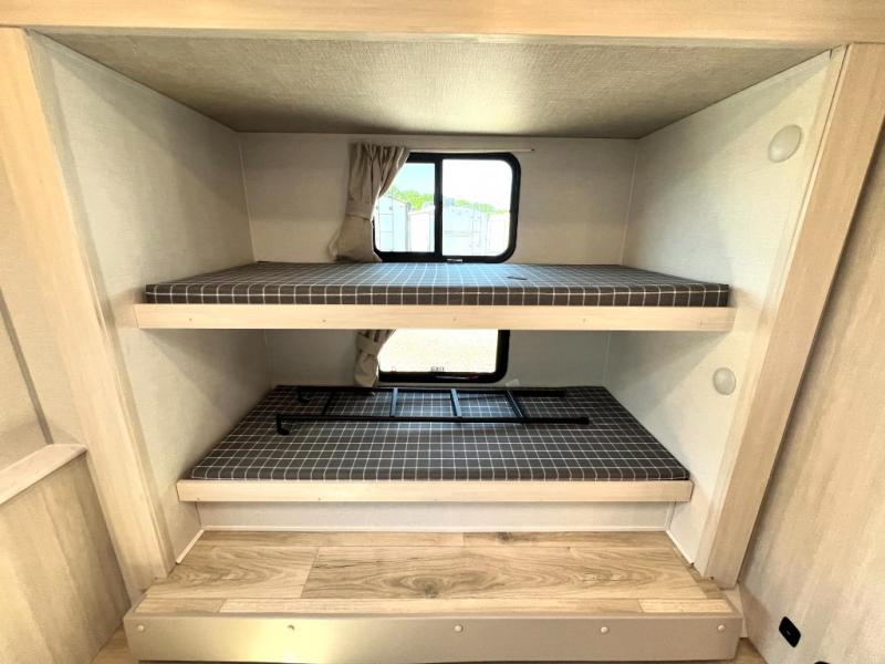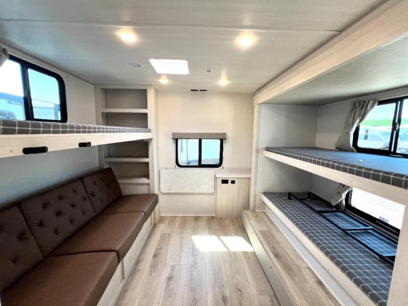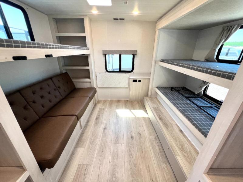 Head to your favorite camping spot with your favorite people in this spacious, dual entry travel trailer! The large slide out houses the booth dinette and sofa where you can relax in the evenings and even let guests sleep over who haven't claimed the triple bunks in the rear bunkhouse. There is also a bunkhouse sofa, two wardrobes, cubbies, and a flip-up desk if you need a space to work. A walk-thru bath is convenient for all, and the full kitchen lets you whip up your best meals in the microwave with an air fryer. There is also a walk-in pantry with washer and dryer prep if you choose to add those appliances. When it's time to call it a night, the front master bedroom with a queen bed will provide you with your own space to retreat to, and there are dual bedside wardrobes to keep your clothes organized.