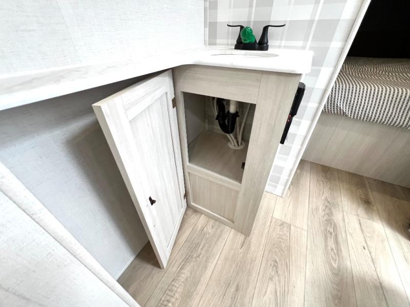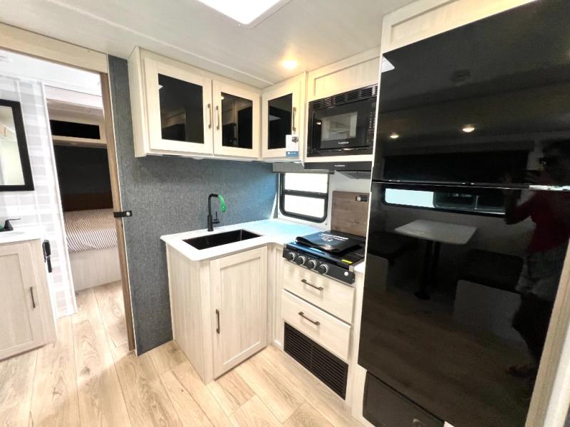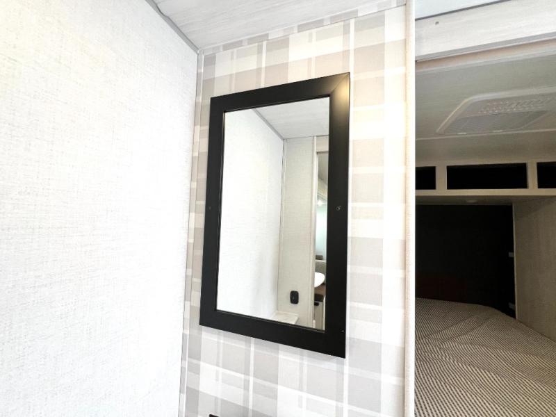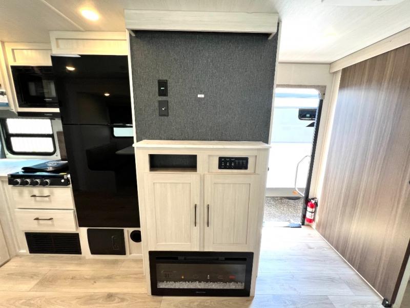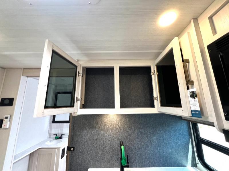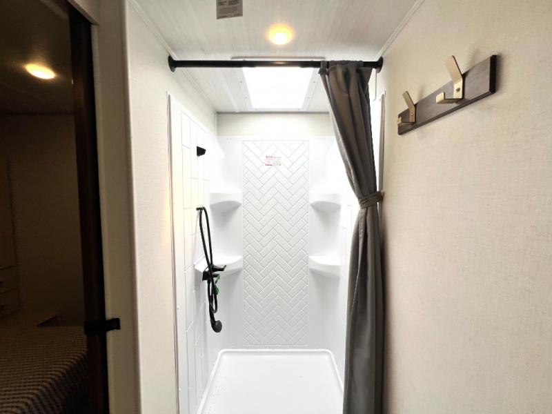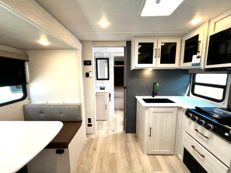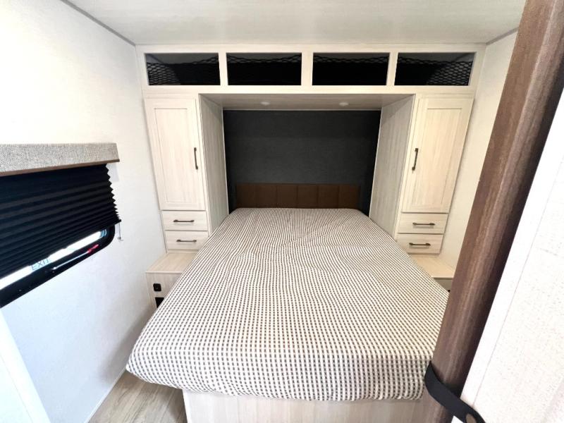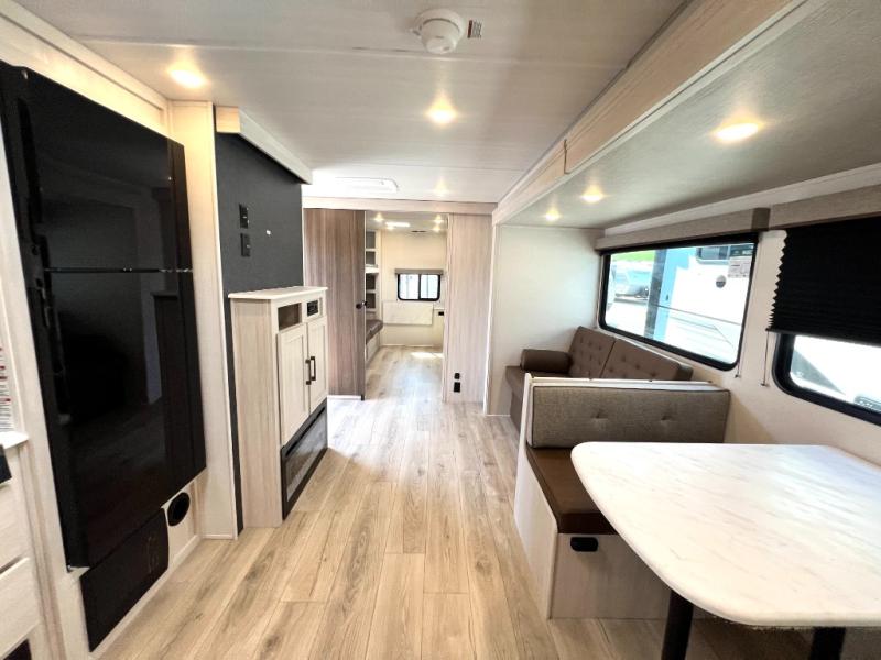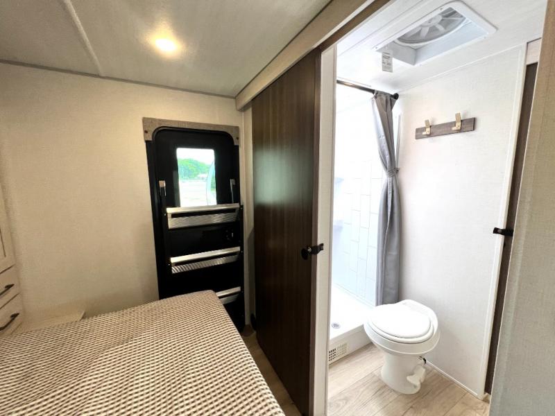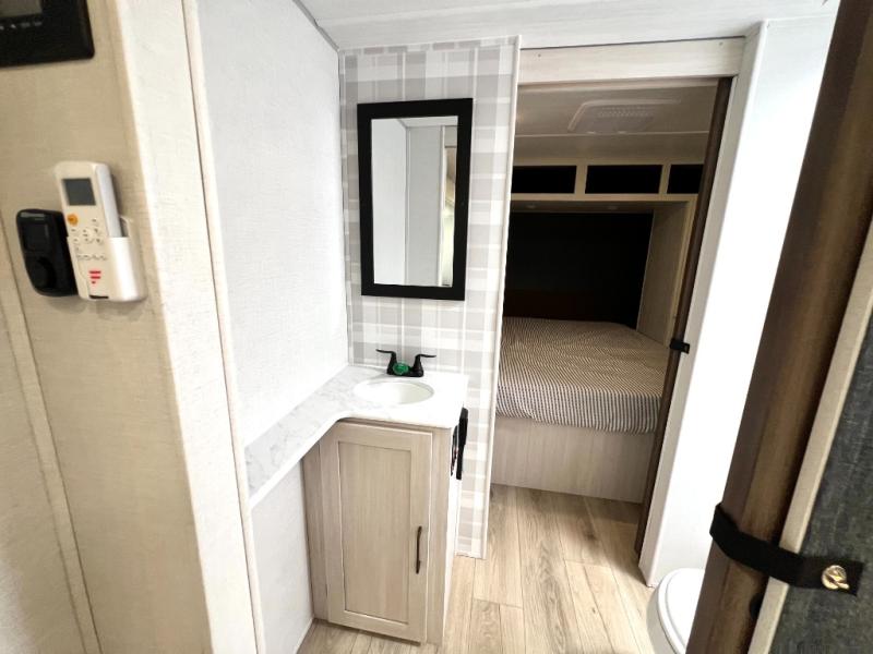 Head to your favorite camping spot with your favorite people in this spacious, dual entry travel trailer! The large slide out houses the booth dinette and sofa where you can relax in the evenings and even let guests sleep over who haven't claimed the triple bunks in the rear bunkhouse. There is also a bunkhouse sofa, two wardrobes, cubbies, and a flip-up desk if you need a space to work. A walk-thru bath is convenient for all, and the full kitchen lets you whip up your best meals in the microwave with an air fryer. There is also a walk-in pantry with washer and dryer prep if you choose to add those appliances. When it's time to call it a night, the front master bedroom with a queen bed will provide you with your own space to retreat to, and there are dual bedside wardrobes to keep your clothes organized.